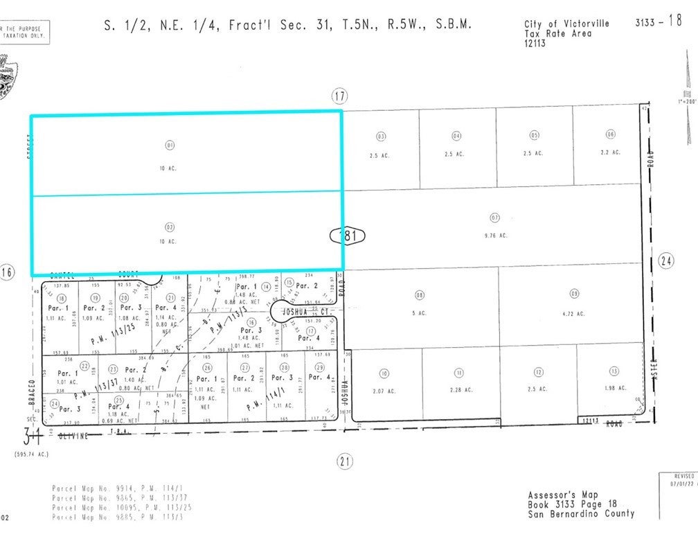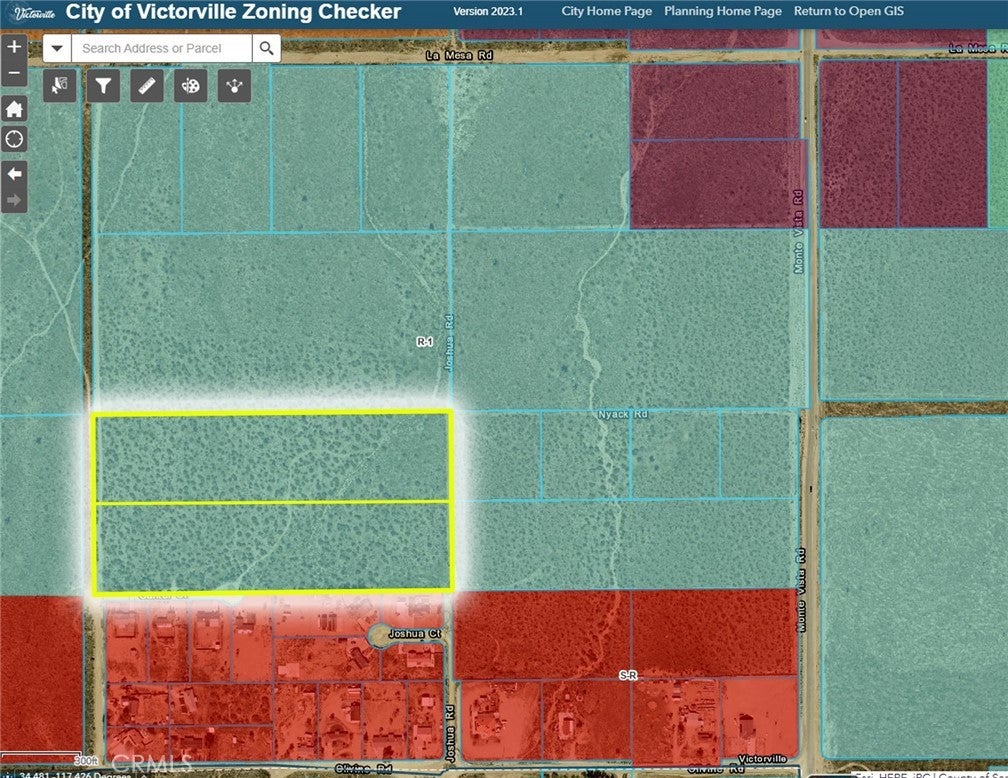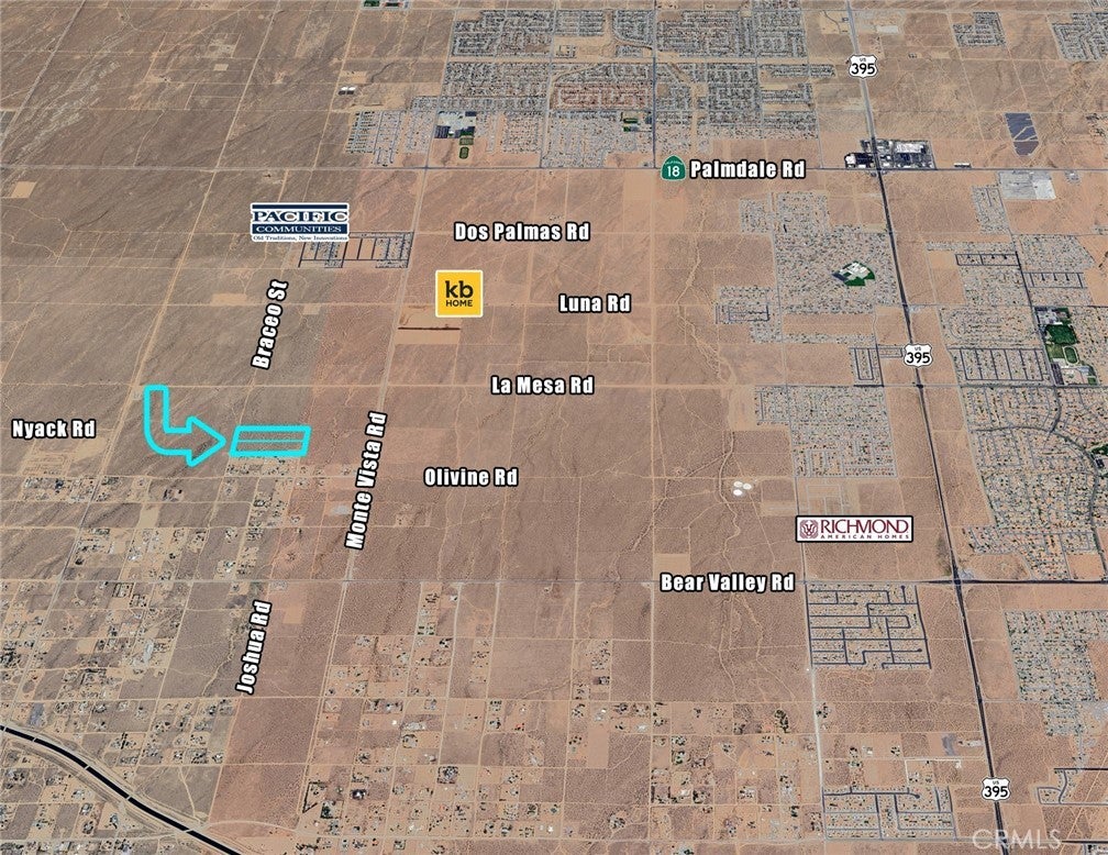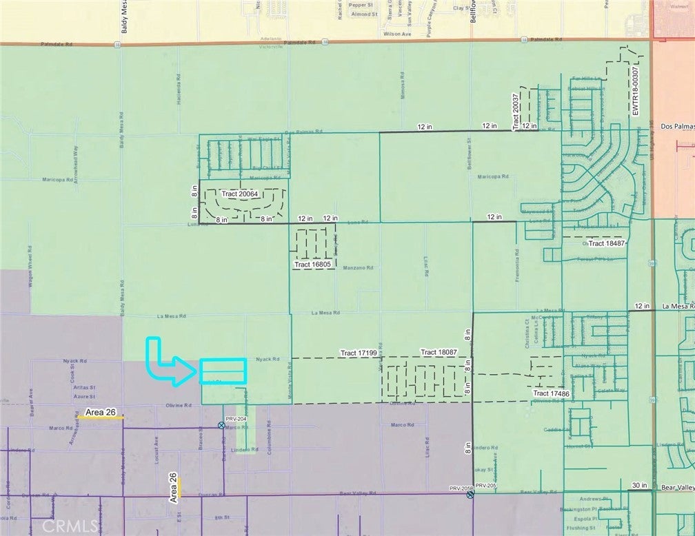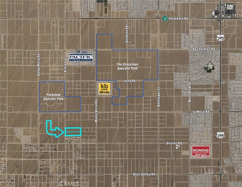 20 ac R-1 Land in the Path of Development. In this area of West Victorville, KB Home has broke ground on a 40 ac Tract (135 lots) at Monte Vista Rd & Luna Rd, Pacific Communities has almost completed their Model Homes and is currently constructing about 17 additional homes at Monte Vista Rd and Dos Palmas Rd (185 lots), and Richmond American has broke ground at Olivine & Mesa View (122 lots). Current projects are the first movement seen since 2008 in this area. Multiple projects also working on Tentative Maps. All great signs pointing towards the development of this area. The subject property. Parkview Specific Plan (owned by the Lewis Group), is located directed North and has plans for 715 homes, a 10 ac park, an 11 ac commercial center and a 12 ac school site. Snowline School District owns an adjacent 10 ac. Great opportunity to acquire land in West Victorville before development eventually takes off.