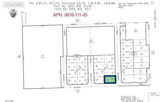 Residential Lot, 0.19 Acres (APN: 0616-111-05) GPS: 34.13181, -116.077505This residential lot is located in Twentynine Palms, CA. Twentynine Palms has zoned this property Residential (RS-4). The city has zoned the property for single family homes, with a maximum of 4 units per acre. Imagine building your desert getaway and waking up to bright desert sunrises, panoramic views of rugged mountains, or dark starry nights. Overhead electricity is on site. The Twentynine Palms Water District services the area and provides water in the street. Residents have septic tanks for their sewer needs. Living in Joshua Tree, CA, offers a unique blend of natural beauty and laid-back desert living. Endless opportunities for outdoor adventures are a short drive away in Joshua Tree National Park. There's always something exciting to explore. Plus, the tight-knit community fosters a sense of belonging, with local shops, art galleries, and events showcasing the area's vibrant culture. Whether you're seeking tranquility or adventure, Joshua Tree welcomes you with open arms. This property does not yet have an address. While the boundary lines on the map offer a glimpse, they are only approximate. A Buyer should verify boundaries, zoning and utilities, ensuring every aspect aligns with their vision for the property.