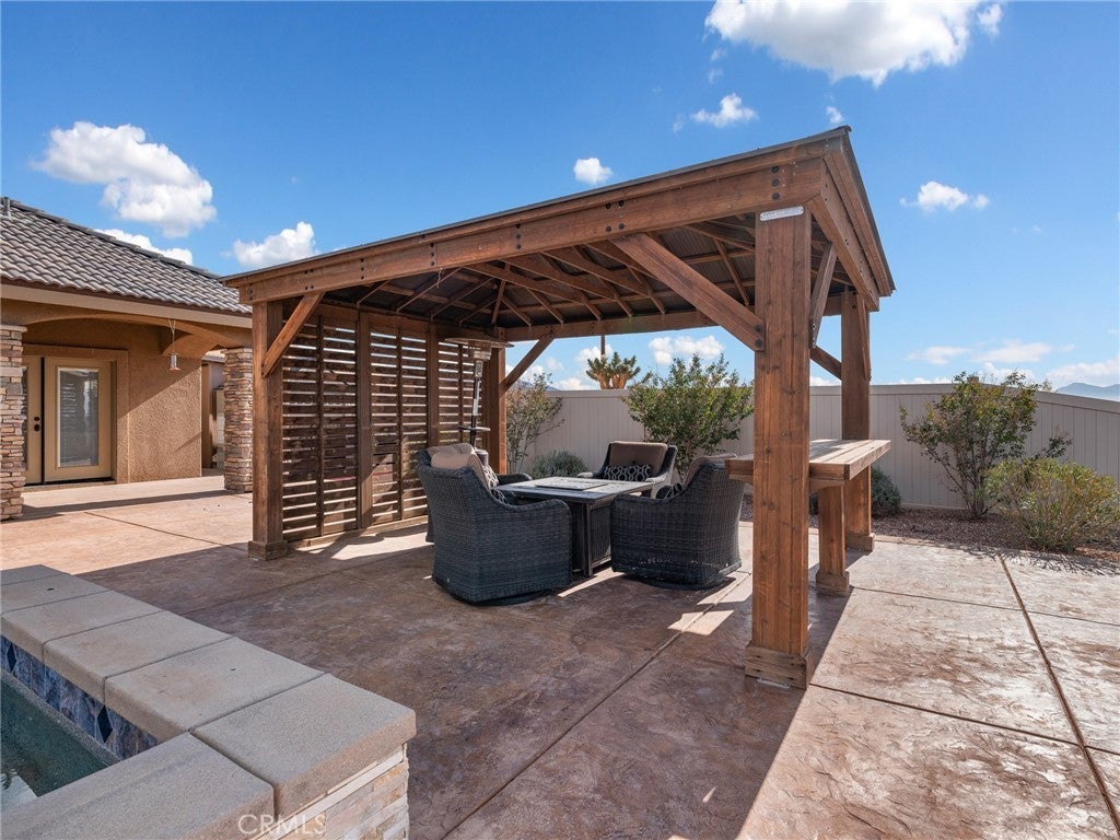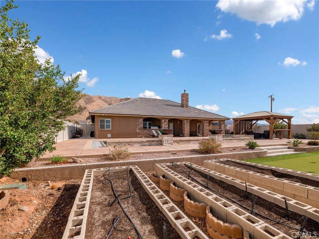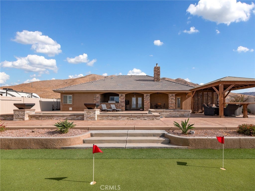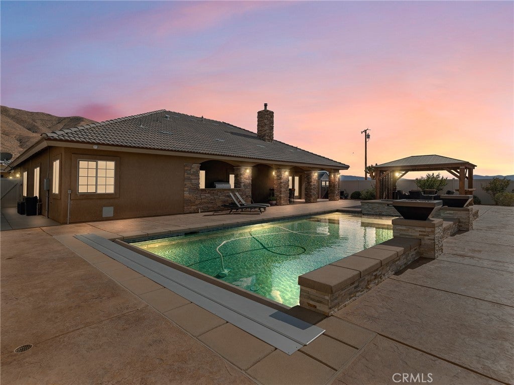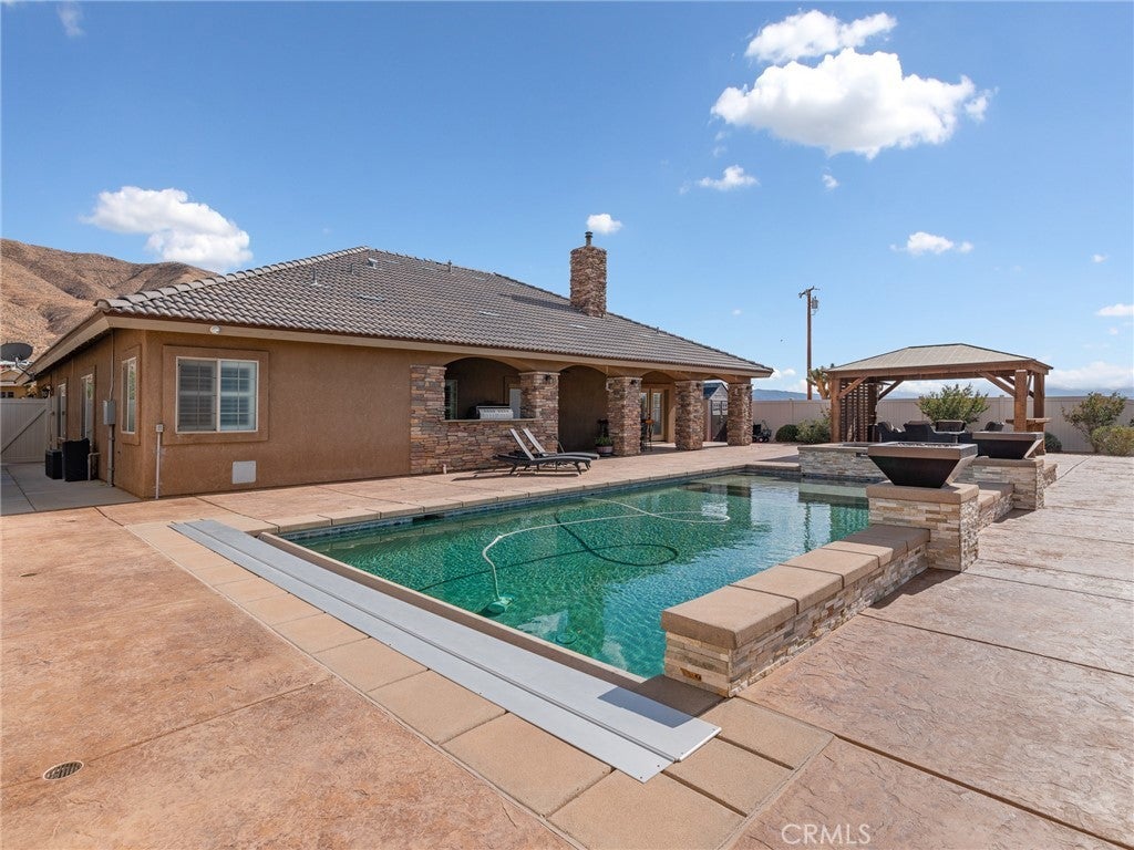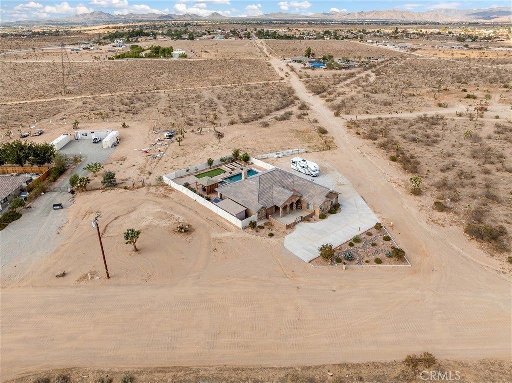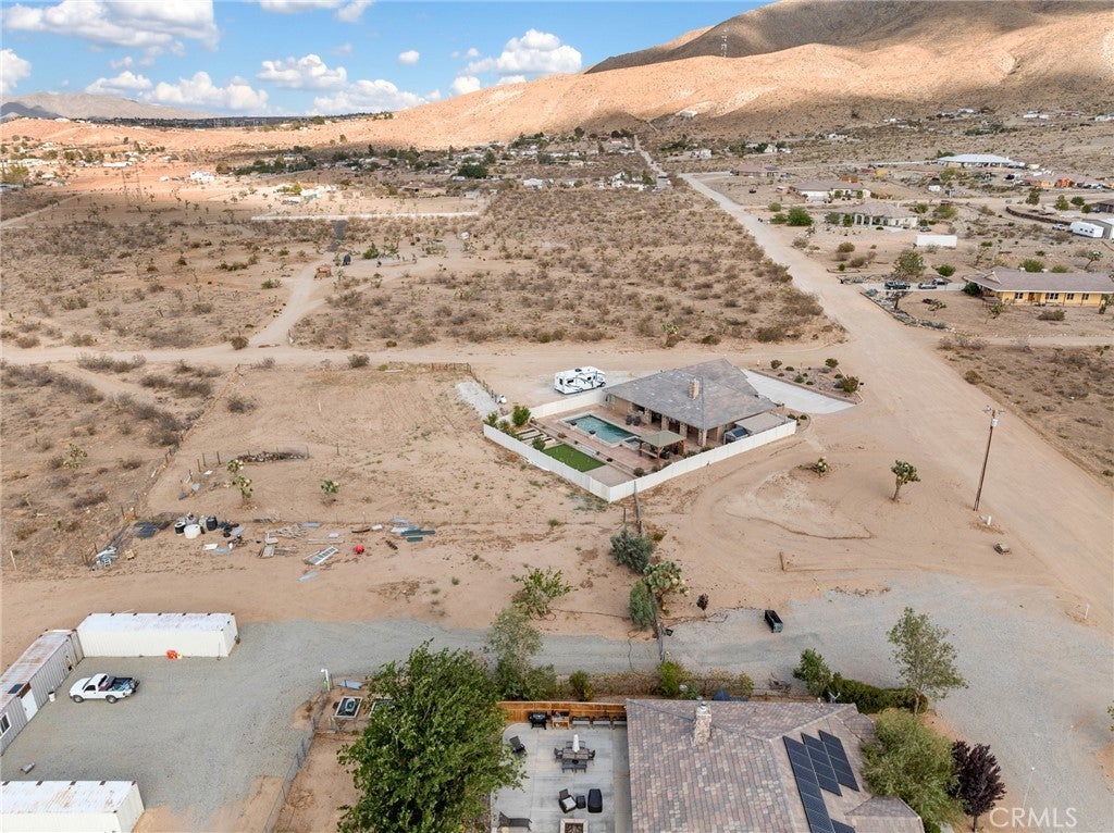 Luxury, Privacy and Stunning Views! Welcome home to this stunning 3-Bedroom, 3-Bath, 2253 SF Desert retreat. A true jewel nestled on a sprawling 2.5-acre lot with breathtaking views along with every amenity you could dream of. This thoughtfully designed home offers DUAL PRIMARY SUITES, each with spa-inspired bathrooms featuring walk-in showers, jetted tubs, and spacious walk-in closets-Ideal for privacy, comfort, or multi-generational living. At the heart of the home is a chef's kitchen designed to impress, complete with high end appliances, expansive countertops, and plenty of storage-a true culinary haven for entertaining or everyday living. The elegance continues throughout with tile flooring, plantation shutters, crown molding with ambient lighting, ceiling fans in every room, and French doors that blend indoor comfort with outdoor living. Step outside to your private resort-style backyard, where luxury and tranquility meet. Custom Pool and Spa with cascading waterfalls, fire bowls, and an automatic pool cover. Outdoor kitchen/BBQ for year-round entertaining, sunset dinners, or enjoying a quiet morning coffee. Pergola-covered patio, putting green for the golf enthusiast, vinyl privacy fencing along with desert friendly landscaping. Gated front courtyard with water feature and beautiful decorative stack stone enhances the entry. Additional features include oversized 2-car garage, RV pad, Security cameras/alarm system. Per County of San Bernardino, up to two (2) additional ADU units can be built per 2.5 acres, ideal for guest quarters or income potential. Whether you are seeking a peaceful desert sanctuary, a forever home with room to grow, or an entertainer's paradise, this exceptional property checks all the boxes. Come experience the lifestyle you've been dreaming of.