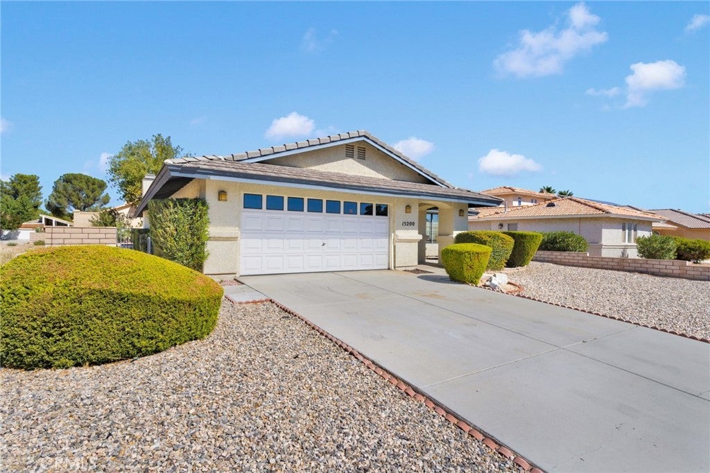 Charming three-bedroom, two-bath home with plenty of space and character! This property features a tile roof, rockscape front yard with no grass, block walls, and a wrought iron gate. Enjoy relaxing mornings on the front porch before stepping inside through the tile entryway. The home offers a two-car garage and thoughtful layout. Bedroom 1, with carpet and built-ins, makes a perfect office or guest space, while Bedroom 2 also has carpet. The primary suite includes carpet, a large mirrored closet, and an ensuite with tiled floors, dual sinks with cultured marble, a small tiled shower, and a sunken tub. The guest bath features a cultured marble shower and tile flooring. The living room is spacious with vaulted ceilings, a beautiful brick fireplace framed by built-ins, and an open connection to the dining area. A large wet bar with sinks makes entertaining easy. The kitchen offers excellent storage with two pantries, plus a center island with electric cooktop, granite countertops, a microwave/oven combo, and a trash compactor—all set on durable laminate flooring. Additional features include a covered patio, backyard shed, and a swamp cooler (currently winterized). This home blends functionality with comfort—ready for your personal touch!