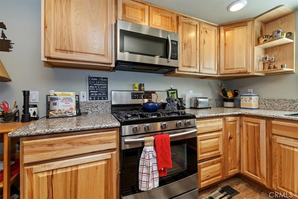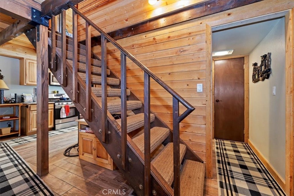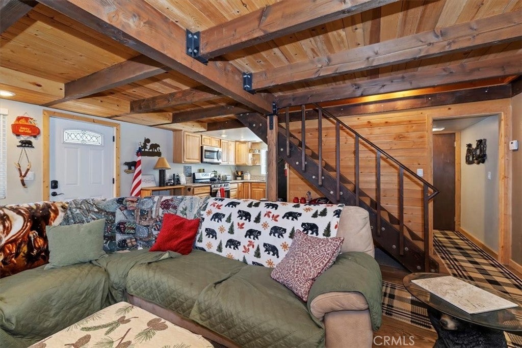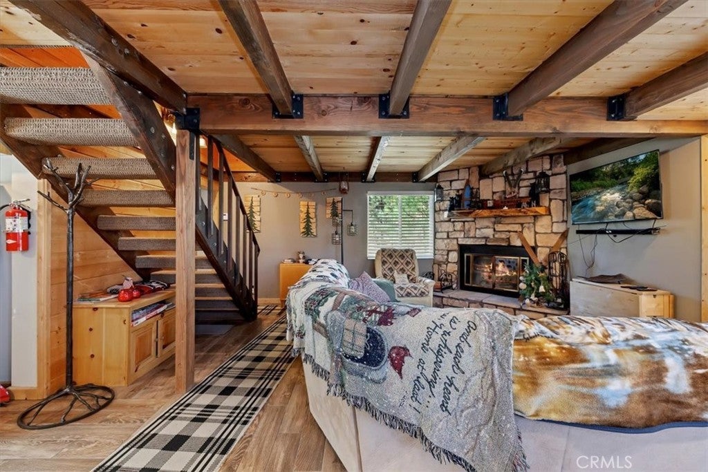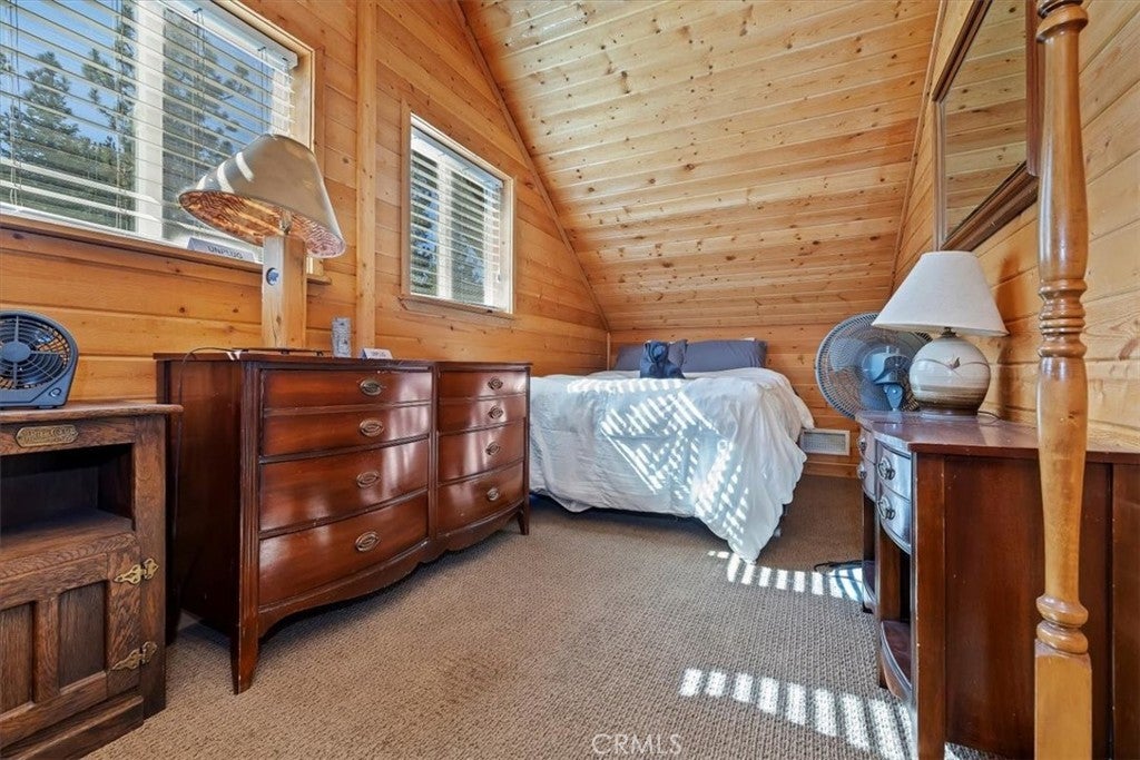 WELCOME TO YOUR DREAM HOME, FULLY FURNISHED AND READY TO MOVE IN! Just steps to Boulder Bay in beautiful Big Bear Lake. Offering 1134 sq ft of living space with central heating on a LARGE 14,000 sq ft lot. The owner spared no expense with beautiful upgrades and amenities. Newer roof, windows and French doors leading to wrap around porch with seating and BBQ, perfect for entertaining. This inviting 2 bedroom and 2 full bathroom mountain retreat is less than 5 minutes to Big Bear Lake and The Village. Walk into the open concept living area with a cozy fireplace and many games to enjoy. One full bathroom downstairs, two comfortable carpeted bedrooms upstairs with a full bath and dryer ready to heat your towels on those cold nights. Flat parking pad with ample parking right off the street for easy access to the front door. Ample storage under the home. Enjoy sledding down your own snow covered hill right from your porch. This home delivers on location, charm and comfort for all seasons. PRICED TO SELL!!! THIS ONE WON'T LAST LONG!!!