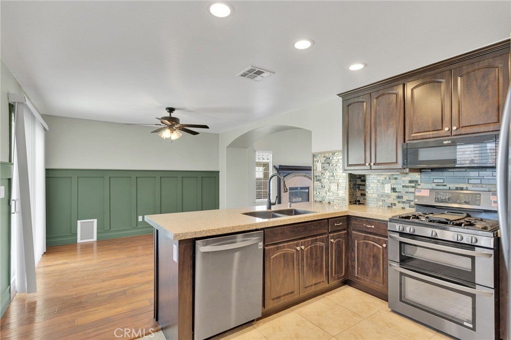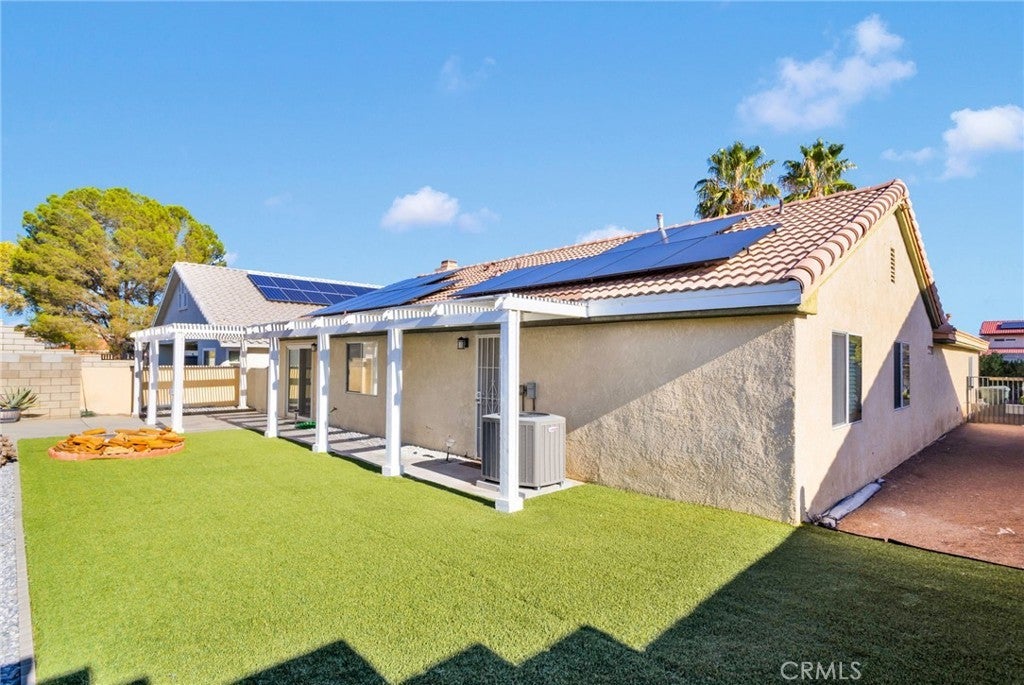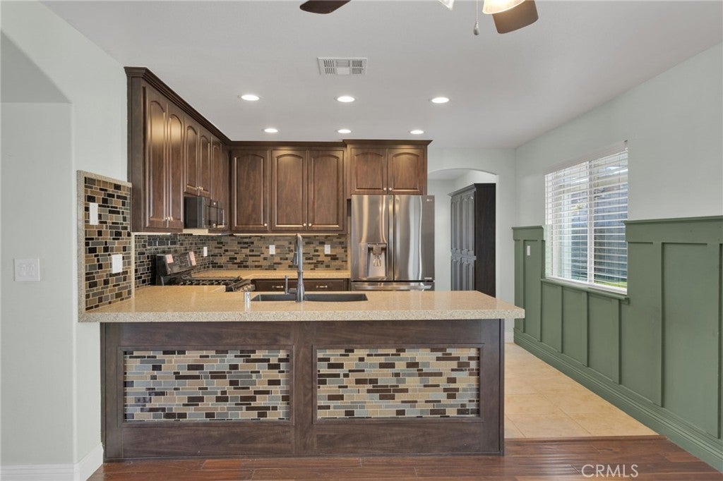 Charming and Upgraded Home with Paid Solar and Flexible Floor Plan Welcome to this beautifully maintained 3–4 bedroom home offering a perfect blend of comfort, character, and modern upgrades. Step inside to find real wood flooring in the living room, entry, and kitchen, complemented by a mix of carpet, tile, and laminate throughout the rest of the home. The spacious living room features a decorative gas or wood-burning fireplace, custom built-ins, and plenty of natural light. The upgraded kitchen boasts granite countertops, a stylish glass tile backsplash, stainless steel appliances, and a breakfast bar that seats three—ideal for casual dining. Elegant wainscoting adds charm to the kitchen, while the included refrigerator makes this space move-in ready. The home offers a dedicated laundry room with extra storage, plus a versatile bonus room that can serve as a gym, office, or fourth bedroom, complete with access to both the garage and front porch. The washer and dryer are also included. Enjoy peace of mind with thoughtful upgrades such as newer window coverings (installed in 2023), reflective window tinting, a Ring doorbell, and a Moen smart water monitoring and leak protection system. Bathroom one features an upgraded tiled shower and tile flooring. Step outside to your backyard retreat featuring low-maintenance artificial grass, a covered patio, and a cozy fire pit—perfect for entertaining or relaxing outdoors. The home also includes 15 paid solar panels (installed in 2023, Enphase system) for energy efficiency and long-term savings. This home truly has it all—style, practicality, and sustainability—ready for its next owner to move right in and enjoy.