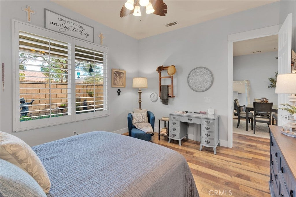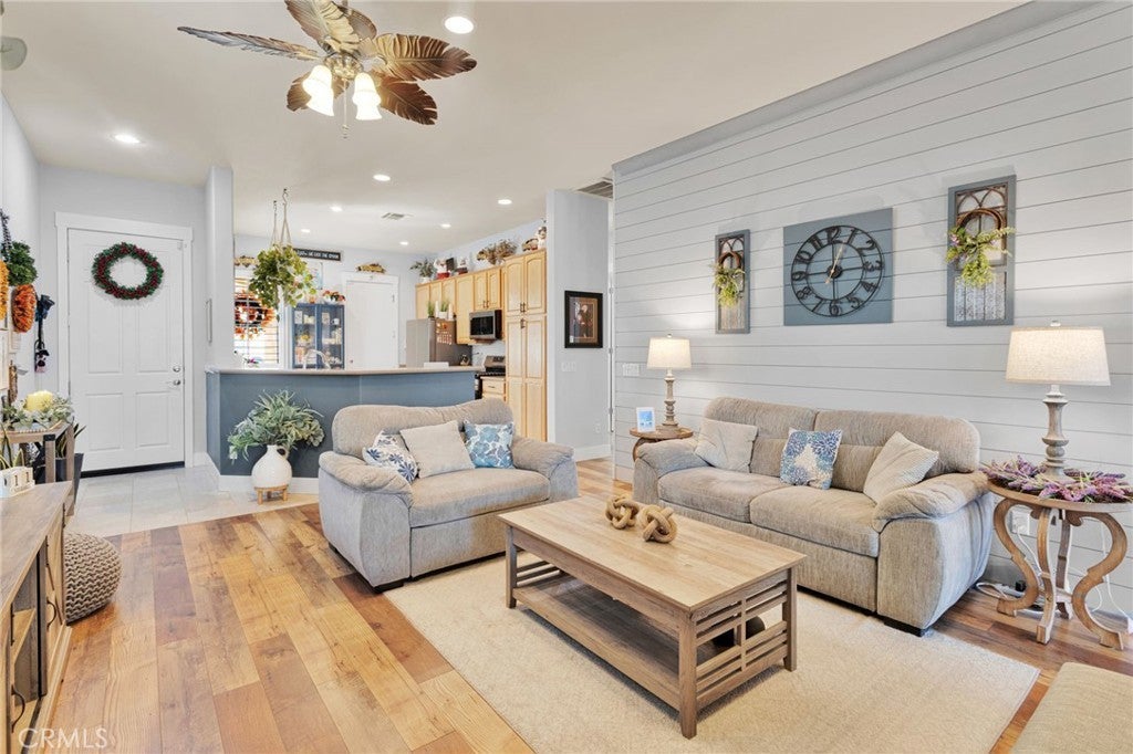 First Time on the Market – Charming Aspen Model. Welcome to this delightful 2-bedroom, 2-bathroom home located in the highly sought-after 55+ gated community of Sun City by Del Webb in Apple Valley. Hitting the market for the first time, this home offers a blend of modern flair and cozy charm. Step inside to discover a spacious open floor plan featuring new wood laminate flooring, upgraded baseboards and door trim, custom ceiling fans, and plantation-style white wood shutters throughout. The kitchen is the heart of the home, boasting newer stainless steel appliances, tile flooring, a sunny breakfast nook, and an open layout that flows into the living and dining areas—perfect for entertaining friends and family. The primary suite is a peaceful retreat, complete with a decorative shiplap accent wall, wood flooring, and a spa-like ensuite bathroom featuring a dual-sink vanity, tile flooring, a large walk-in shower, and a massive walk-in closet. The living room mirrors the primary suite’s charm with another beautiful shiplap accent wall and a soothing, neutral color palette. The split floor plan provides privacy for guests, with the secondary bedroom and bathroom offering comfort and convenience in their own separate wing of the home. Step outside to your low-maintenance backyard oasis, ideal for morning coffee or evening relaxation. The home is located within walking distance to the Aspen Clubhouse, where residents enjoy resort-style amenities including a fitness center, pools, and social clubs. Also nearby is the Mariposa Lodge, home to a new amphitheater that hosts concerts and community events. Outside the gates, you’ll find major shopping, dining, entertainment, hospitals, and everything you need just minutes away. This home won’t last long—schedule your showing today and experience all that Del Webb living has to offer!