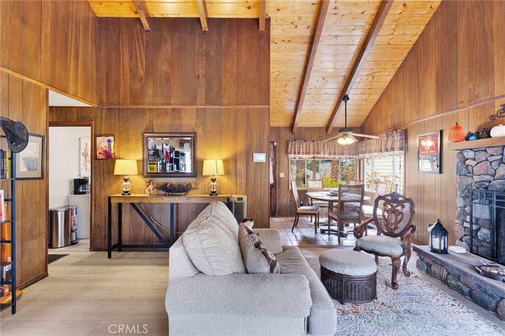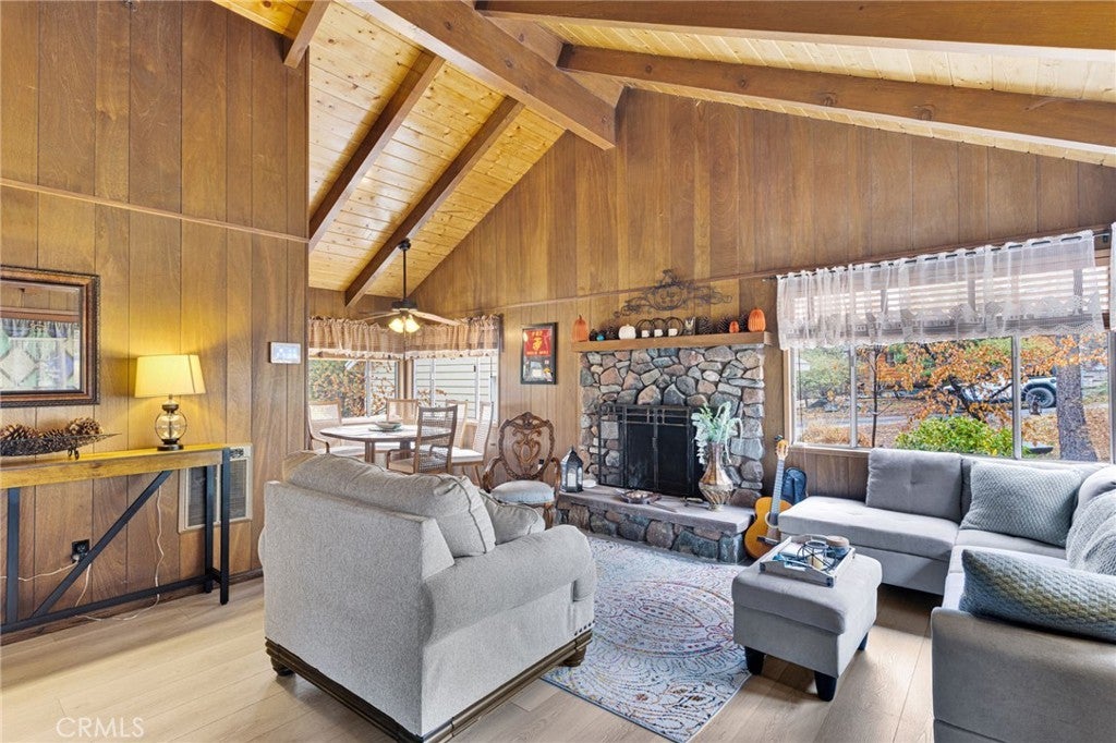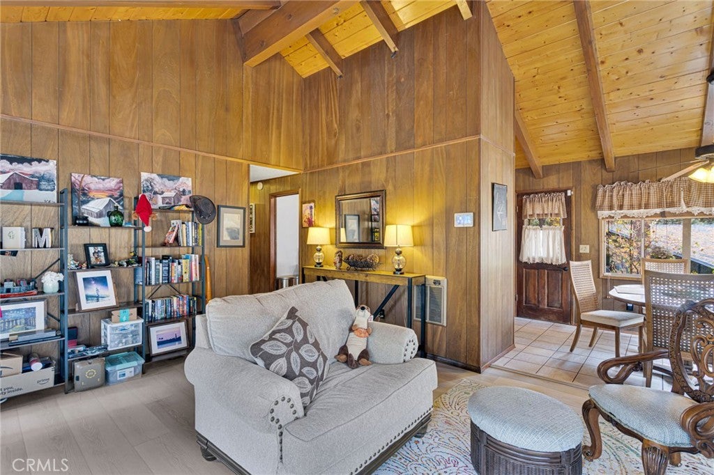 Charming Wrightwood Mountain Retreat with Vaulted Cedar Ceilings and Dual Fireplaces! Welcome to this warm and inviting home situated on a spacious 8,805 sq. ft. corner lot in the heart of beautiful Wrightwood, California. This mountain community is known for its fresh air, four seasons, and outdoor recreation—including Mountain High Ski Resort, hiking and biking trails, fishing at nearby Jackson Lake, and charming local shops and restaurants in the Wrightwood Village area. Step inside to a large living room featuring stunning cedar beam vaulted ceilings and a cozy fireplace, creating the perfect mountain ambiance. The cedar ceilings continue into the dining area and kitchen, adding warmth and character throughout. A very spacious family room also features cedar beam vaulted ceilings, a second fireplace, and a built-in bar with a sink and refrigerator—ideal for entertaining or relaxing with friends. From here, a door leads to the backyard, where you’ll find a beautiful brick patio perfect for outdoor gatherings. This home offers central air and heat, newer vinyl waterproof flooring (installed in 2023), and a firewood storage shed with an attached storage closet for convenience. The detached two-car garage includes a laundry room, providing added functionality. Whether you’re looking for a full-time residence or a weekend getaway, this Wrightwood property combines rustic charm, modern comfort, and proximity to all the mountain activities the area is known for.