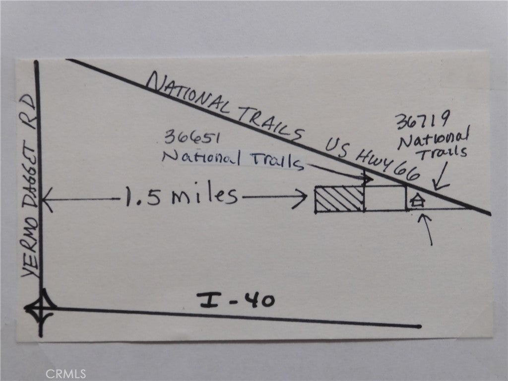 Nice 5 acre parcel approximately 300' south HWY 66 (National Trails Hwy). Approx. 1.5 miles east of Yermo/Daggett Rd. It is just before 36651 US Hwy 66/National Trails Hwy. There appears to be some vehicles & debris, etc. encroaching onto this property from the neighboring property at 36651 US hwy 66/National Trails Hwy. No sewer or water service available. Residents in area have wells and septic systems. Electric should be available, there is a home close to the property. Buyer to verify zoning & availability of electric.