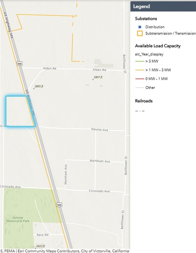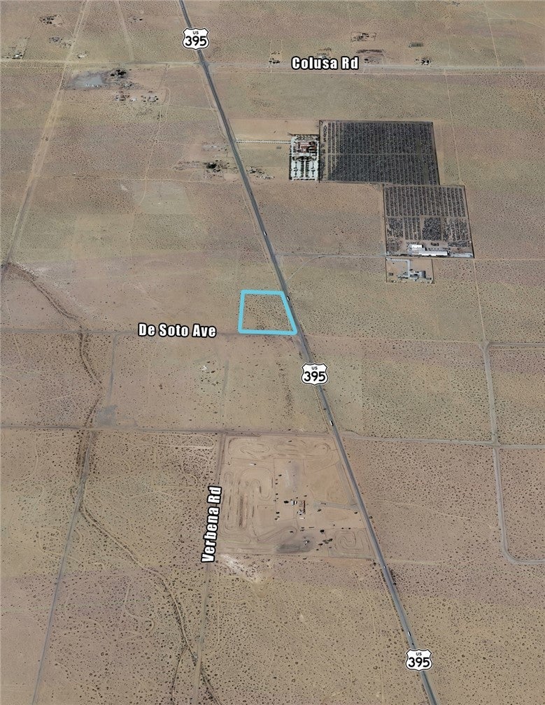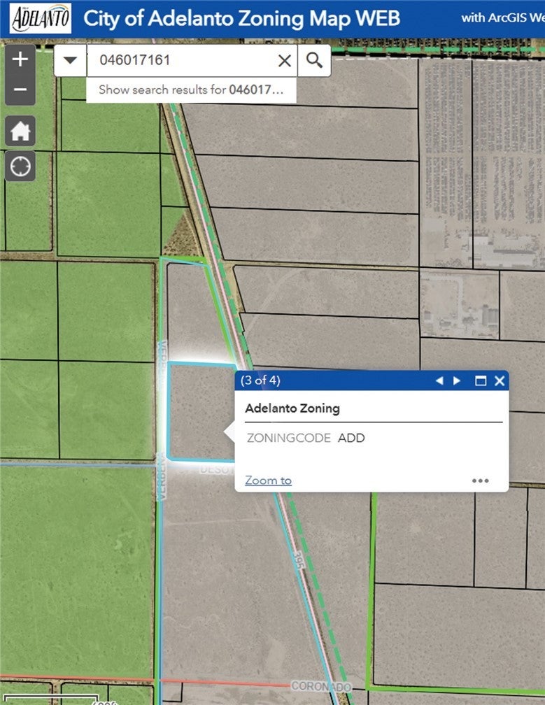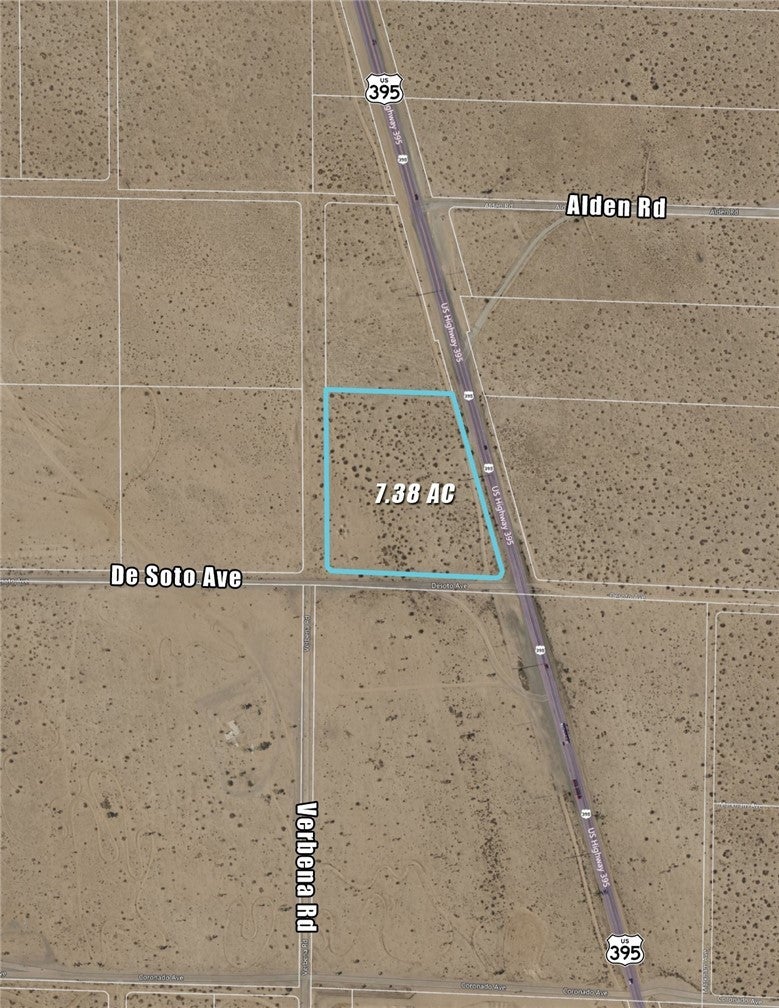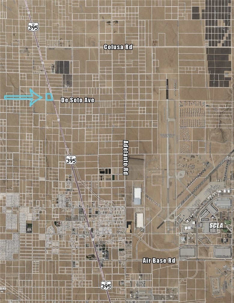 7.38 ac ADD (Airport Development District) land at the Northwest Corner of Hwy 395 and De Soto Ave. ADD zoning permits Cannabis Cultivation and the property is also located in the recently expanded Dispensary Zone. Power lines run along Hwy 395. City of Adelanto water line stops across De Soto Ave at the Northeast corner of Verbena Rd and De Soto Ave. Great visible location with cross street on Hwy 395 and a wide range of possible uses including Industrial and Cannabis.