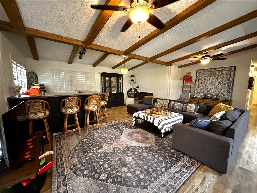 This stylishly renovated desert home blends modern luxury with a "boho-chic" aesthetic. The interior features an open-concept layout with vaulted wood-beam ceilings, a designer kitchen with hexagon tiling and quartz counters, and three unique bedrooms with custom accent walls. Fully updated with matte black fixtures and wide-plank flooring, the home extends outdoors to an expansive covered patio overlooking mature palms and unobstructed mountain and water views.