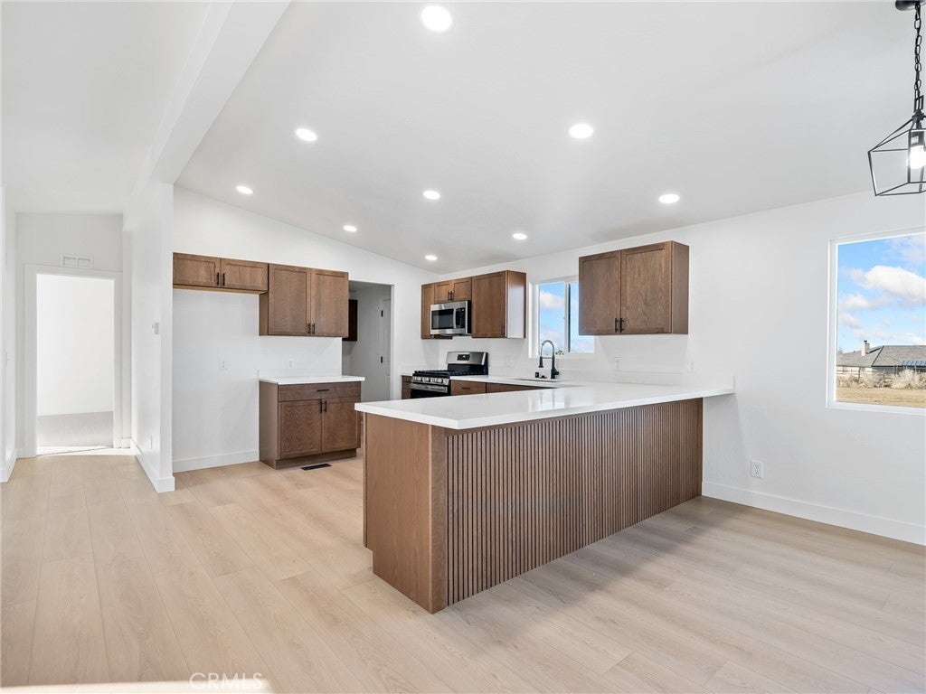 Newly remodeled and renovated from top to bottom! This manufactured home feels brand new and has a split floor plan that provides a 4 bedroom and 2 bath home on a spacious 2.2 acre property that is fully fenced and offers 1,584 +/- square feet for the entire family. The outside of the home has been updated with all new exterior siding, new paint, new wood front porch and back step, new windows and a brand new roof. The inside of the home has also been completely renovated with new flooring throughout with luxury vinyl in most of the home and carpet in the bedrooms, brand new kitchen with modern wood cabinets and white quartz counters, and stainless steel appliances. Additionally, the bathrooms have been updated with new white shaker vanities with matching quartz counters, new tiled bathtub enclosures and new electrical and plumbing fixtures. The floor plan was opened up and greets you with an enormous great room that has an expanded kitchen with plenty of cabinet and countertop space as well as a long breakfast bar counter. Additionally this great room has a separate dining area and a long living room space perfect for entertaining. The laundry room has traditional overhead cabinets above where the washer and dryer would go, but also has a separate set of cabinets with quartz counters for storage and folding space. This home also has a brand new heating unit and AC condenser installed for central heat and air. Outside the entire property is fully fenced with the front portion (along Desert View Rd) being newly installed 5 foot chainlink with top rail that has a traditional 16 foot drive through gate as well as a walkthrough gate next to it. The property was recently cleaned and provides an enormous amount of space for parking, building a detached garage, adding storage sheds, or animal facilities. The location provides quick access to Hwy 138 to commute or drive to town and schools. The property is zoned for horses and located within the Snow Line School District.
