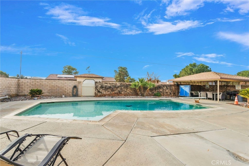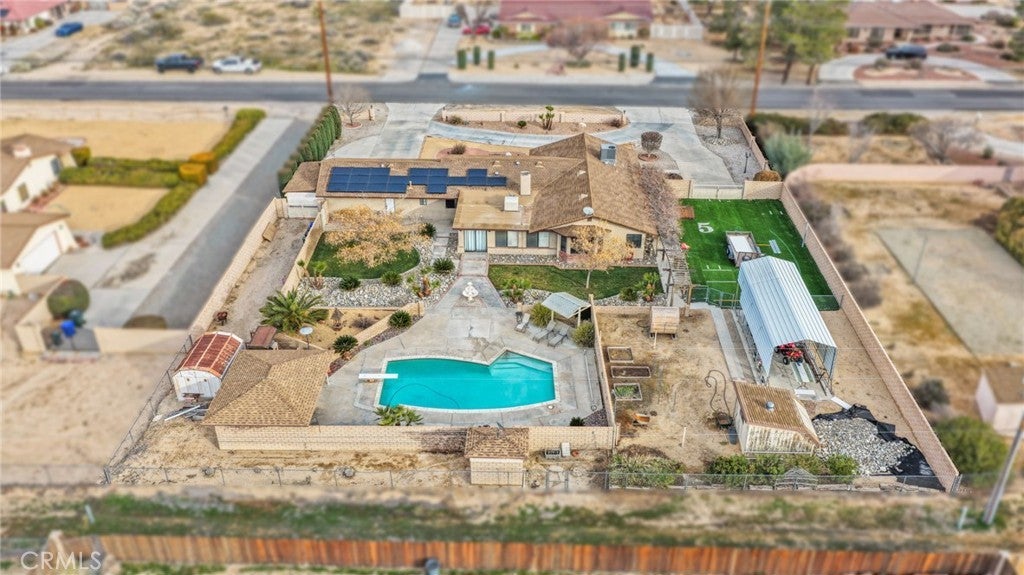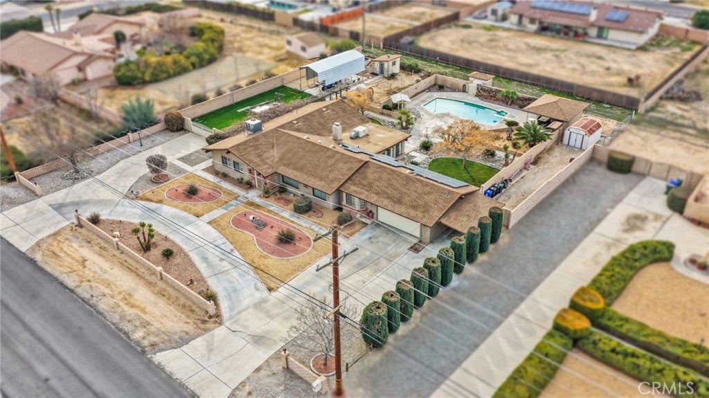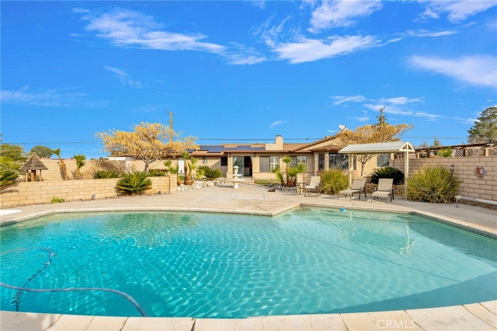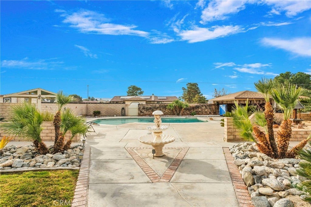 !!!!PAID SOLAR!!!! Welcome to this stunning Desert Knolls pool home in the heart of Apple Valley—where space, upgrades, and outdoor living come together beautifully. This well-appointed 3-bedroom, 2-bathroom home offers 2,392 square feet of comfortable living on an expansive 0.65-acre fully fenced lot. As you step inside, you’re greeted by newer wood-look tile flooring, elegant crown molding, plantation shutters throughout, and a thoughtfully designed layout featuring a spacious family room and a formal dining area—perfect for entertaining. Continue into the inviting living room, highlighted by a cozy fireplace, which seamlessly opens to the remodeled kitchen. The kitchen is truly the heart of the home, showcasing a large, stunning island with granite countertops, a brick backsplash, a built in wine rack, and plenty of workspace. You’ll also enjoy stainless steel appliances including a conventional oven, gas range cooktop, dishwasher, and trash compactor. A charming nook area sits nearby, complete with a pantry accented by stylish barn doors. The laundry room is conveniently located indoors in its own separate room. The home offers two generously sized secondary bedrooms and a full bathroom with dual sinks, while the private primary suite is a true retreat. The oversized primary bedroom features a walk-in closet with new closet doors, space for a sitting area or home office, and direct access to the enclosed patio. The primary bathroom includes dual sinks, a separate soaking tub, and a walk-in shower. Step into the enclosed patio, which features tile flooring and a sink area, refrigerator, and a swamp cooler which is ideal for relaxing or hosting gatherings year-round. Outside, the property truly shines with a beautiful in-ground pool, a dedicated BBQ patio area, RV access, a carport, and a storage shed. Paid off solar panels and the AC/heating unit was replaced 3 years ago! With plenty of room to roam, garden, or entertain, this backyard is built for enjoying desert living at its best. Located near Highway 18, schools, shopping, and restaurants, this home offers both convenience and lifestyle. This Desert Knolls gem is a rare find and will not last long—schedule your private showing today!