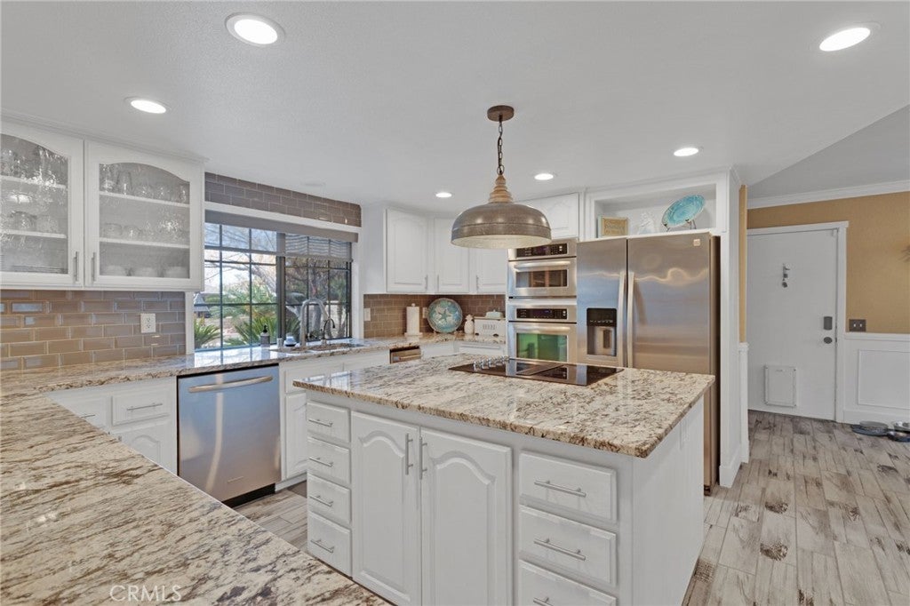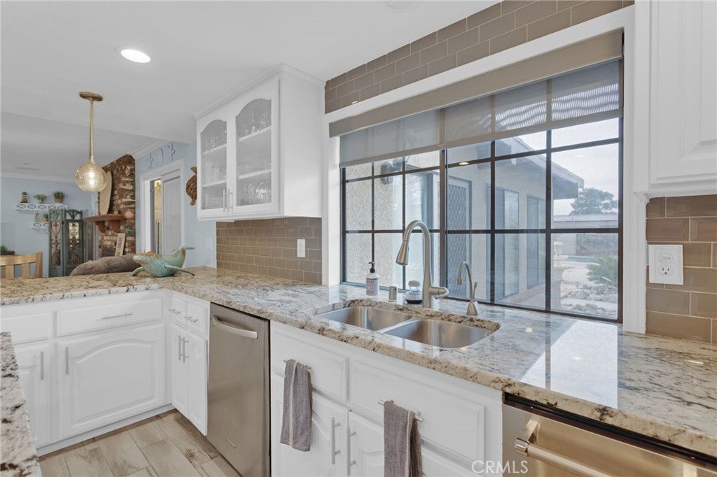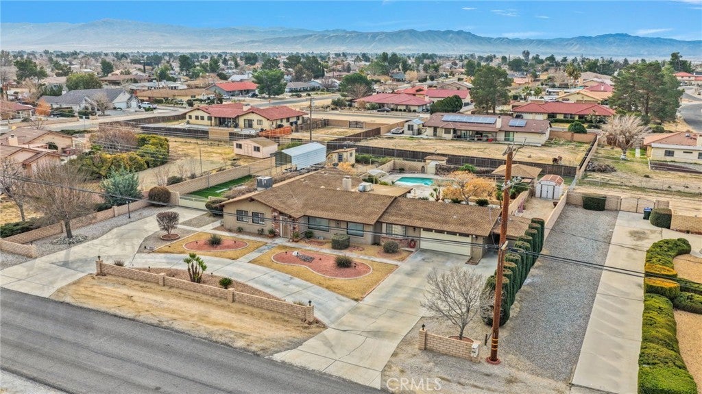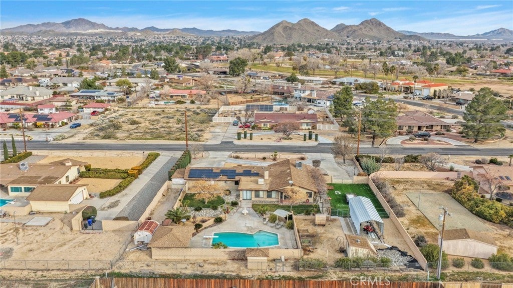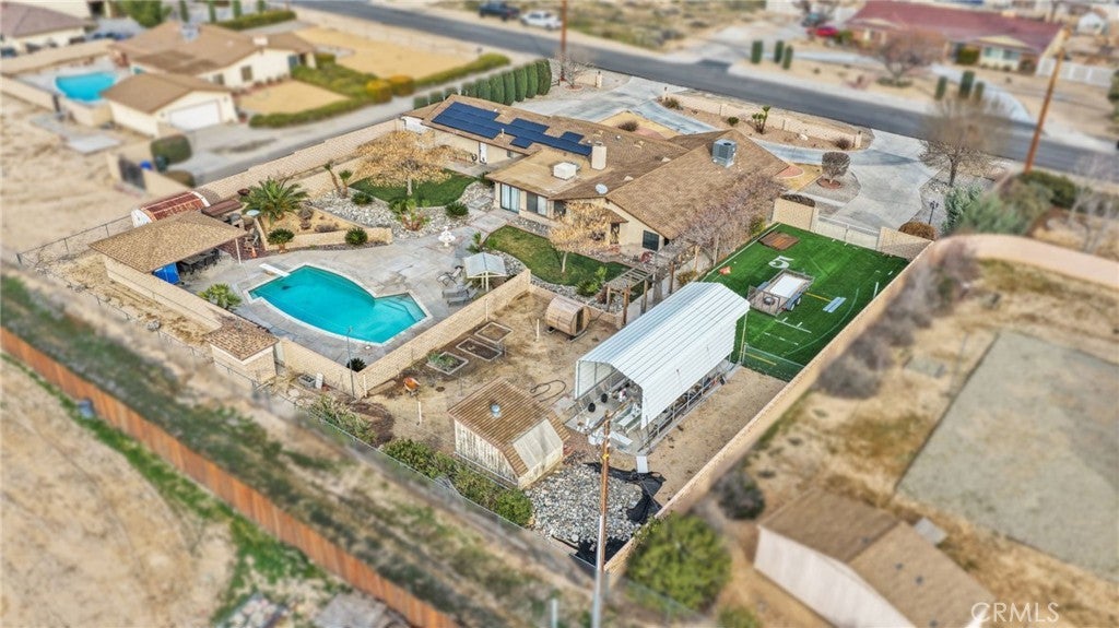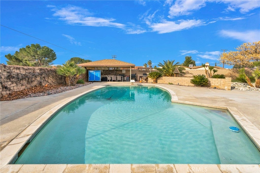 !!!!PAID SOLAR!!!! Welcome to this stunning Desert Knolls pool home in the heart of Apple Valley—where space, upgrades, and outdoor living come together beautifully. This well-appointed 3-bedroom, 2-bathroom home offers 2,392 square feet of comfortable living on an expansive 0.65-acre fully fenced lot. As you step inside, you’re greeted by newer wood-look tile flooring, elegant crown molding, plantation shutters throughout, and a thoughtfully designed layout featuring a spacious family room and a formal dining area—perfect for entertaining. Continue into the inviting living room, highlighted by a cozy fireplace, which seamlessly opens to the remodeled kitchen. The kitchen is truly the heart of the home, showcasing a large, stunning island with granite countertops, a brick backsplash, a built in wine rack, and plenty of workspace. You’ll also enjoy stainless steel appliances including a conventional oven, gas range cooktop, dishwasher, and trash compactor. A charming nook area sits nearby, complete with a pantry accented by stylish barn doors. The laundry room is conveniently located indoors in its own separate room. The home offers two generously sized secondary bedrooms and a full bathroom with dual sinks, while the private primary suite is a true retreat. The oversized primary bedroom features a walk-in closet with new closet doors, space for a sitting area or home office, and direct access to the enclosed patio. The primary bathroom includes dual sinks, a separate soaking tub, and a walk-in shower. Step into the enclosed patio, which features tile flooring and a sink area, refrigerator, and a swamp cooler which is ideal for relaxing or hosting gatherings year-round. Outside, the property truly shines with a beautiful in-ground pool, a dedicated BBQ patio area, RV access, a carport, and a storage shed. Paid off solar panels and the AC/heating unit was replaced 3 years ago! With plenty of room to roam, garden, or entertain, this backyard is built for enjoying desert living at its best. Located near Highway 18, schools, shopping, and restaurants, this home offers both convenience and lifestyle. This Desert Knolls gem is a rare find and will not last long—schedule your private showing today!
