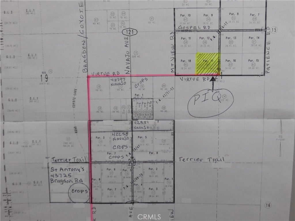 40.47 acres raw land, located near St. Antony's Christian Coptic Orthadox Monastery. From Barstow take I-15 towards Newberry Springs. Exit to the right at Minneola Rd. then take an immediate left on Yermo Rd. Go approx. 3.3 miles to Coyote Lake Rd, turn left, cross over the freeway, veer to the right you will be on Hacienda Rd. Go 1.2 miles on Hacienda then turn left on Coyote Lake Rd. Go 6.1 miles on Coyote Lake Rd, turn right and go 1.2 miles to the property will be on your left. You should be at the approximate SW corner of the property. (You will have passed St.Antony's church by about a mile). Coyote Lake Rd & roads after that are dirt. The roads/trails after the Monastary property may be soft & sandy so best to have a vehicle with 4 wheel drive. Might have to do a little off roading towards the end. Lattitude 35.0309, Longitude -116.67 should be on the property, fairly close to the SW corner of the property.
