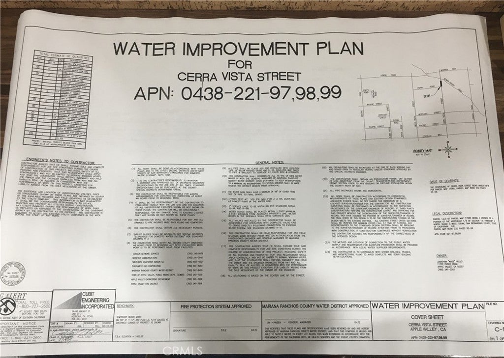 ***Come VIEW and MAKE an OFFER TODAY! Amazing land opportunity in Apple Valley CA. Part of the Ranchos Del Oro community, the 2.91 acre lot is tucked away in the hills with plenty of room to build a custom home offering GORGEOUS VIEWS to the NORTH and WEST. LOT SPLIT and APPROVED TRACT MAP NO. 17085 have been taken care of with the county so site already has its own address on Cerra Vista St. Also, the property is adjacent to utility lines. PLUS, DRAINAGE STUDY, WATER PLANS, and GRADING PLANS are INCLUDED with the sale. These plans will save TIME and MONEY for any developer looking to get a project underway. With a shortage of homes on the market and demand continuing to rise, this is an ideal site for NEW CONSTRUCTIONS. Not to mention, two adjacent lots are also for sale. See APNs 0438-221-97 and 99. Each parcel can be purchased separately or as a package deal. A definite must see opportunity before it's too late.***