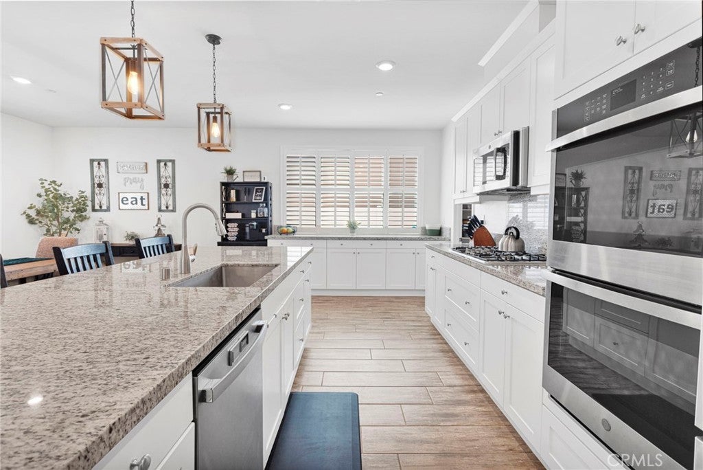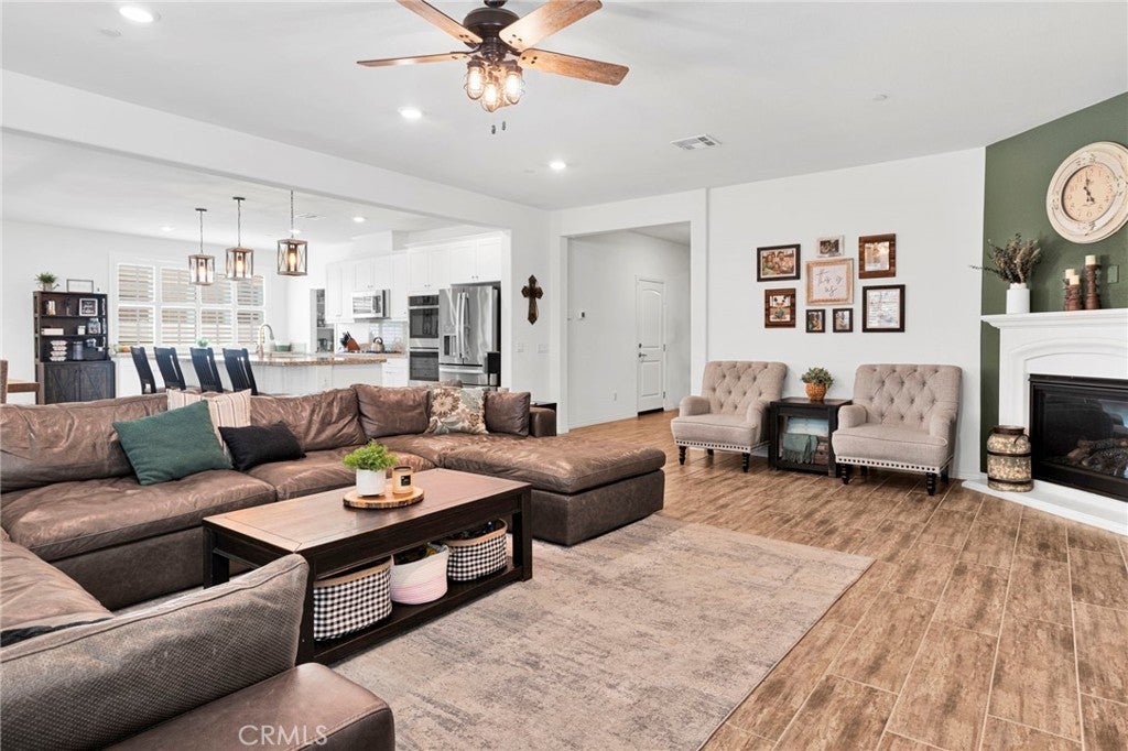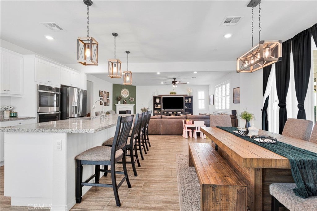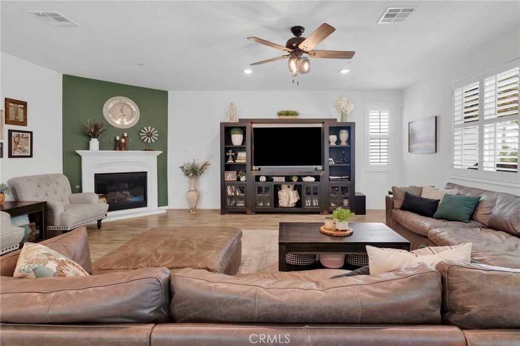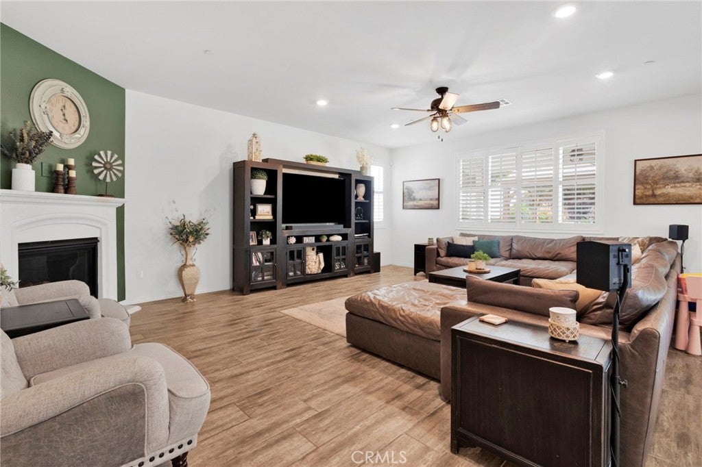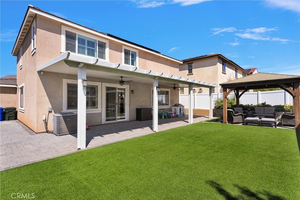 Welcome to this near-new, beautifully upgraded multi-generational home located in the desirable Shadow Rock community of Jurupa Valley! Boasting over 2,800 sq ft of living space, this thoughtfully designed home offers 5 bedrooms and 3 full bathrooms, including a spacious downstairs bedroom and full bath—perfect for guests or extended-family-style living. The home features an open-concept floor plan, with the kitchen overlooking the great room, creating the perfect space for entertaining and everyday living. The kitchen is truly the heart of the home, showcasing an oversized island, sleek white cabinetry, granite countertops, newer stainless steel appliances, and a large walk-in pantry with abundant storage. The great room features a cozy fireplace, setting the tone for warm gatherings and lasting memories. Throughout the downstairs and bathrooms, you’ll find neutral-colored designer wood-look plank tile flooring that is both stylish and easy to maintain, while the upstairs bedrooms, stairs, and loft feature durable, water-resistant carpet. Additional upgrades include custom lighting and ceiling fans, plantation shutters throughout, and a host of smart and efficiency features, such as a full interior and exterior security system, FLO by Moen smart water leak detection system, Rain Bird irrigation system with automatic rain shut-off, and Smart ovens controllable via phone. The home is equipped with a generator-ready electrical panel, including an inlet box and transfer switch, providing peace of mind and continued functionality during power outages. Step outside to your private backyard oasis, designed for low-maintenance living and entertaining. Enjoy artificial turf, built-in drainage, paver walkways, and a custom gazebo—perfect for BBQs and gatherings. The extended Alumawood patio cover features lighting and two ceiling fans, allowing you to enjoy outdoor living year-round. There’s even space to add a small pool, spa, or play area. Located near the freeway, major shopping, schools, and within a community offering beautiful parks and walking trails, this home truly has it all. Don’t miss your opportunity to own this exceptional home—it won’t last long!