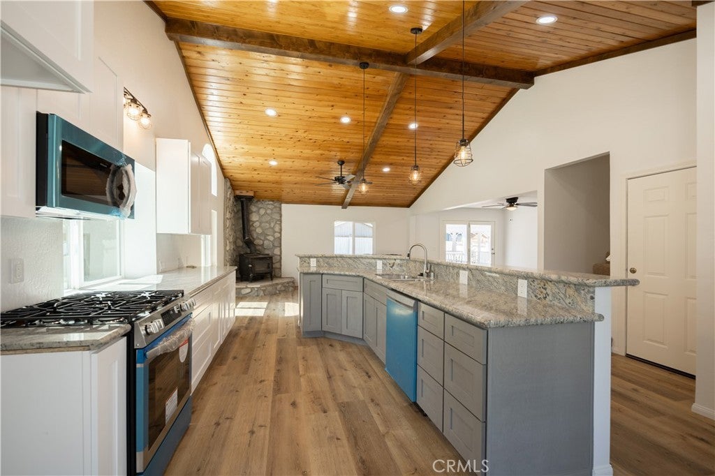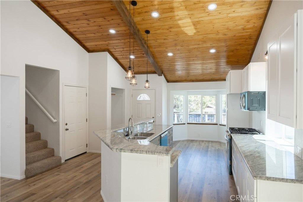 Move in ready! Escape to this stunning 4-bed, 3.5-bath mountain retreat, beautifully renovated for modern comfort. Enjoy vaulted tongue-and-groove ceilings with exposed wooden beams that create a warm, inviting ambiance. The brand-new kitchen boasts all-new cabinets, new appliances, gorgeous granite counters, and a large island, perfect for family gatherings. Everything flows seamlessly into the spacious open-concept family room with a corner wood-burning stove. Upstairs, the spacious master suite features an ensuite bath and dual closets along with 2 additional bedrooms and another full bath. Downstairs, a convenient fourth bedroom with its own ensuite awaits. You will love the brand new feel of this light and bright home nestled into a quiet neighborhood. Outside, a generous yard offers ample space and a large deck for outdoor entertaining. There’s a 2-car garage with laundry and plenty of additional exterior parking and room for a boat or RV. Your dream getaway starts here! Make your appointment to view this one today!