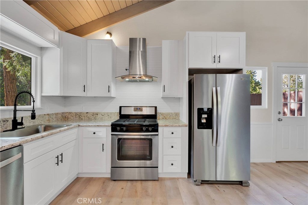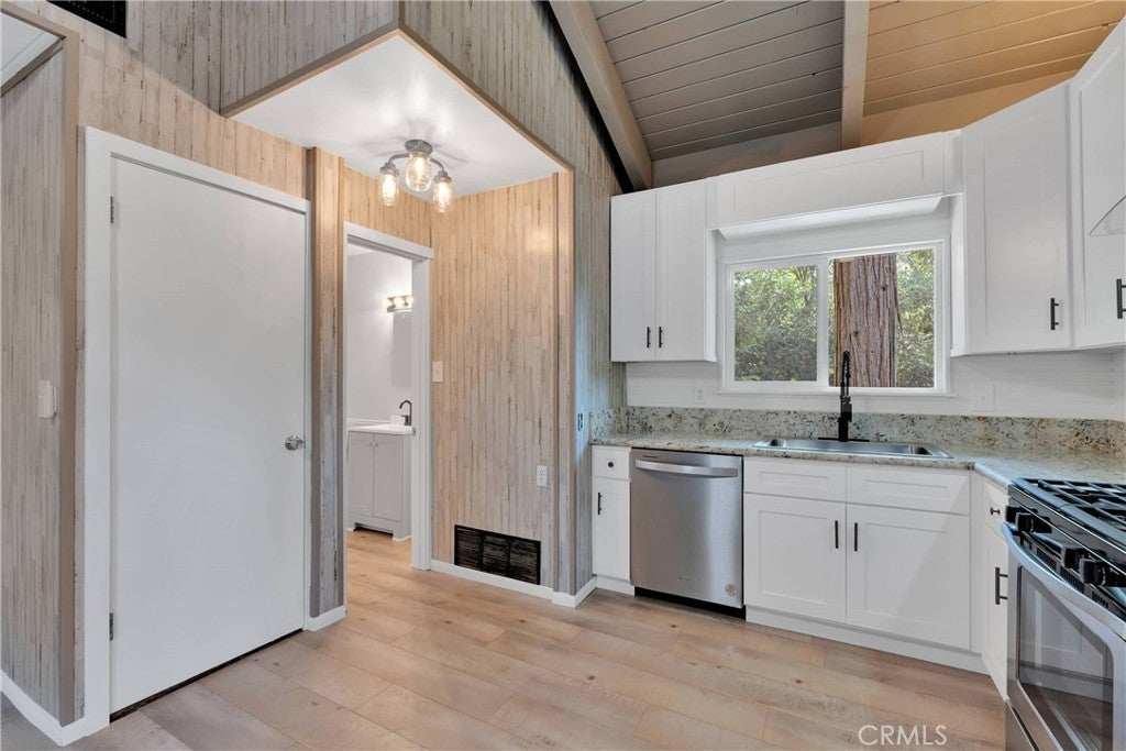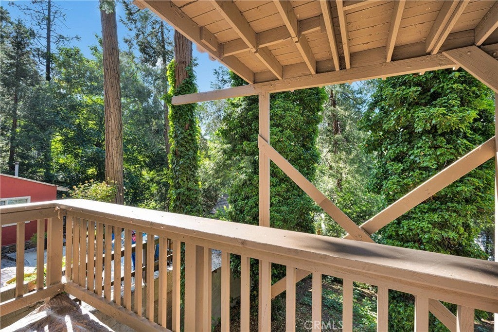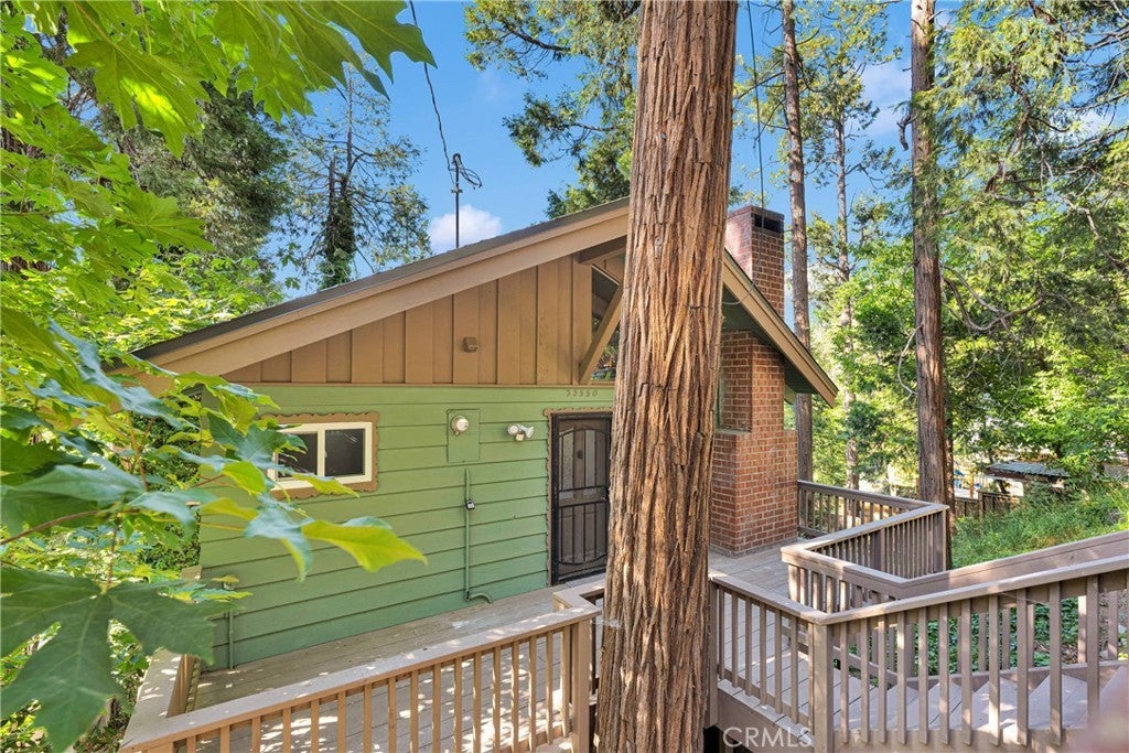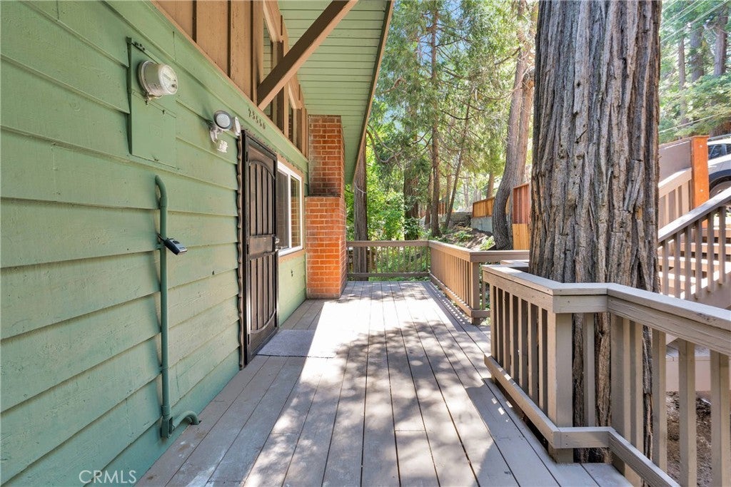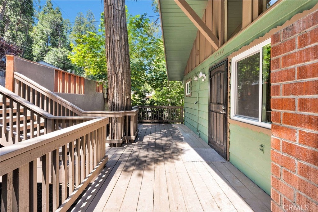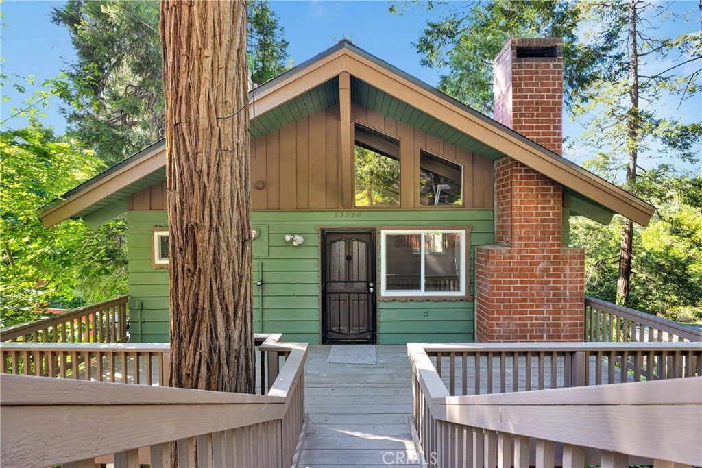Don't miss this beautifully remodeled 2-bedroom, 2-bathroom mountain home, full of thoughtful upgrades and charm. Recent improvements include a brand new roof with insulated panels, dual-pane windows, fresh exterior and interior paint, and reinforced rear upper and lower decks. The fully updated kitchen features stainless steel appliances—refrigerator, oven, hood, and dishwasher—plus new cabinetry and granite countertops. Both bathrooms have been tastefully remodeled with new vanities, commodes, fixtures and more. Throughout the home you'll find new flooring, including laminate, tile, and carpet in the bedrooms. Downstairs includes both bedrooms, a full bathroom, laundry hookups, hallway storage, and easy access to the lower deck and fenced backyard. The main level boasts high ceilings, a cozy fireplace, a convenient half bath, and a private upper deck perfect for relaxing or entertaining. This move-in-ready home combines modern upgrades with mountain charm—come take a look! Bonus - the buildup area underneath is perfect for storage or a workshop. Minutes away from Lake Gregory, restaurants, shopping, hiking trails, water slides, snow skiing, mountain biking - fun all year long, summer and winter! Easy to park and so commuter-friendly, come see it today!