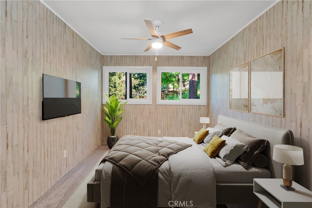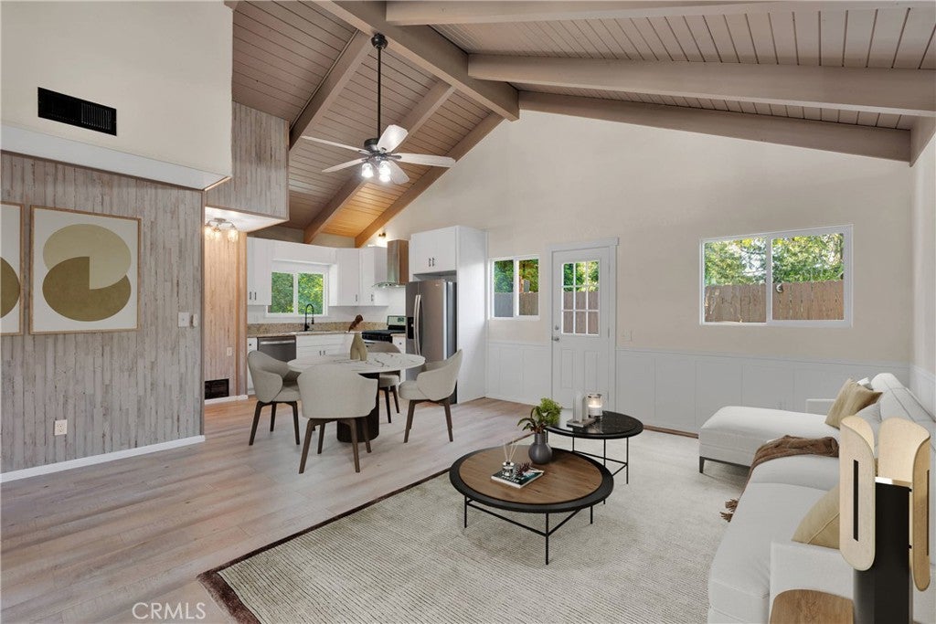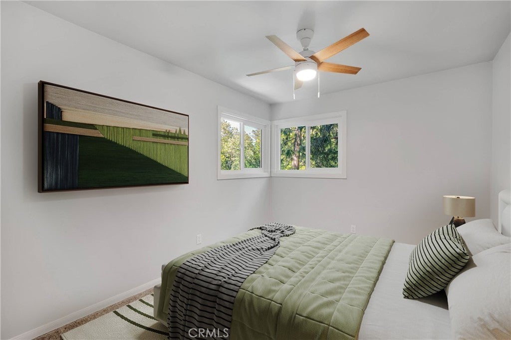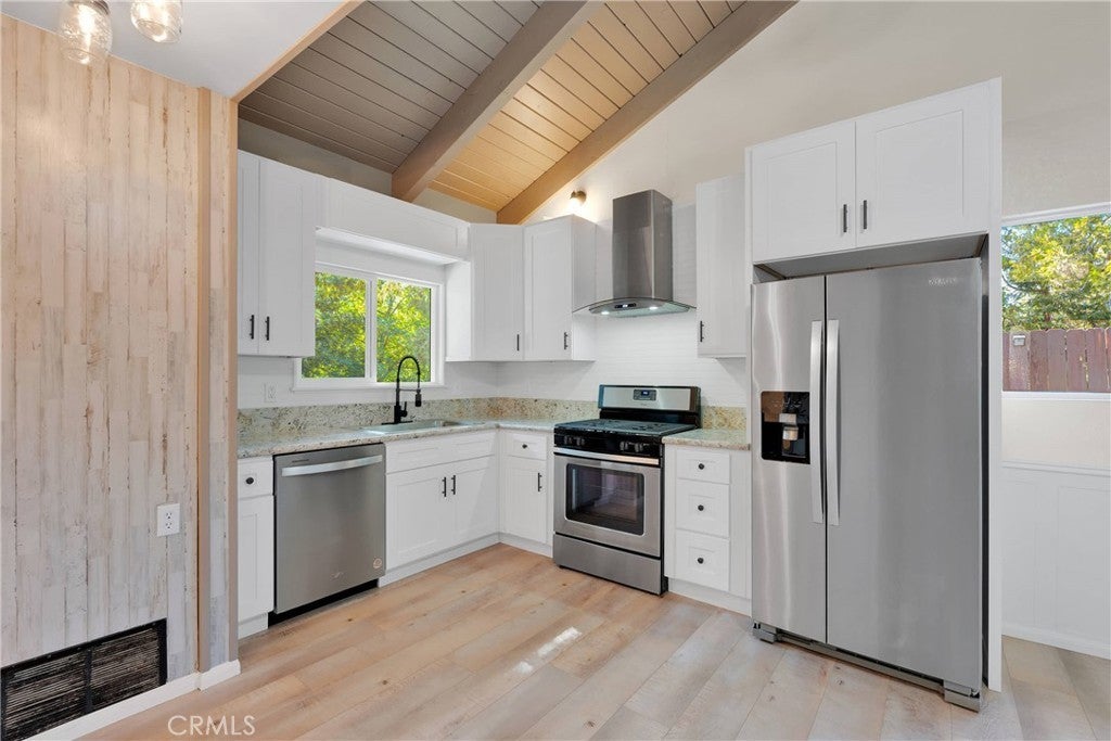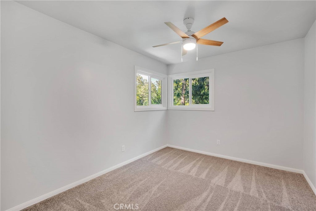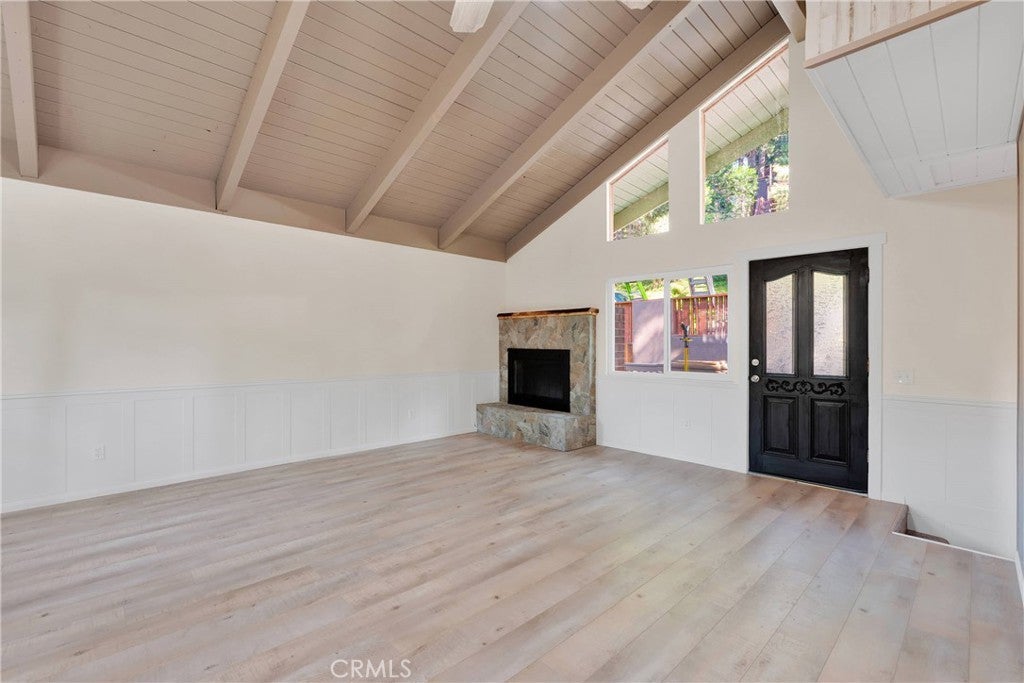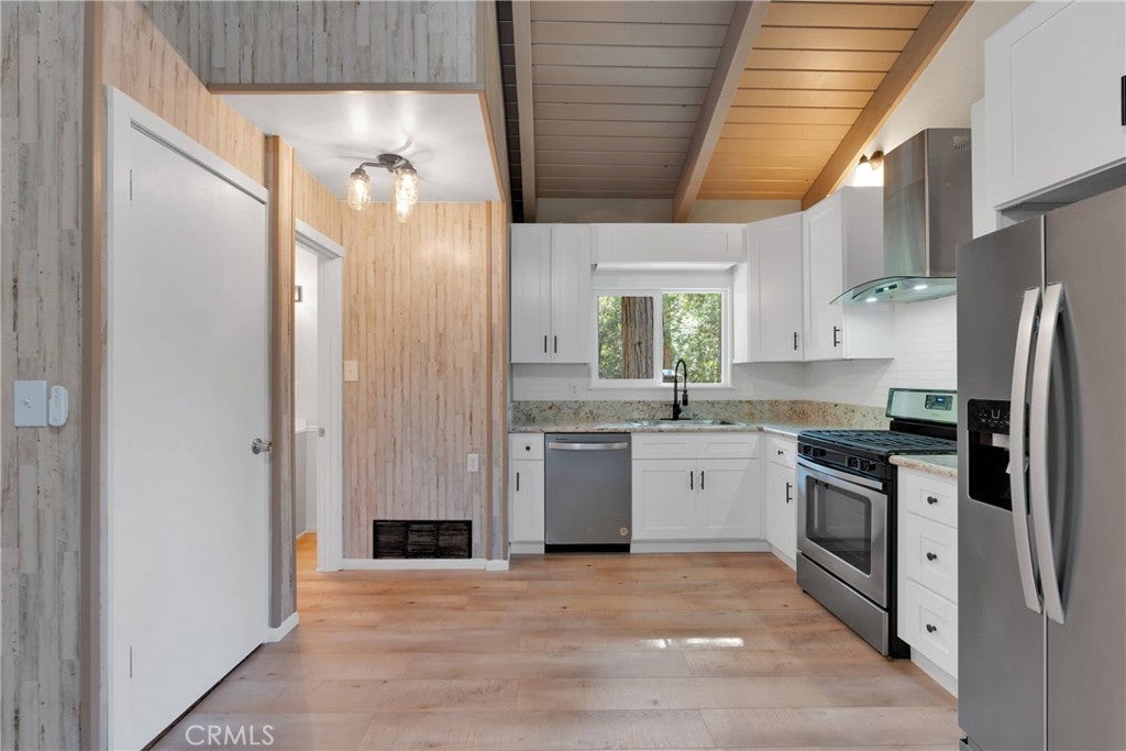Don't miss this beautifully remodeled 2-bedroom, 2-bathroom mountain home, full of thoughtful upgrades and charm. Recent improvements include a brand new roof with insulated panels, dual-pane windows, fresh exterior and interior paint, and reinforced rear upper and lower decks. The fully updated kitchen features stainless steel appliances—refrigerator, oven, hood, and dishwasher—plus new cabinetry and granite countertops. Both bathrooms have been tastefully remodeled with new vanities, commodes, fixtures and more. Throughout the home you'll find new flooring, including laminate, tile, and carpet in the bedrooms. Downstairs includes both bedrooms, a full bathroom, laundry hookups, hallway storage, and easy access to the lower deck and fenced backyard. The main level boasts high ceilings, a cozy fireplace, a convenient half bath, and a private upper deck perfect for relaxing or entertaining. This move-in-ready home combines modern upgrades with mountain charm—come take a look! Bonus - the buildup area underneath is perfect for storage or a workshop. Minutes away from Lake Gregory, restaurants, shopping, hiking trails, water slides, snow skiing, mountain biking - fun all year long, summer and winter! Easy to park and so commuter-friendly, come see it today!