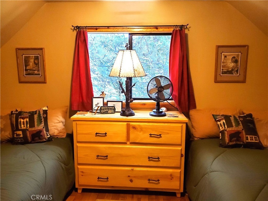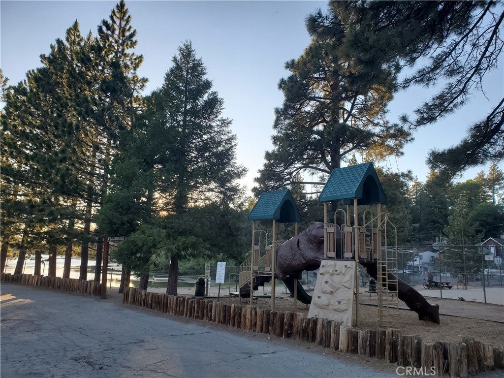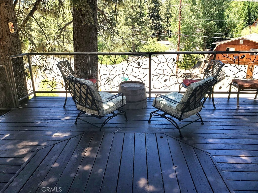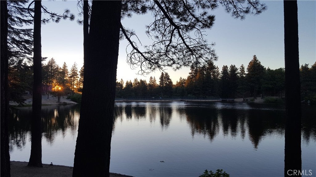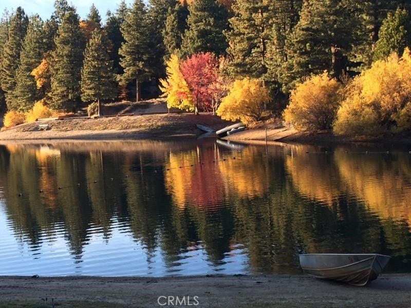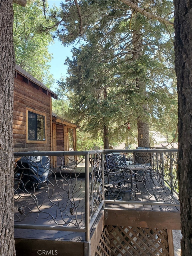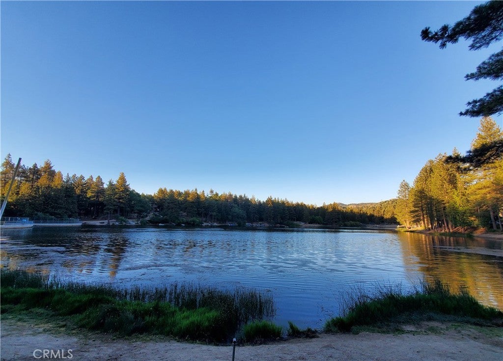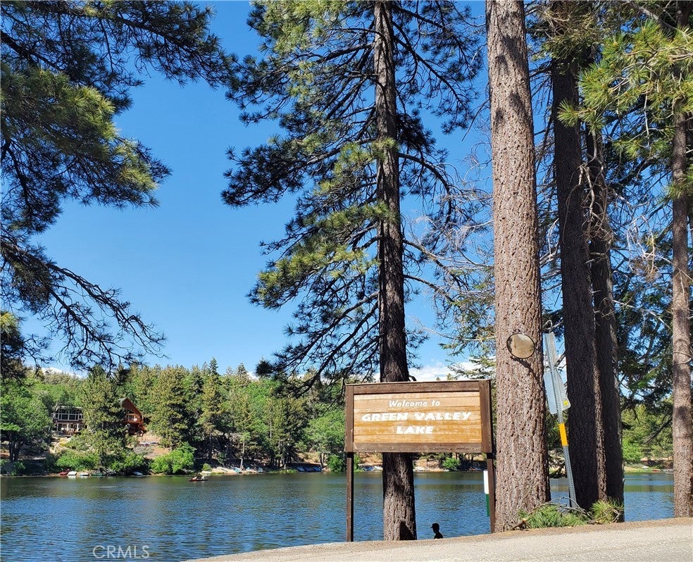 COME GET YOUR SKI ON! Minutes to Snow Valley Ski Resort and SkyPark at Santa’s Village. TURN-KEY lake home retreat. This charming cabin home has been updated and is move in ready. One of a kind, custom-built wrought iron railing leads you up the stairs to the large deck, perfect for relaxing or entertaining. As you enter, you are greeted by 8” wide solid Hickory plank flooring, soaring beamed ceilings, custom lighting, original wood detail, and stacked stone fireplace with a cozy hearth. Curl up with a cup of cocoa and watch movies or play games. The large sliding door leads to a small side deck, perfect for sunning and enjoying the mountain breezes. The kitchen has beautiful new cabinetry and counter tops with lots of storage and a walk-in pantry. Kohler sink, over the range micro, rustic beamed ceiling, even the refrigerator is included. The bathroom is finished with slate floors, an oversized, glass enclosed shower with pine cone tile accents, skylight window, unique custom-made vanity with hand painted sink, and even room for the stacked washer/dryer. One spacious bedroom downstairs and more of that gorgeous wrought iron railing leads you up the stairs to a secondary bedroom with room for two double beds. There are amazing custom light fixtures throughout the home creating the perfect “rustic cabin” feel. The double sized lot gives you plenty of room for outdoor games or even playing in the snow during winter. Green Valley Lake is just a short walk down the street. You will find a playground, country store, coffee house, café, post office, canoe and row boat rentals, and the best fishing on the mountain. Shown by appointment only.
