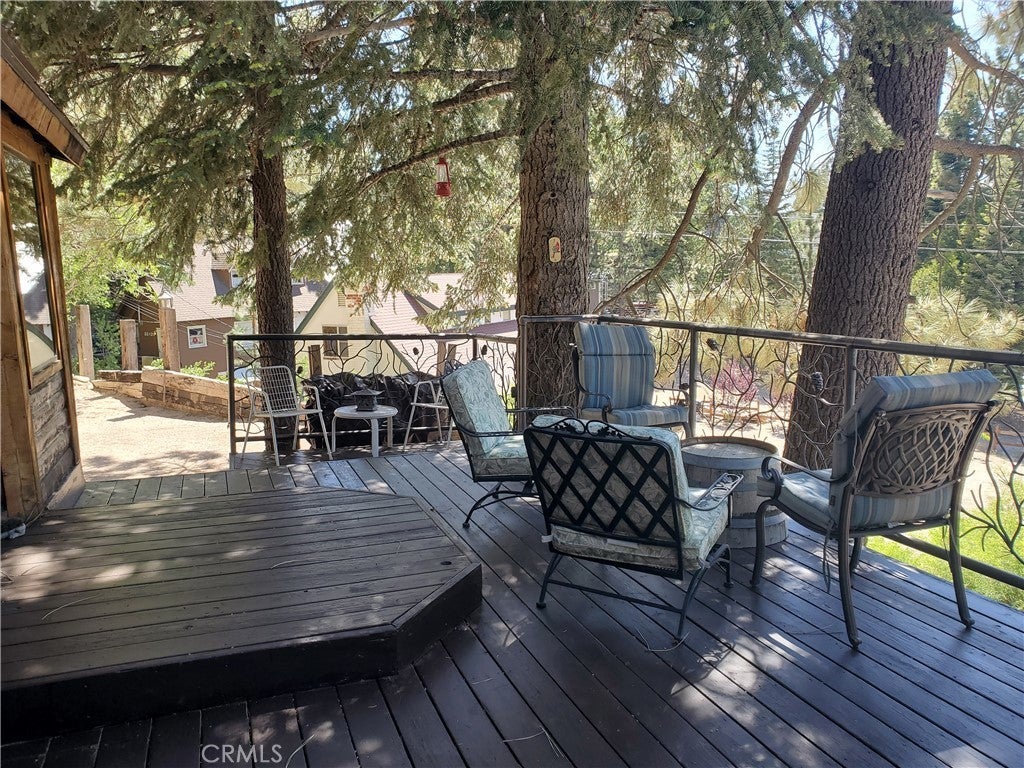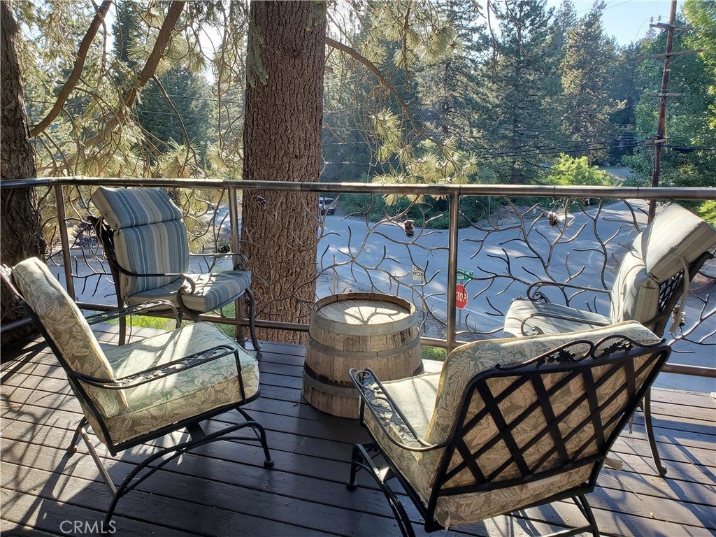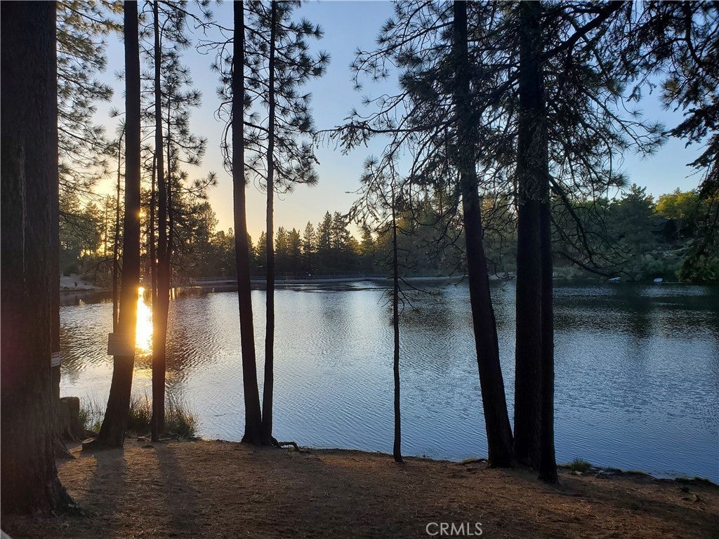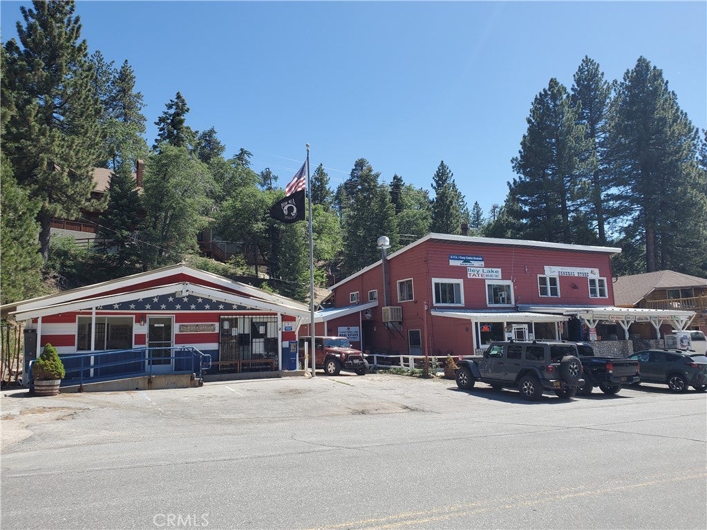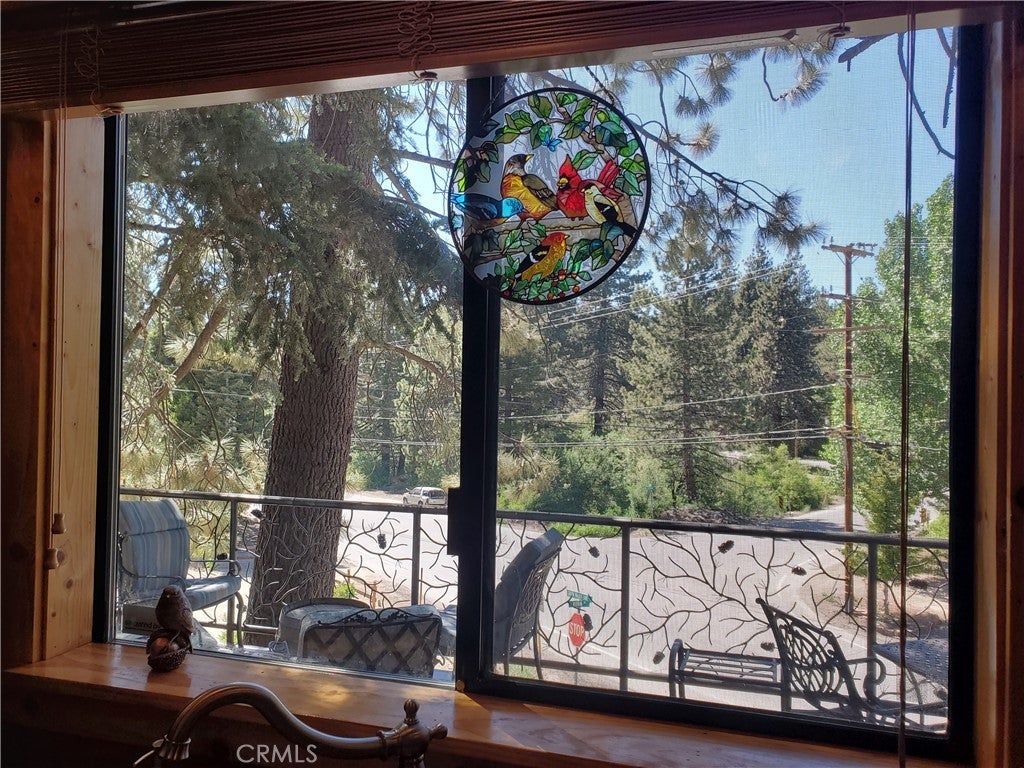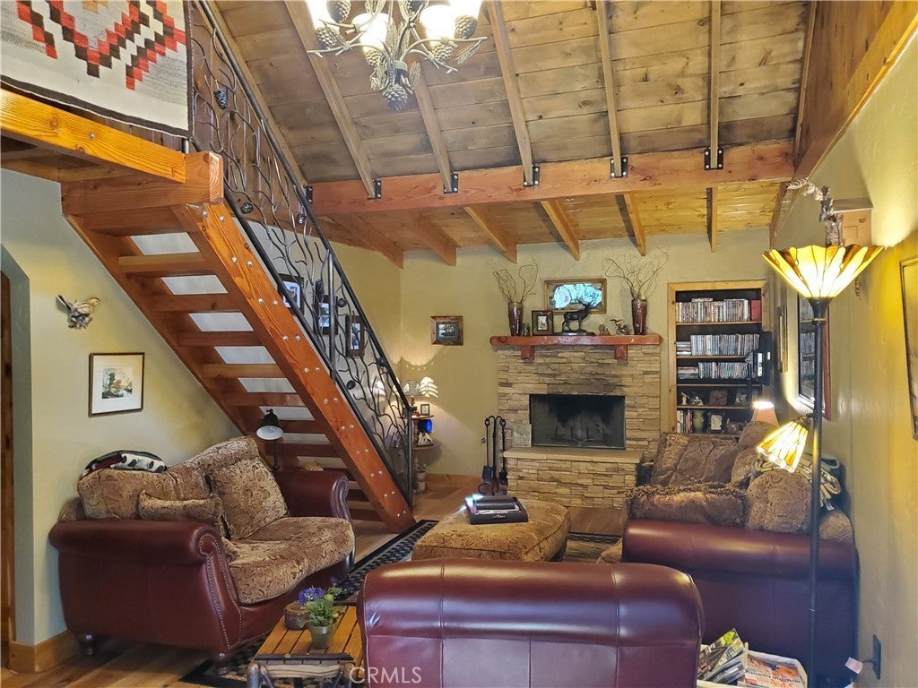 COME GET YOUR SKI ON! Minutes to Snow Valley Ski Resort and SkyPark at Santa’s Village. TURN-KEY lake home retreat. This charming cabin home has been updated and is move in ready. One of a kind, custom-built wrought iron railing leads you up the stairs to the large deck, perfect for relaxing or entertaining. As you enter, you are greeted by 8” wide solid Hickory plank flooring, soaring beamed ceilings, custom lighting, original wood detail, and stacked stone fireplace with a cozy hearth. Curl up with a cup of cocoa and watch movies or play games. The large sliding door leads to a small side deck, perfect for sunning and enjoying the mountain breezes. The kitchen has beautiful new cabinetry and counter tops with lots of storage and a walk-in pantry. Kohler sink, over the range micro, rustic beamed ceiling, even the refrigerator is included. The bathroom is finished with slate floors, an oversized, glass enclosed shower with pine cone tile accents, skylight window, unique custom-made vanity with hand painted sink, and even room for the stacked washer/dryer. One spacious bedroom downstairs and more of that gorgeous wrought iron railing leads you up the stairs to a secondary bedroom with room for two double beds. There are amazing custom light fixtures throughout the home creating the perfect “rustic cabin” feel. The double sized lot gives you plenty of room for outdoor games or even playing in the snow during winter. Green Valley Lake is just a short walk down the street. You will find a playground, country store, coffee house, café, post office, canoe and row boat rentals, and the best fishing on the mountain. Shown by appointment only.