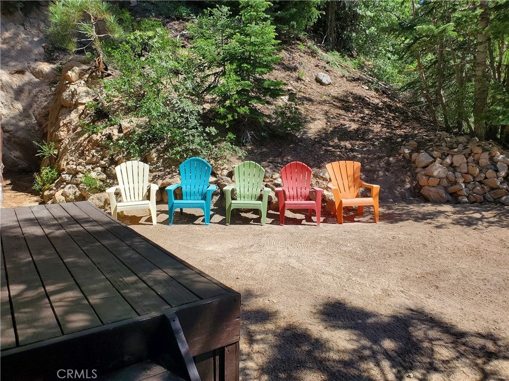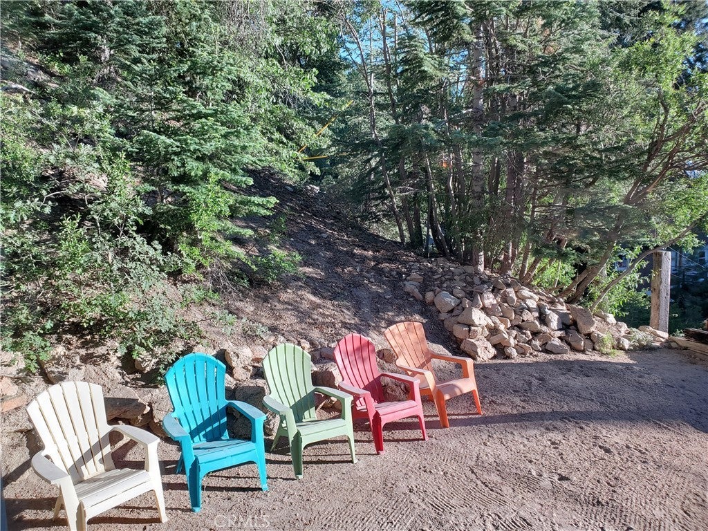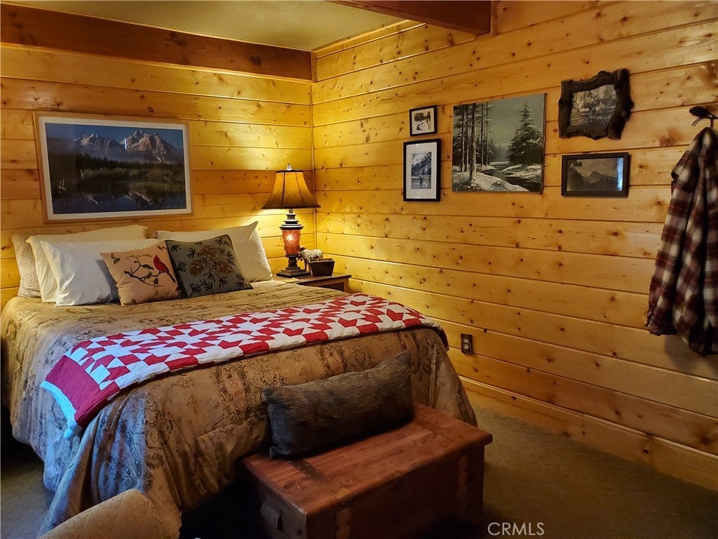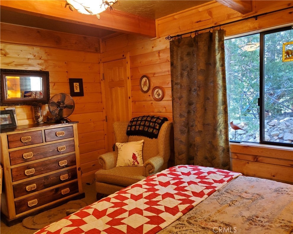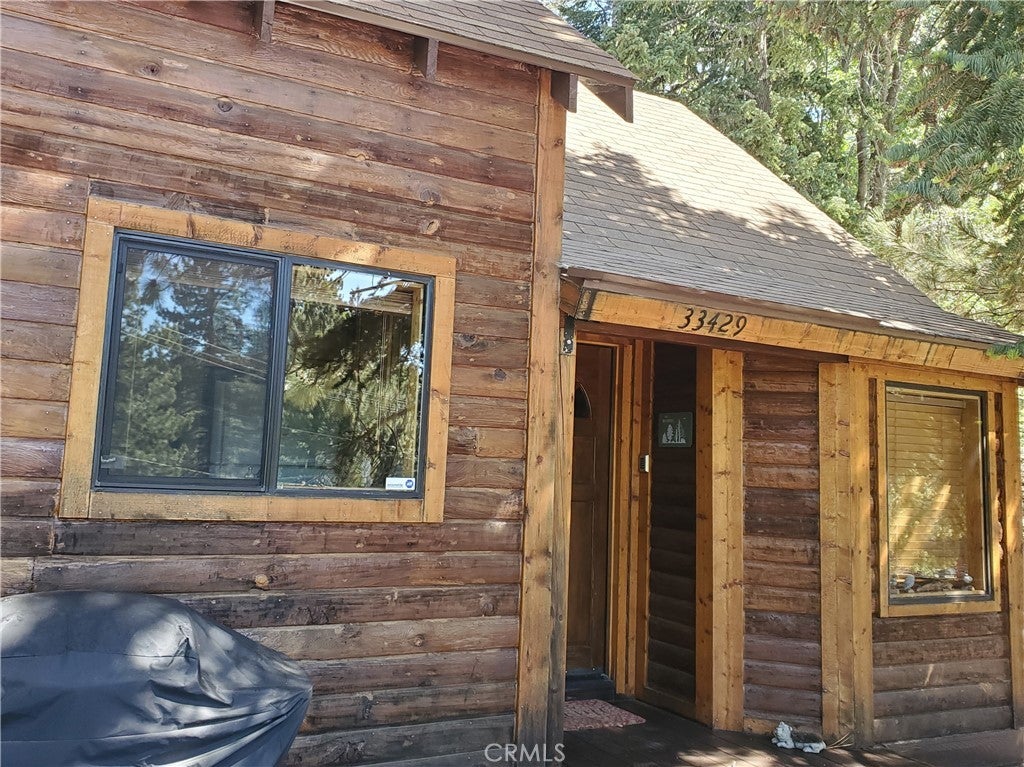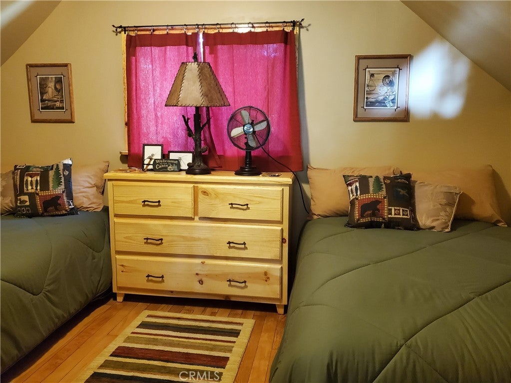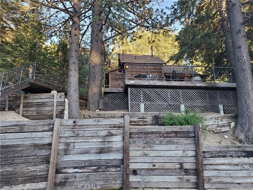 COME GET YOUR SKI ON! Minutes to Snow Valley Ski Resort and SkyPark at Santa’s Village. TURN-KEY lake home retreat. This charming cabin home has been updated and is move in ready. One of a kind, custom-built wrought iron railing leads you up the stairs to the large deck, perfect for relaxing or entertaining. As you enter, you are greeted by 8” wide solid Hickory plank flooring, soaring beamed ceilings, custom lighting, original wood detail, and stacked stone fireplace with a cozy hearth. Curl up with a cup of cocoa and watch movies or play games. The large sliding door leads to a small side deck, perfect for sunning and enjoying the mountain breezes. The kitchen has beautiful new cabinetry and counter tops with lots of storage and a walk-in pantry. Kohler sink, over the range micro, rustic beamed ceiling, even the refrigerator is included. The bathroom is finished with slate floors, an oversized, glass enclosed shower with pine cone tile accents, skylight window, unique custom-made vanity with hand painted sink, and even room for the stacked washer/dryer. One spacious bedroom downstairs and more of that gorgeous wrought iron railing leads you up the stairs to a secondary bedroom with room for two double beds. There are amazing custom light fixtures throughout the home creating the perfect “rustic cabin” feel. The double sized lot gives you plenty of room for outdoor games or even playing in the snow during winter. Green Valley Lake is just a short walk down the street. You will find a playground, country store, coffee house, café, post office, canoe and row boat rentals, and the best fishing on the mountain. Shown by appointment only.