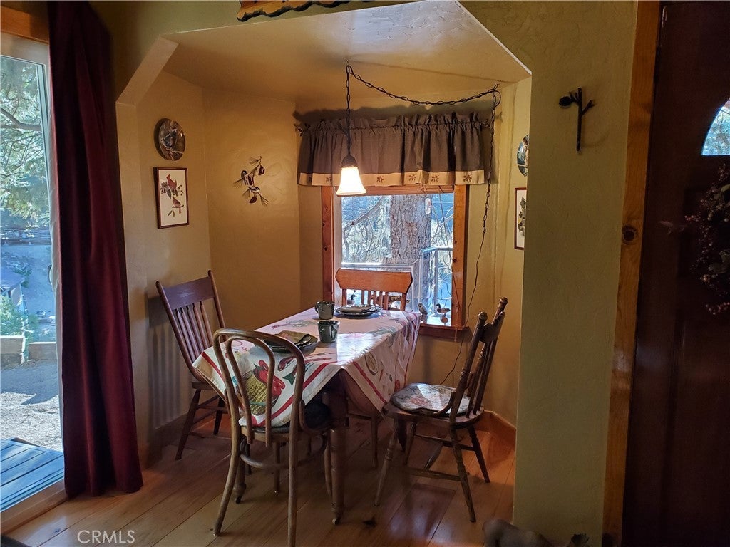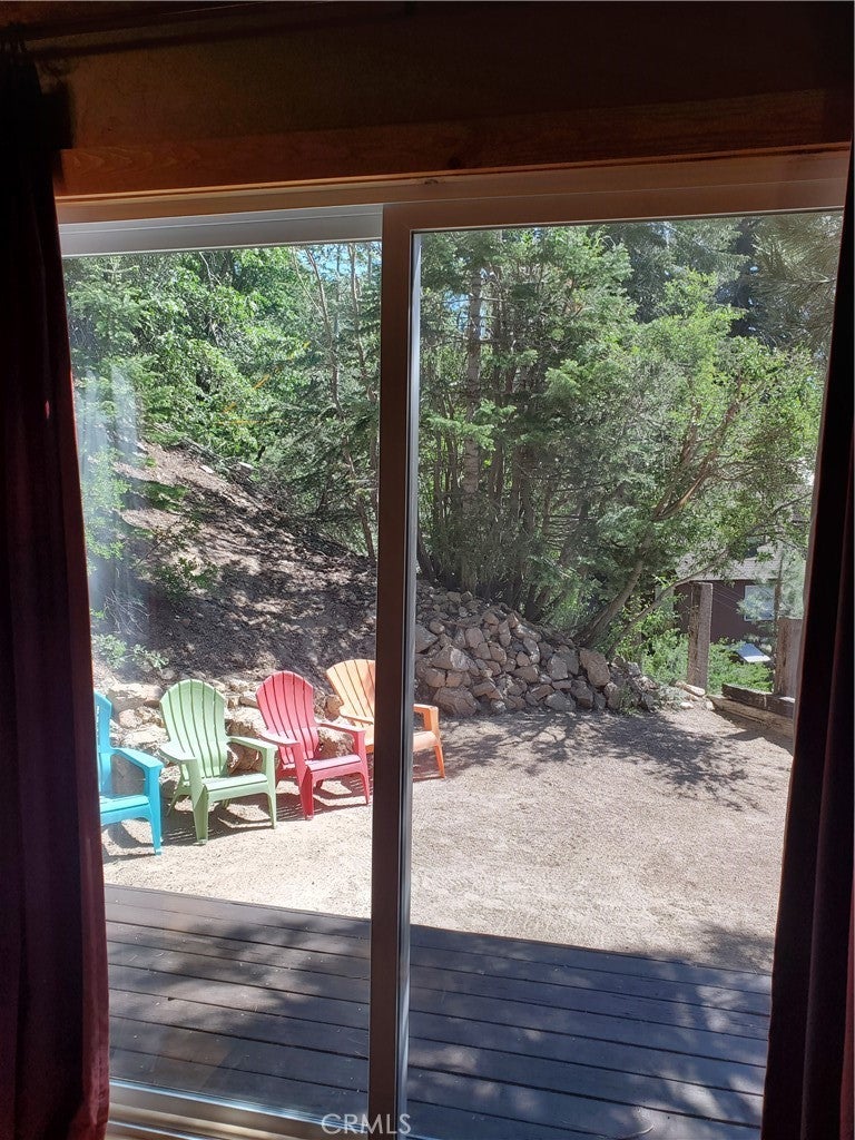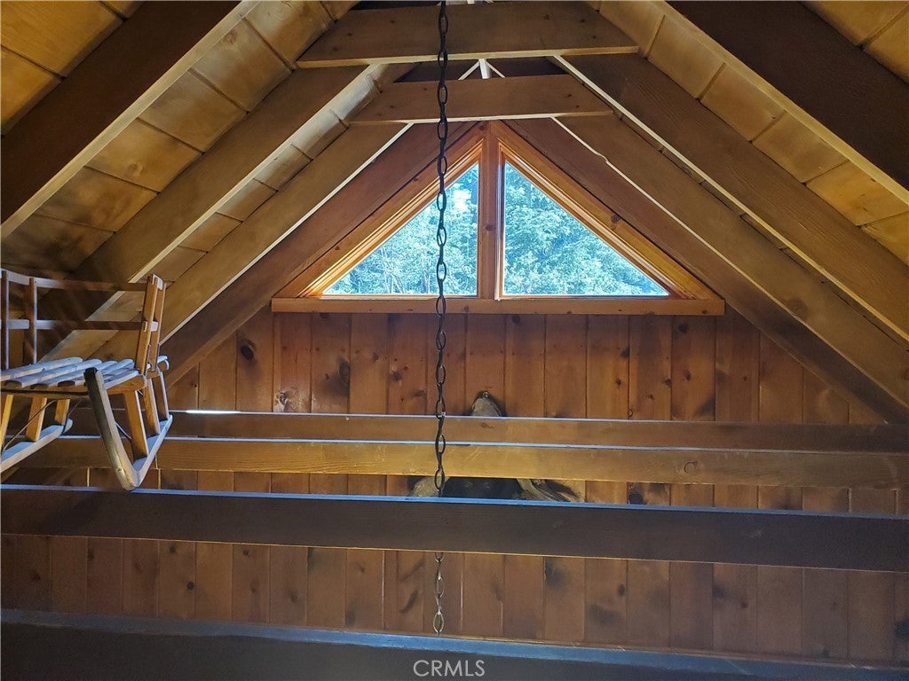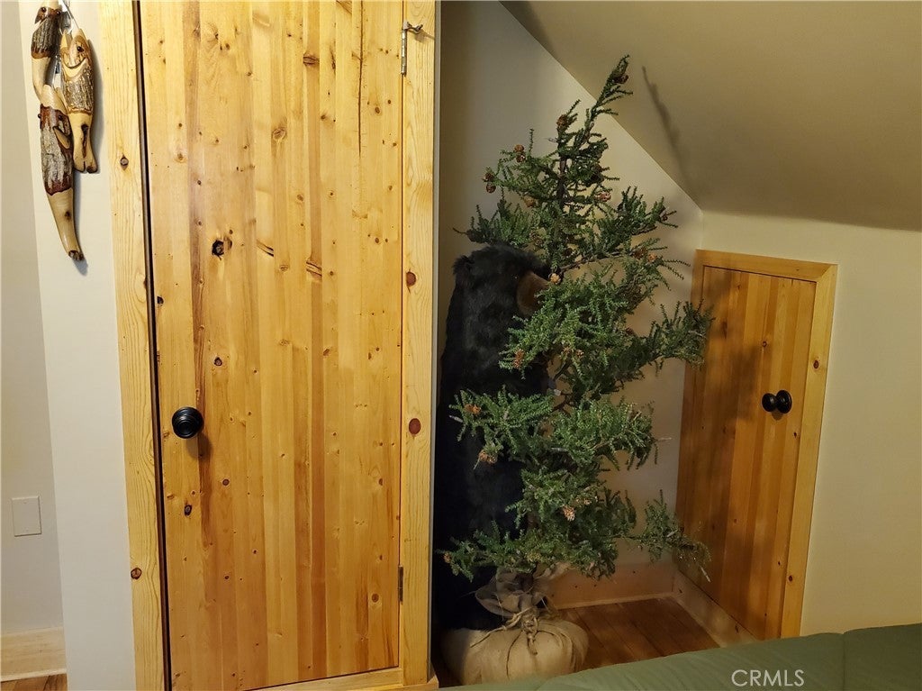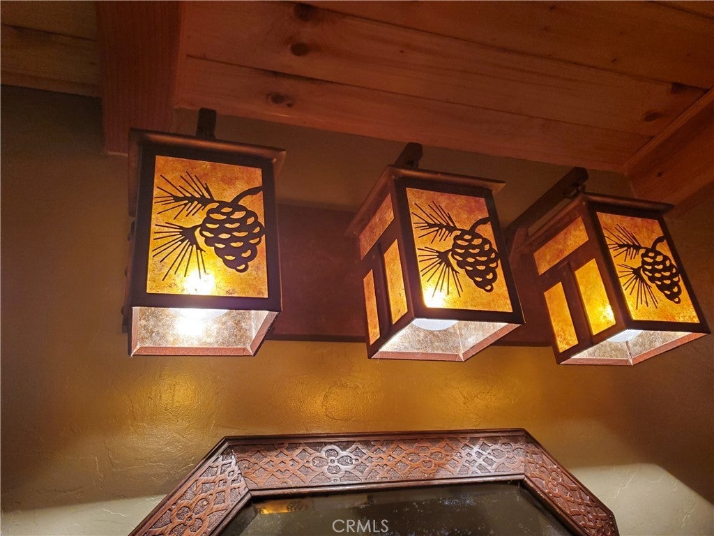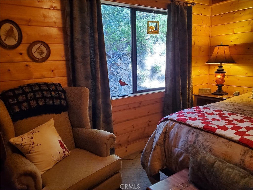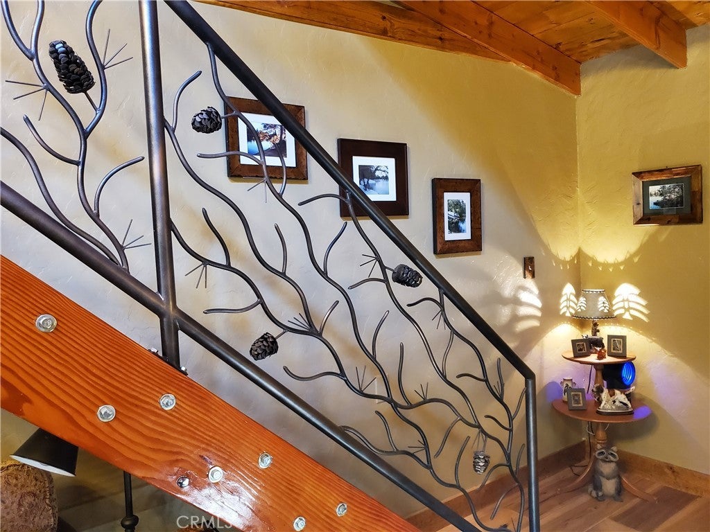 COME GET YOUR SKI ON! Minutes to Snow Valley Ski Resort and SkyPark at Santa’s Village. TURN-KEY lake home retreat. This charming cabin home has been updated and is move in ready. One of a kind, custom-built wrought iron railing leads you up the stairs to the large deck, perfect for relaxing or entertaining. As you enter, you are greeted by 8” wide solid Hickory plank flooring, soaring beamed ceilings, custom lighting, original wood detail, and stacked stone fireplace with a cozy hearth. Curl up with a cup of cocoa and watch movies or play games. The large sliding door leads to a small side deck, perfect for sunning and enjoying the mountain breezes. The kitchen has beautiful new cabinetry and counter tops with lots of storage and a walk-in pantry. Kohler sink, over the range micro, rustic beamed ceiling, even the refrigerator is included. The bathroom is finished with slate floors, an oversized, glass enclosed shower with pine cone tile accents, skylight window, unique custom-made vanity with hand painted sink, and even room for the stacked washer/dryer. One spacious bedroom downstairs and more of that gorgeous wrought iron railing leads you up the stairs to a secondary bedroom with room for two double beds. There are amazing custom light fixtures throughout the home creating the perfect “rustic cabin” feel. The double sized lot gives you plenty of room for outdoor games or even playing in the snow during winter. Green Valley Lake is just a short walk down the street. You will find a playground, country store, coffee house, café, post office, canoe and row boat rentals, and the best fishing on the mountain. Shown by appointment only.
