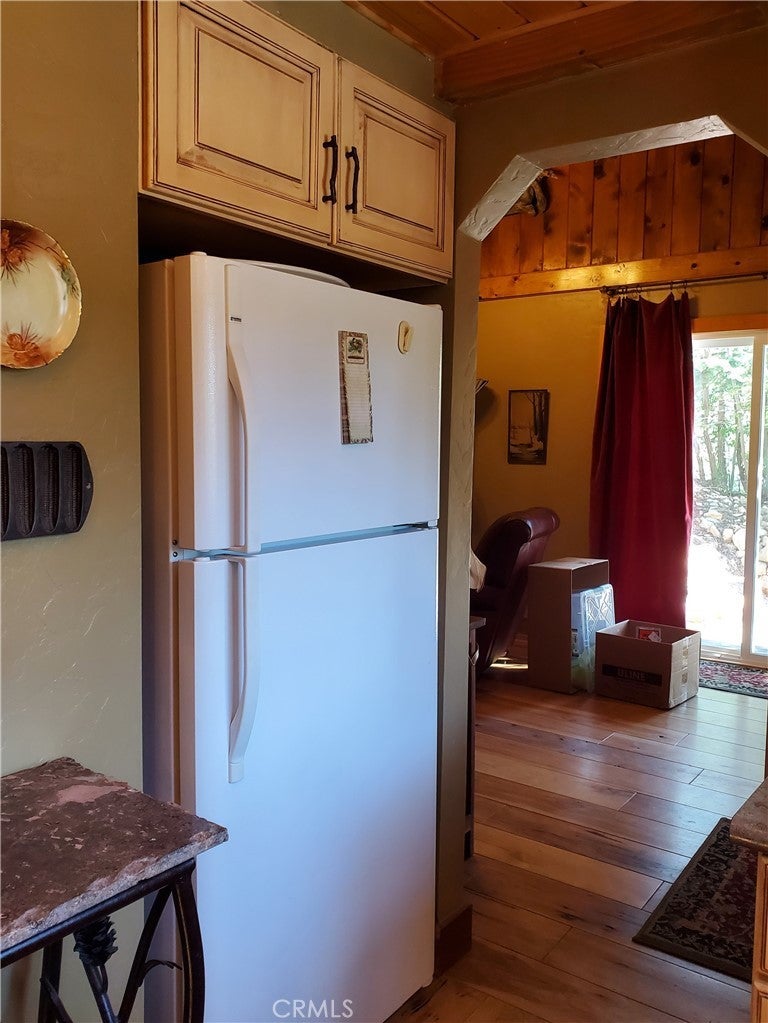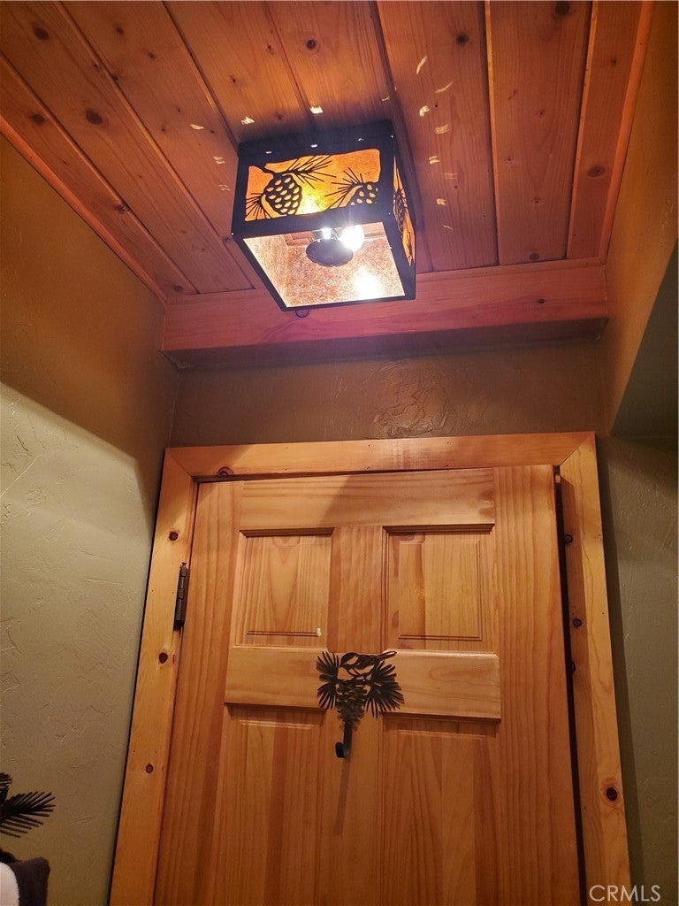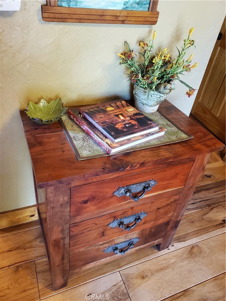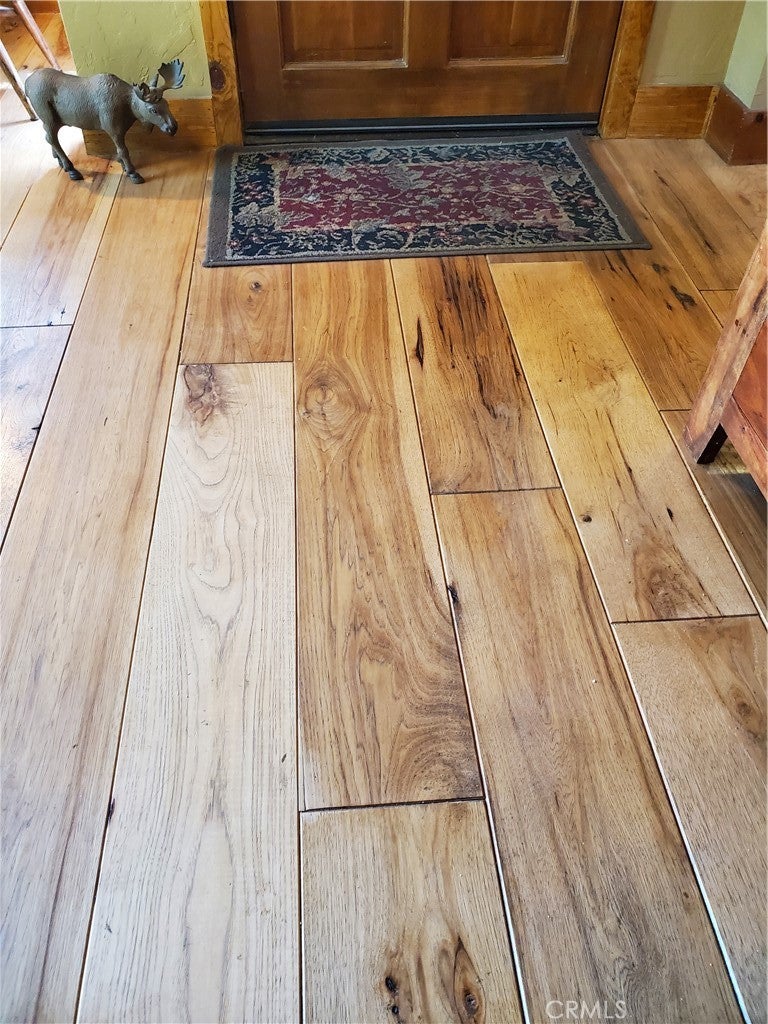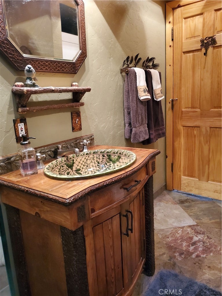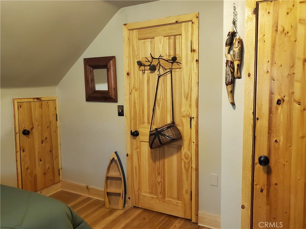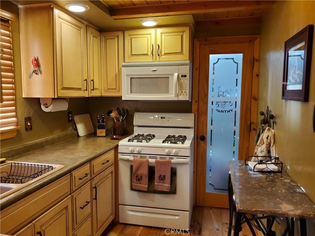COME GET YOUR SKI ON! Minutes to Snow Valley Ski Resort and SkyPark at Santa’s Village. TURN-KEY lake home retreat. This charming cabin home has been updated and is move in ready. One of a kind, custom-built wrought iron railing leads you up the stairs to the large deck, perfect for relaxing or entertaining. As you enter, you are greeted by 8” wide solid Hickory plank flooring, soaring beamed ceilings, custom lighting, original wood detail, and stacked stone fireplace with a cozy hearth. Curl up with a cup of cocoa and watch movies or play games. The large sliding door leads to a small side deck, perfect for sunning and enjoying the mountain breezes. The kitchen has beautiful new cabinetry and counter tops with lots of storage and a walk-in pantry. Kohler sink, over the range micro, rustic beamed ceiling, even the refrigerator is included. The bathroom is finished with slate floors, an oversized, glass enclosed shower with pine cone tile accents, skylight window, unique custom-made vanity with hand painted sink, and even room for the stacked washer/dryer. One spacious bedroom downstairs and more of that gorgeous wrought iron railing leads you up the stairs to a secondary bedroom with room for two double beds. There are amazing custom light fixtures throughout the home creating the perfect “rustic cabin” feel. The double sized lot gives you plenty of room for outdoor games or even playing in the snow during winter. Green Valley Lake is just a short walk down the street. You will find a playground, country store, coffee house, café, post office, canoe and row boat rentals, and the best fishing on the mountain. Shown by appointment only.