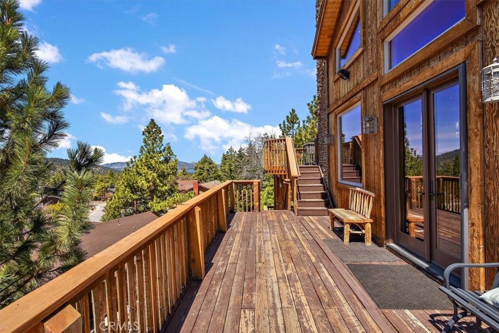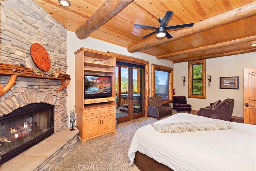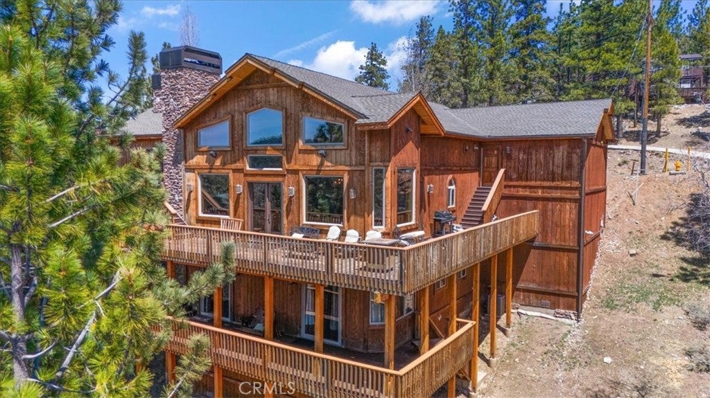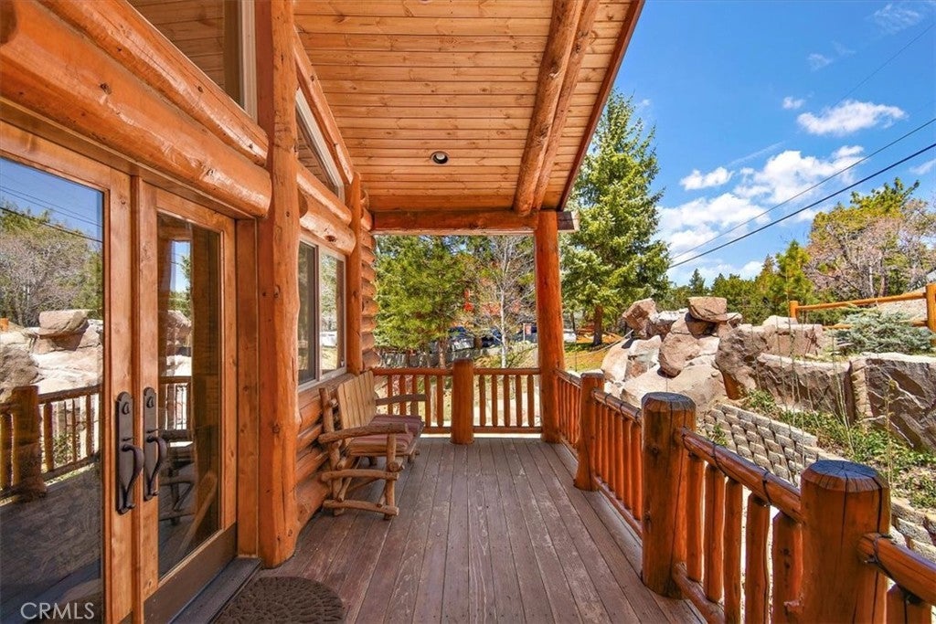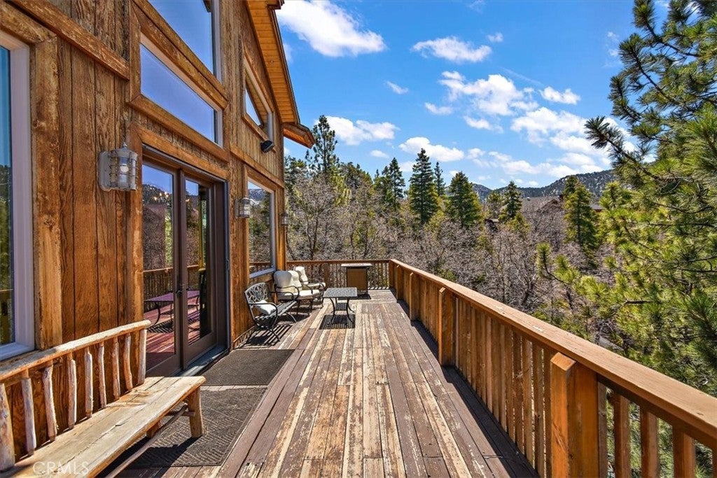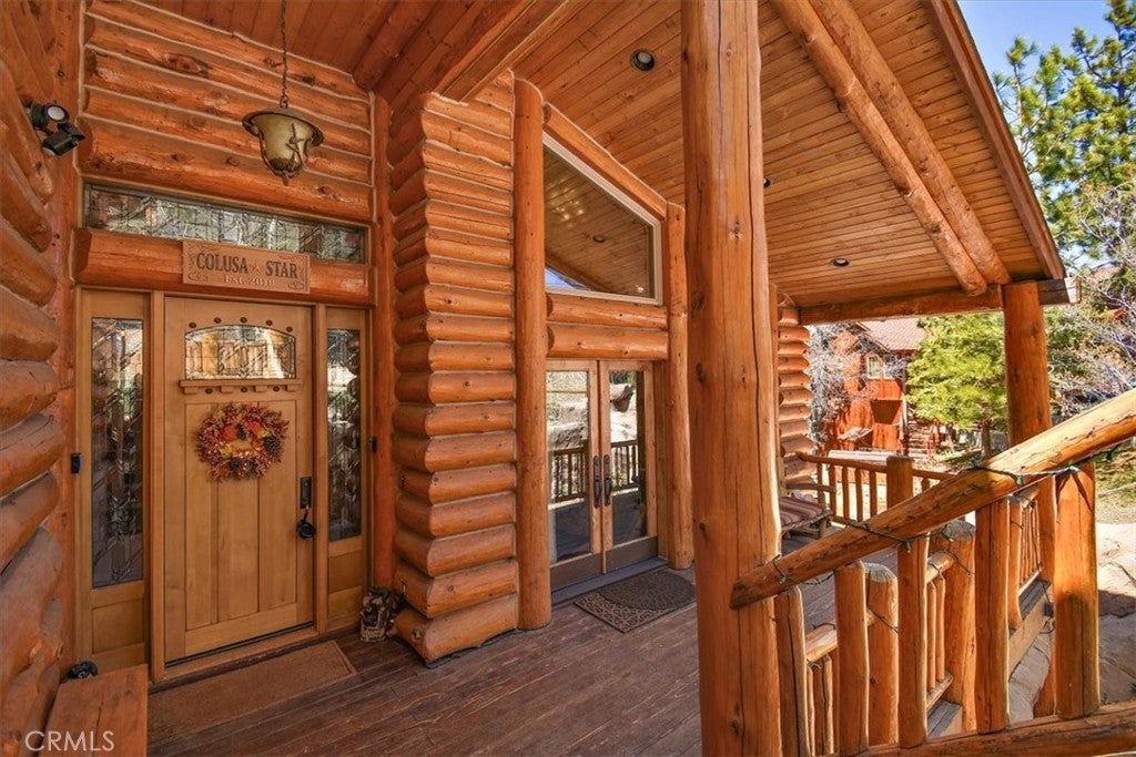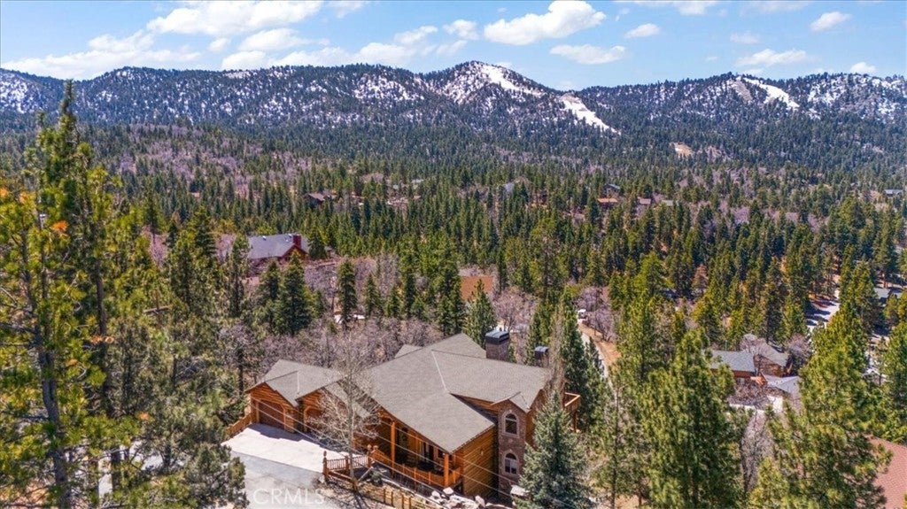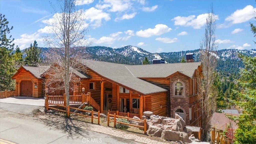 This epic custom-built log home has some of the most commanding views of the lake and ski-slopes in Moonridge. The pinnacle of luxury, this property has so many amazing amenities! Gourmet stainless-steel kitchen open to massive dining room with wide views of the slopes through the full wall of display windows accented by log and stonework; Five stone fireplaces including one at the deck across from the spa just outside the primary suite and one inside the primary suite along with a wet bar; detailed artisanal work in the custom laid mosaic floor tiles, custom carved fireplace mantles with artistic details, and layers upon layers of knotty-pine log accents. This property has many entertaining spaces inside and out, including a parlor off the entry with a fireplace, lofted game room with another fireplace, wet bar and counter seating, a shady front porch, a deck off the loft with lake views, a deck off the dining area with ski slope views, a secluded deck off the primary suite with spa, and a deck off the ground floor with more views. There’s also a fifth sleeping area off the lower hallway. In addition to the mountain charms, this home has modern features such as Nest Thermostats, exterior cameras, two dual-zoned forced-air heating units, air-conditioning unit on the top floor, two tankless water heaters, heated driveway, heated towel-rod and travertine floors in the primary suite, a gorgeous outdoor water feature, and three-car attached garage. Located near ski slopes, national forest hiking trails, shopping and dining, events and activities, this property has been a successful vacation rental and could make a wonderful family getaway or peaceful residence where the closeness to nature makes profound memories.