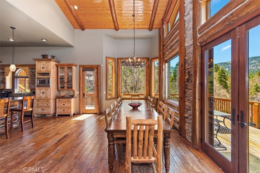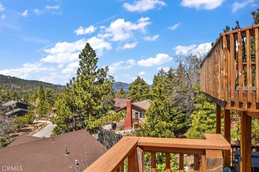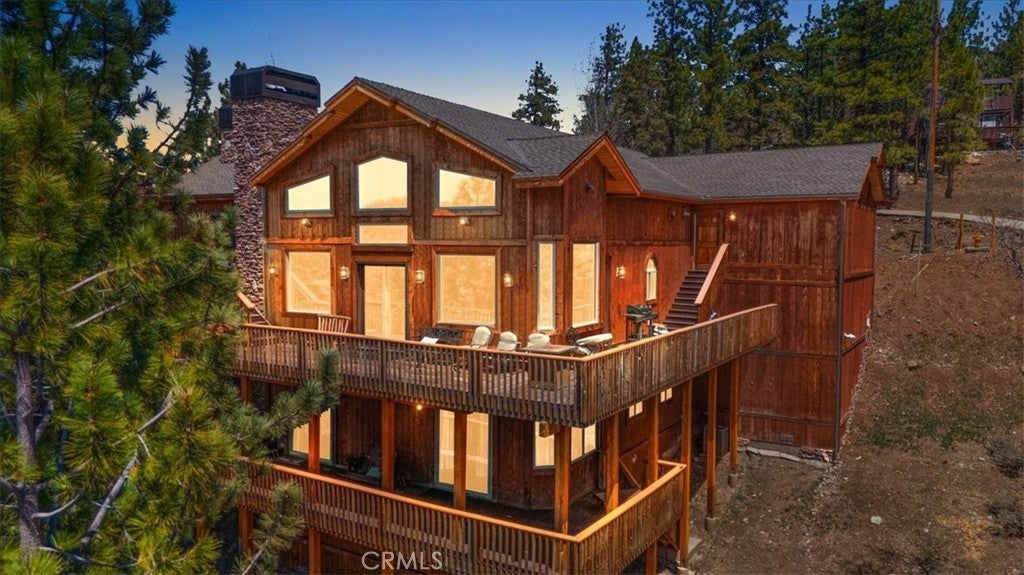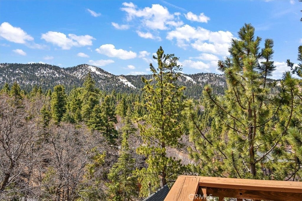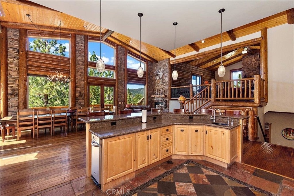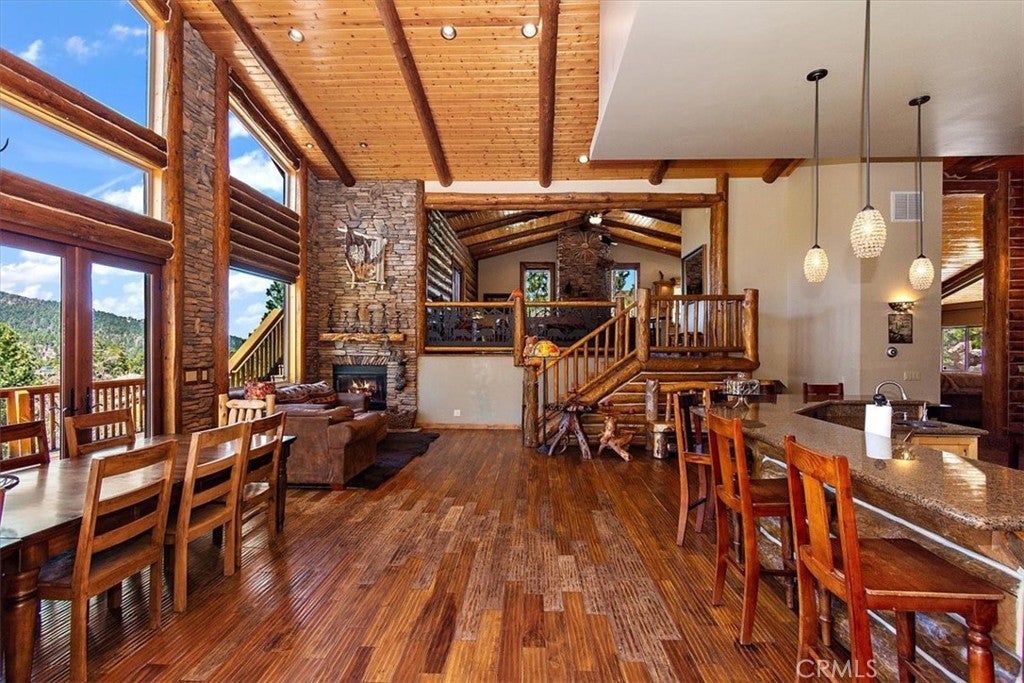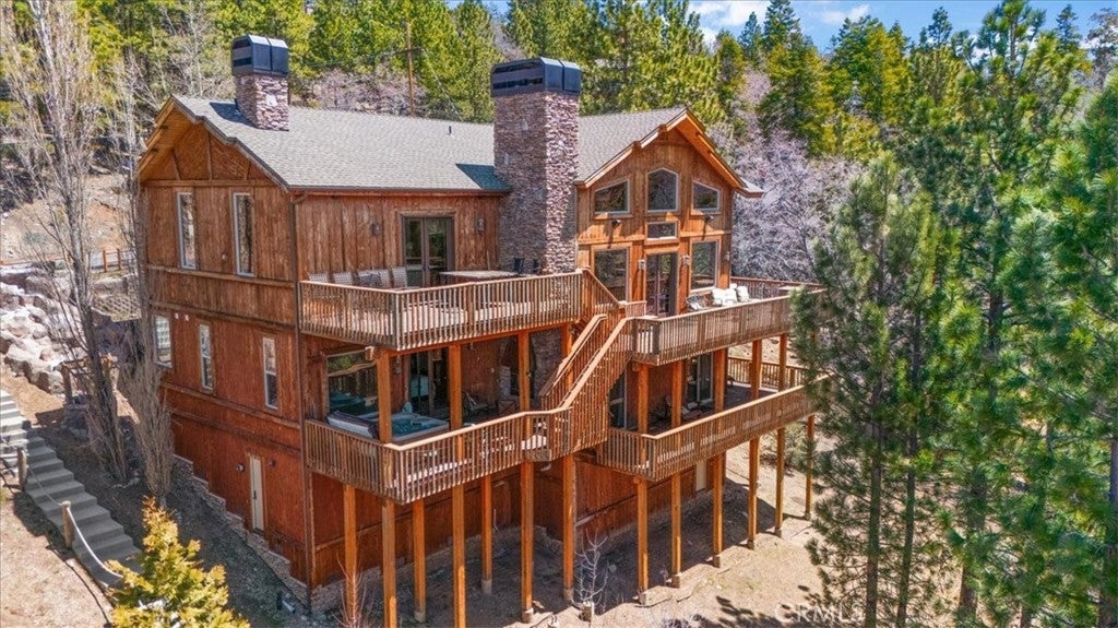 This epic custom-built log home has some of the most commanding views of the lake and ski-slopes in Moonridge. The pinnacle of luxury, this property has so many amazing amenities! Gourmet stainless-steel kitchen open to massive dining room with wide views of the slopes through the full wall of display windows accented by log and stonework; Five stone fireplaces including one at the deck across from the spa just outside the primary suite and one inside the primary suite along with a wet bar; detailed artisanal work in the custom laid mosaic floor tiles, custom carved fireplace mantles with artistic details, and layers upon layers of knotty-pine log accents. This property has many entertaining spaces inside and out, including a parlor off the entry with a fireplace, lofted game room with another fireplace, wet bar and counter seating, a shady front porch, a deck off the loft with lake views, a deck off the dining area with ski slope views, a secluded deck off the primary suite with spa, and a deck off the ground floor with more views. There’s also a fifth sleeping area off the lower hallway. In addition to the mountain charms, this home has modern features such as Nest Thermostats, exterior cameras, two dual-zoned forced-air heating units, air-conditioning unit on the top floor, two tankless water heaters, heated driveway, heated towel-rod and travertine floors in the primary suite, a gorgeous outdoor water feature, and three-car attached garage. Located near ski slopes, national forest hiking trails, shopping and dining, events and activities, this property has been a successful vacation rental and could make a wonderful family getaway or peaceful residence where the closeness to nature makes profound memories.