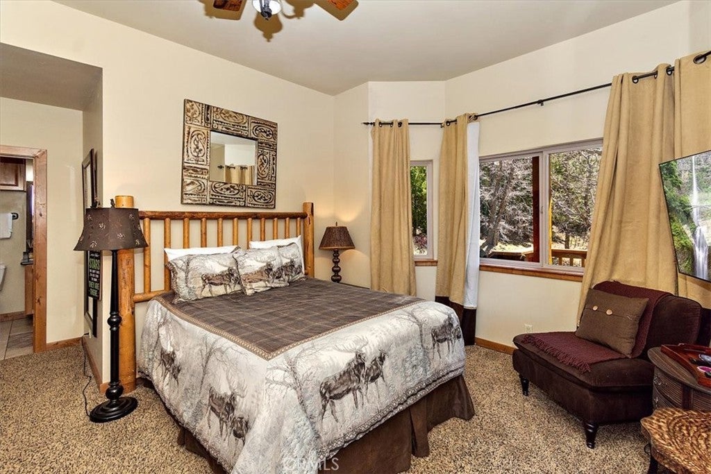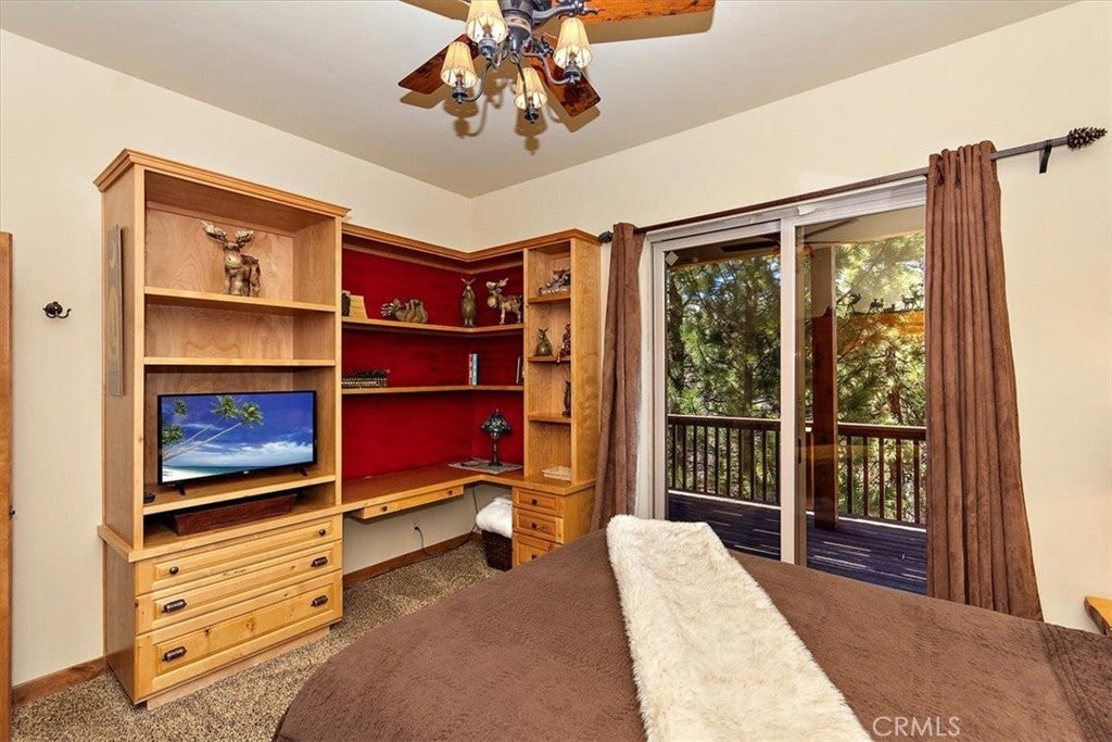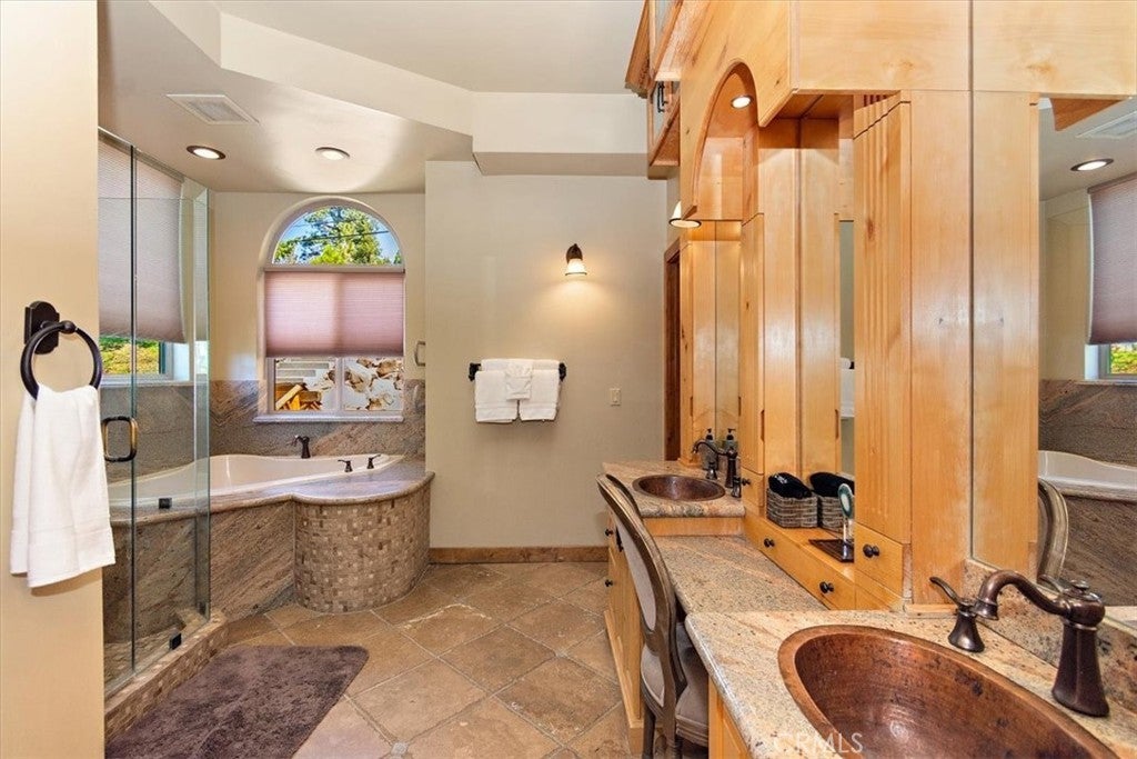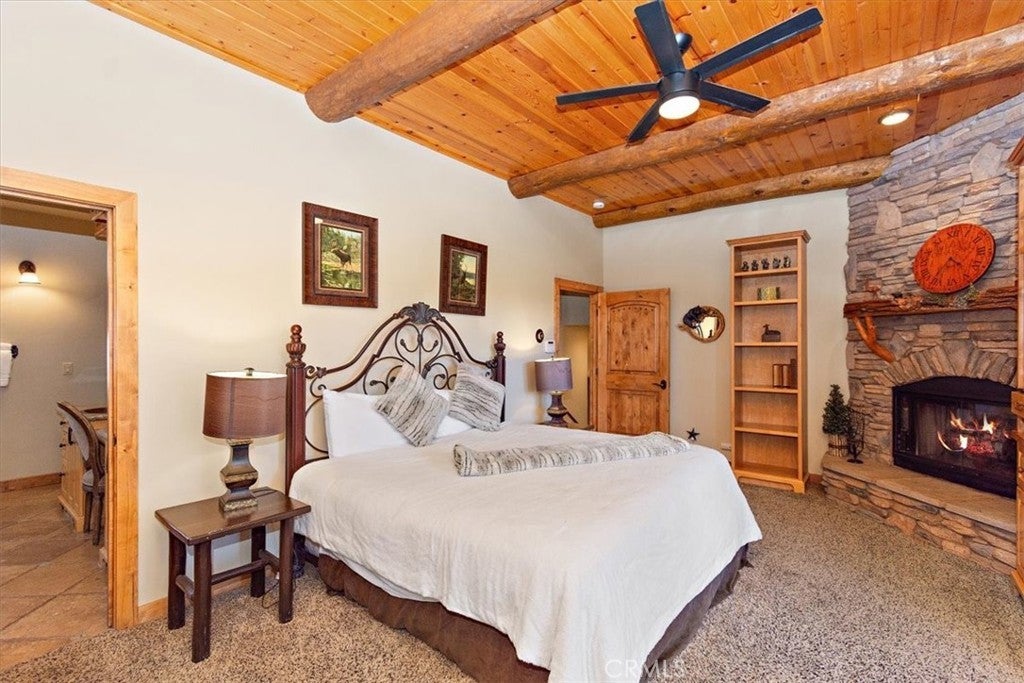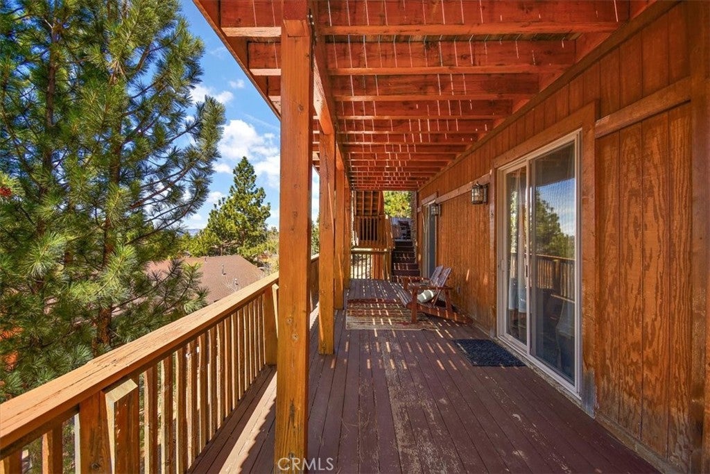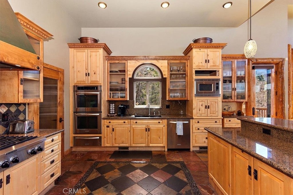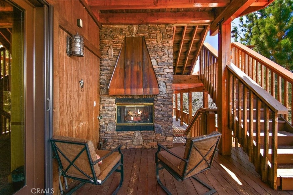 This epic custom-built log home has some of the most commanding views of the lake and ski-slopes in Moonridge. The pinnacle of luxury, this property has so many amazing amenities! Gourmet stainless-steel kitchen open to massive dining room with wide views of the slopes through the full wall of display windows accented by log and stonework; Five stone fireplaces including one at the deck across from the spa just outside the primary suite and one inside the primary suite along with a wet bar; detailed artisanal work in the custom laid mosaic floor tiles, custom carved fireplace mantles with artistic details, and layers upon layers of knotty-pine log accents. This property has many entertaining spaces inside and out, including a parlor off the entry with a fireplace, lofted game room with another fireplace, wet bar and counter seating, a shady front porch, a deck off the loft with lake views, a deck off the dining area with ski slope views, a secluded deck off the primary suite with spa, and a deck off the ground floor with more views. There’s also a fifth sleeping area off the lower hallway. In addition to the mountain charms, this home has modern features such as Nest Thermostats, exterior cameras, two dual-zoned forced-air heating units, air-conditioning unit on the top floor, two tankless water heaters, heated driveway, heated towel-rod and travertine floors in the primary suite, a gorgeous outdoor water feature, and three-car attached garage. Located near ski slopes, national forest hiking trails, shopping and dining, events and activities, this property has been a successful vacation rental and could make a wonderful family getaway or peaceful residence where the closeness to nature makes profound memories.