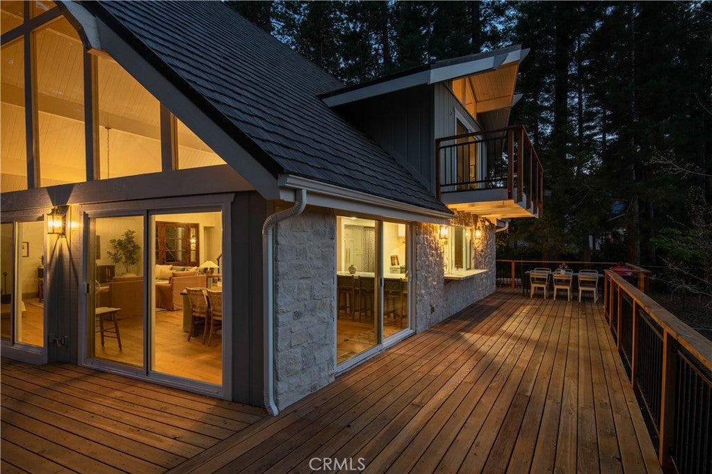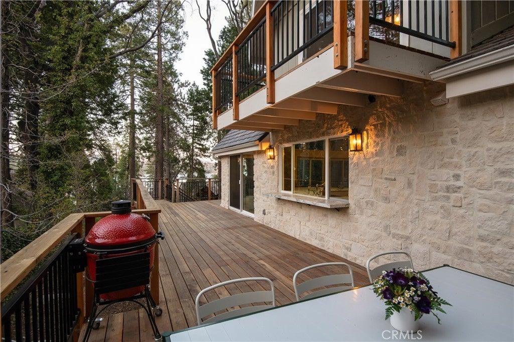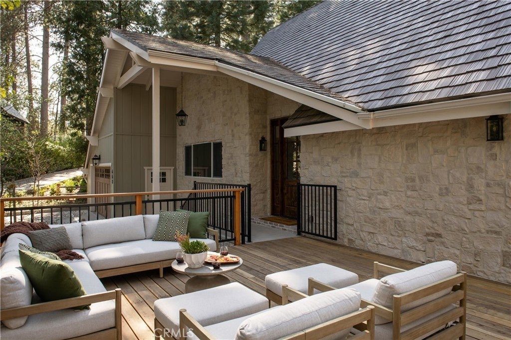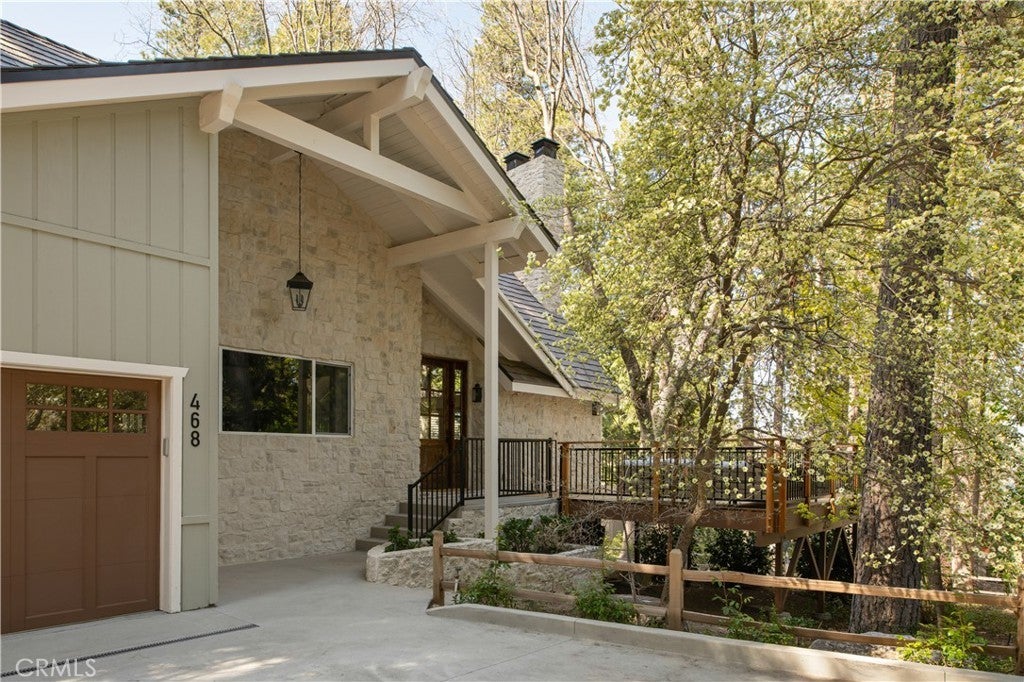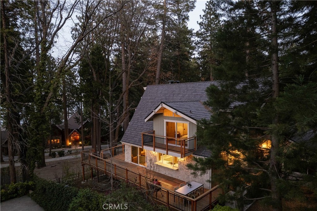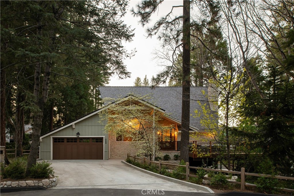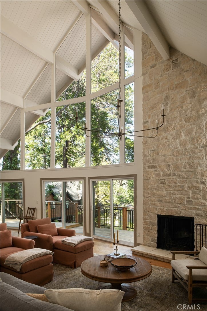 The SkyStone LakeHouse. Welcome to luxurious lake living in the exclusive, guard-gated community of Point Hamiltair—Lake Arrowhead’s most prestigious and sought-after enclave. Known for its 24/7 security, concierge services for home upkeep, and a long-standing legacy of celebrity and socialite residents, this community offers the ultimate in comfort, privacy, and prestige. Located directly across from a $12 million estate and just a short stroll or golf cart ride to your private boat slip, this exquisitely remodeled lakeview home blends timeless mountain charm with top-tier modern upgrades—offering a true turnkey lifestyle. From the moment you arrive, you’re greeted by breathtaking lake and tree views framed by soaring high-beam A-frame ceilings and an iconic wall of windows. Natural light pours into the open-concept living space, where wide plank European white oak floors and a floor-to-ceiling stone fireplace create the perfect balance of warmth and sophistication. The spacious living area is ideal for entertaining, with abundant seating to relax and soak in the views. The gourmet kitchen is a designer’s dream, featuring marble countertops, custom cabinetry, a show-stopping Ilve Italian range, European fixtures, and a convenient pass-through shelf that connects directly to the expansive outdoor dining area. Step outside to your wrap-around deck, thoughtfully designed with multiple lounge and dining zones, a built-in BBQ area, and serene spaces to enjoy al fresco meals beneath the stars. The main-level primary suite is a tranquil retreat with a walk-in closet and spa-inspired ensuite bathroom, complete with marble counters, a custom tile steam shower, and luxury plumbing fixtures. Upstairs, two bright guest bedrooms with vaulted ceilings share a stylish full bath with a walk-in shower and designer vanity. The lower level offers a brick-floored entertainment lounge with a second fireplace, wet bar, game area, ¾ bath, and direct access to the fenced yard and lower patio. Additional upgrades include a new roof, rebuilt decks and railings, exterior stonework, concrete walkways, professional landscaping, and a subterranean sprinkler system. Offered beautifully furnished (furniture negotiable), this lake view masterpiece is ready to enjoy. A rare opportunity to own in one of Lake Arrowhead’s most iconic and luxurious communities.