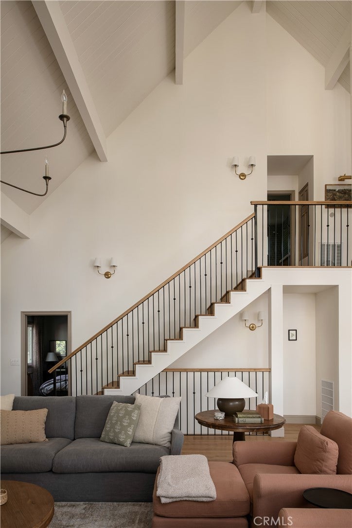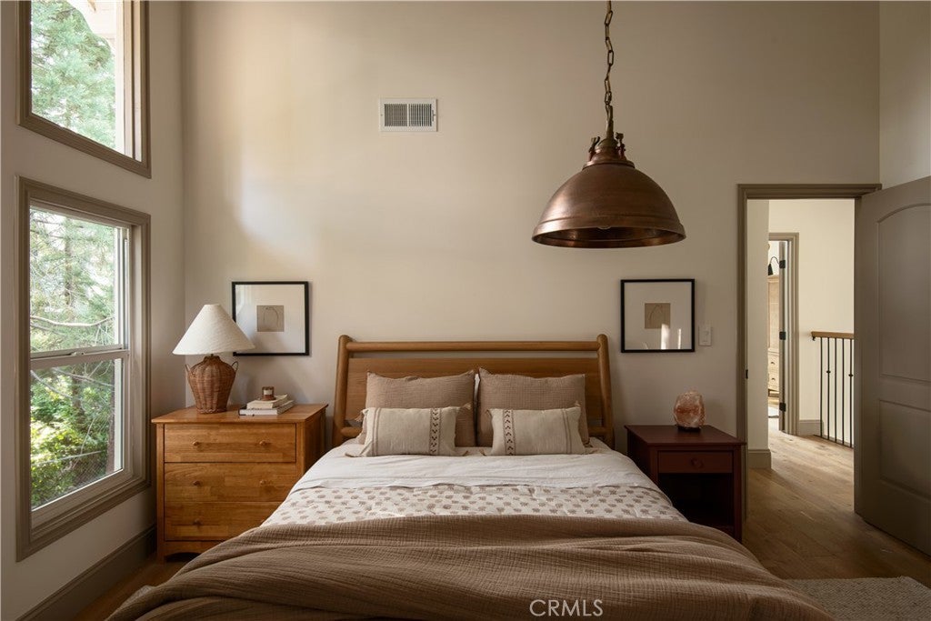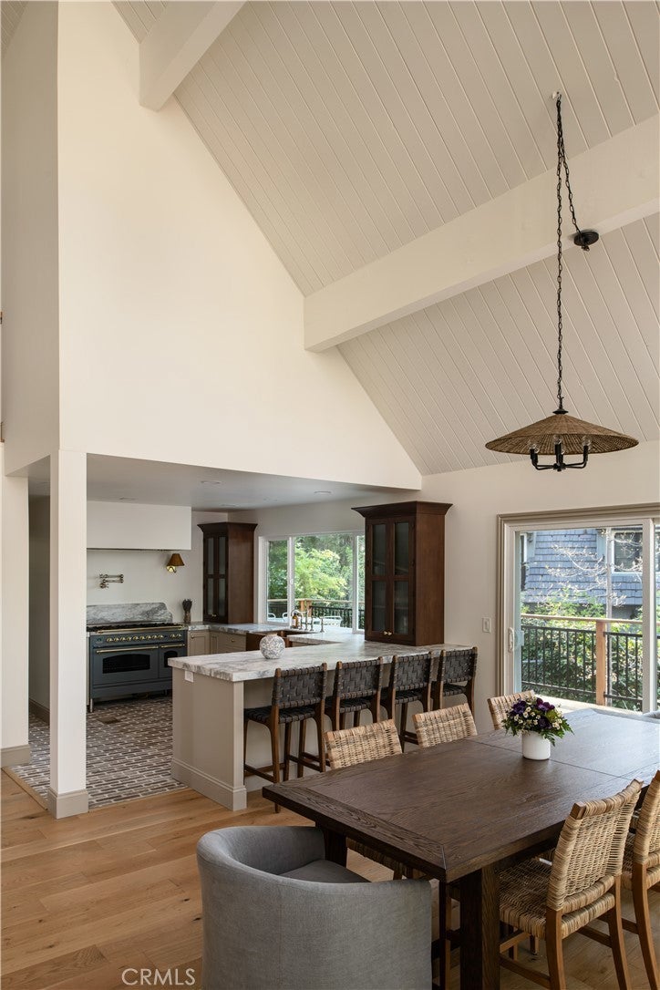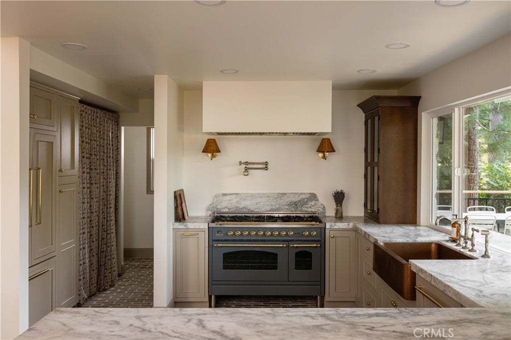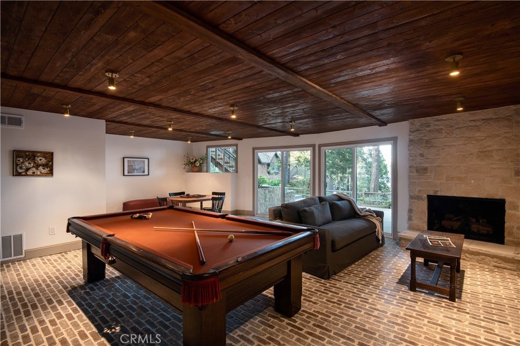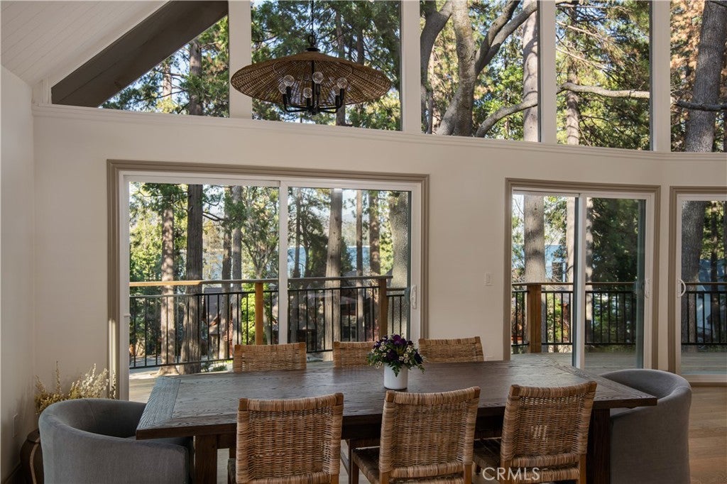 The SkyStone LakeHouse. Welcome to luxurious lake living in the exclusive, guard-gated community of Point Hamiltair—Lake Arrowhead’s most prestigious and sought-after enclave. Known for its 24/7 security, concierge services for home upkeep, and a long-standing legacy of celebrity and socialite residents, this community offers the ultimate in comfort, privacy, and prestige. Located directly across from a $12 million estate and just a short stroll or golf cart ride to your private boat slip, this exquisitely remodeled lakeview home blends timeless mountain charm with top-tier modern upgrades—offering a true turnkey lifestyle. From the moment you arrive, you’re greeted by breathtaking lake and tree views framed by soaring high-beam A-frame ceilings and an iconic wall of windows. Natural light pours into the open-concept living space, where wide plank European white oak floors and a floor-to-ceiling stone fireplace create the perfect balance of warmth and sophistication. The spacious living area is ideal for entertaining, with abundant seating to relax and soak in the views. The gourmet kitchen is a designer’s dream, featuring marble countertops, custom cabinetry, a show-stopping Ilve Italian range, European fixtures, and a convenient pass-through shelf that connects directly to the expansive outdoor dining area. Step outside to your wrap-around deck, thoughtfully designed with multiple lounge and dining zones, a built-in BBQ area, and serene spaces to enjoy al fresco meals beneath the stars. The main-level primary suite is a tranquil retreat with a walk-in closet and spa-inspired ensuite bathroom, complete with marble counters, a custom tile steam shower, and luxury plumbing fixtures. Upstairs, two bright guest bedrooms with vaulted ceilings share a stylish full bath with a walk-in shower and designer vanity. The lower level offers a brick-floored entertainment lounge with a second fireplace, wet bar, game area, ¾ bath, and direct access to the fenced yard and lower patio. Additional upgrades include a new roof, rebuilt decks and railings, exterior stonework, concrete walkways, professional landscaping, and a subterranean sprinkler system. Offered beautifully furnished (furniture negotiable), this lake view masterpiece is ready to enjoy. A rare opportunity to own in one of Lake Arrowhead’s most iconic and luxurious communities.