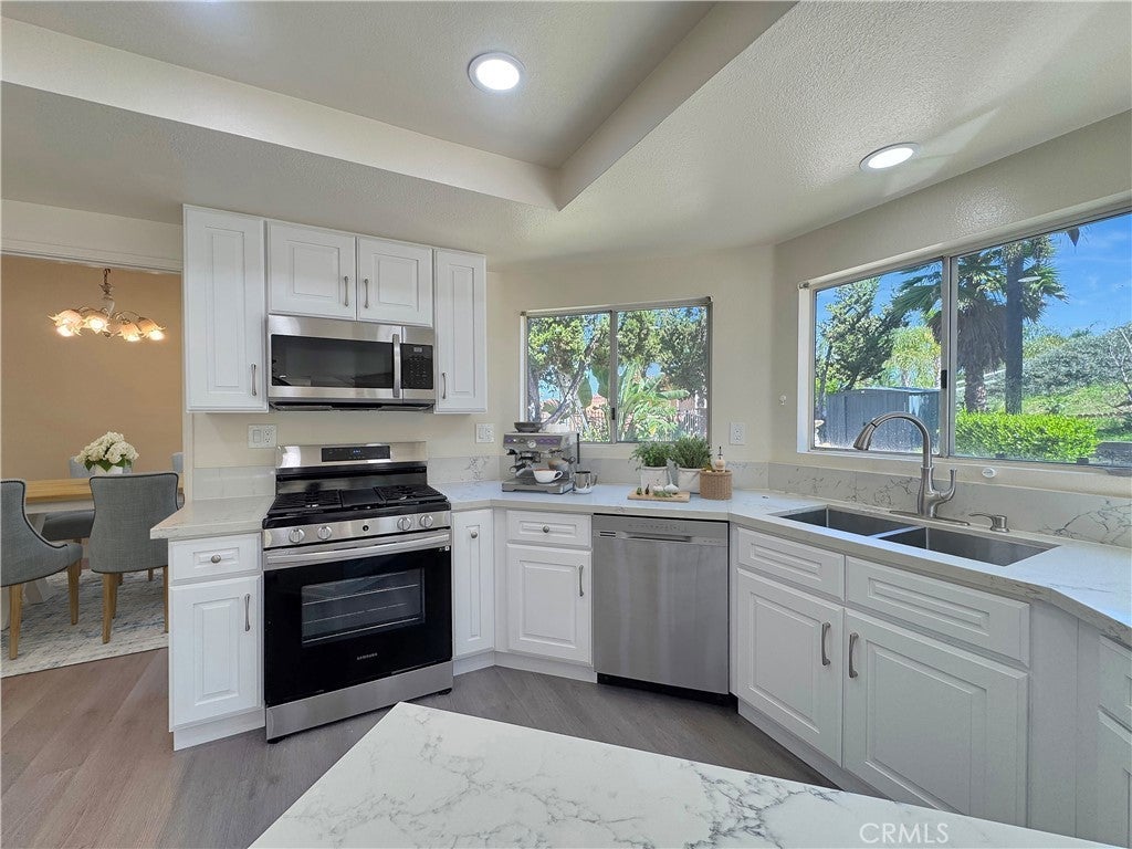 Welcome to this beautifully updated 4-bedroom, 3-bathroom home nestled in an exclusive and private neighborhood surrounded by rolling hills, fine dining, and premier shopping. Set on an oversized lot of over 13,000 square feet, this property offers space, style, and serenity in one of the most desirable areas. A long, extended driveway provides ample parking and leads to a spacious 3-car garage. Step inside to a grand foyer with an elegant staircase, setting the tone for the home’s inviting and open layout. The large living and dining rooms are perfect for entertaining, while the oversized family room, complete with a cozy fireplace, flows seamlessly into the recently remodeled kitchen—featuring modern finishes and ample storage. All three bathrooms have been tastefully renovated, and each of the four bedrooms offers generous space and large closets, ensuring comfort for the whole family. The upgraded flooring throughout the home adds a touch of sophistication and easy maintenance. The private backyard is a tranquil retreat, surrounded by mature trees and lush landscaping that provide natural shade and a peaceful ambiance. Whether hosting guests or enjoying quiet evenings, this outdoor space is a true highlight. Additional upgrades include a newer HVAC system, making this home move-in ready and energy-efficient. Homes in this unique neighborhood sit at varying elevations, creating a custom, upscale feel throughout the community. Conveniently located near major freeways, yet tucked away in a serene setting, this is a rare opportunity you won’t want to miss.