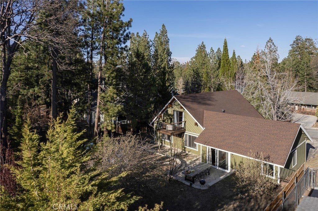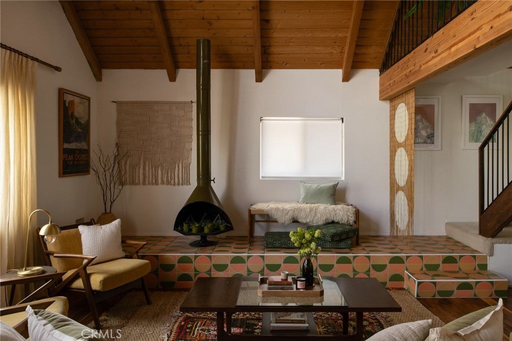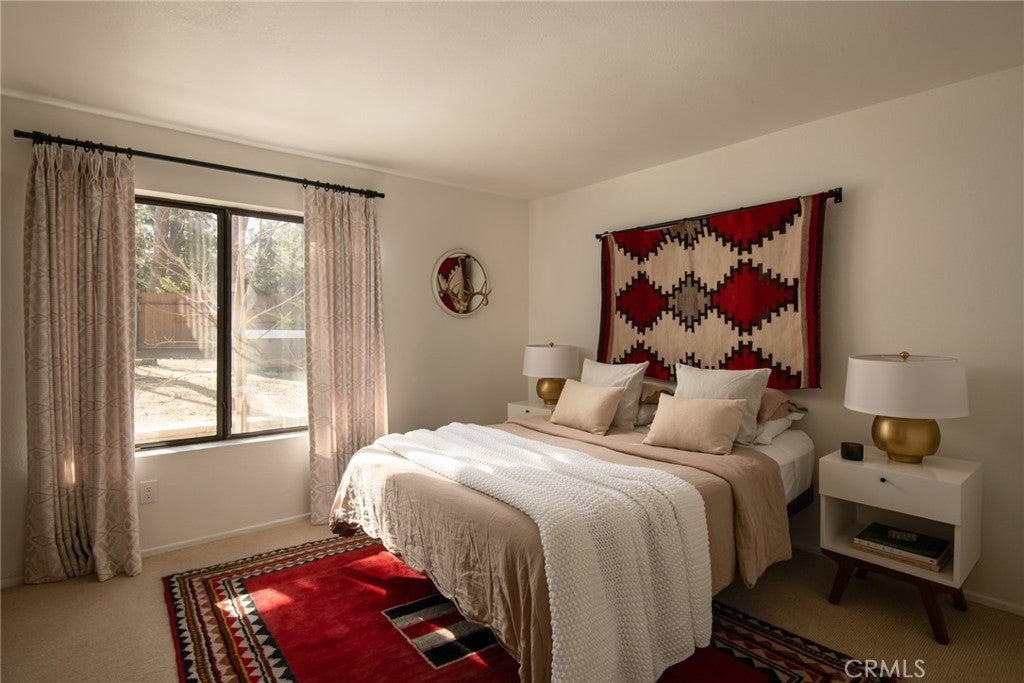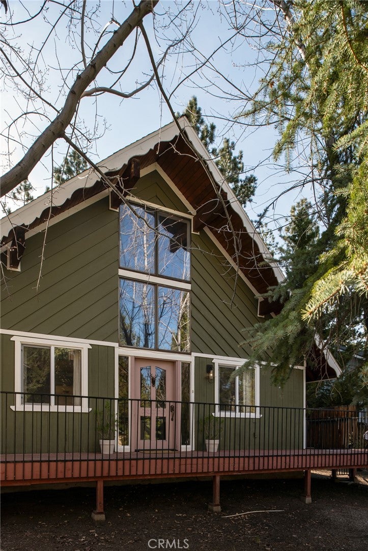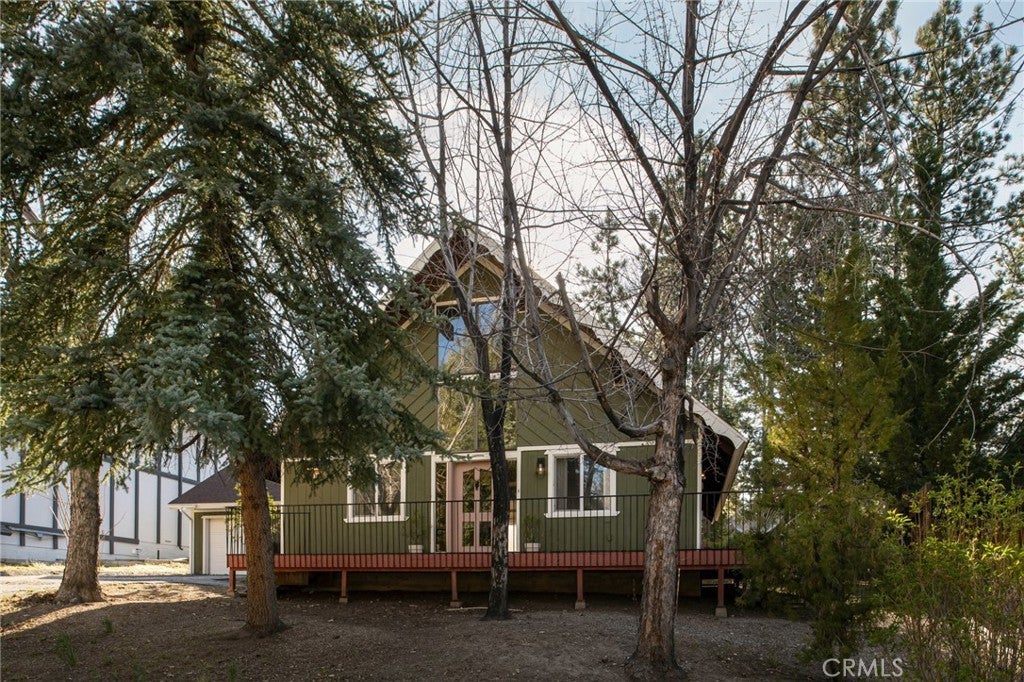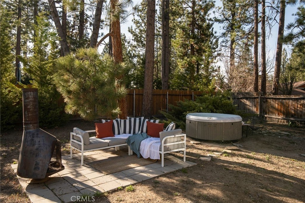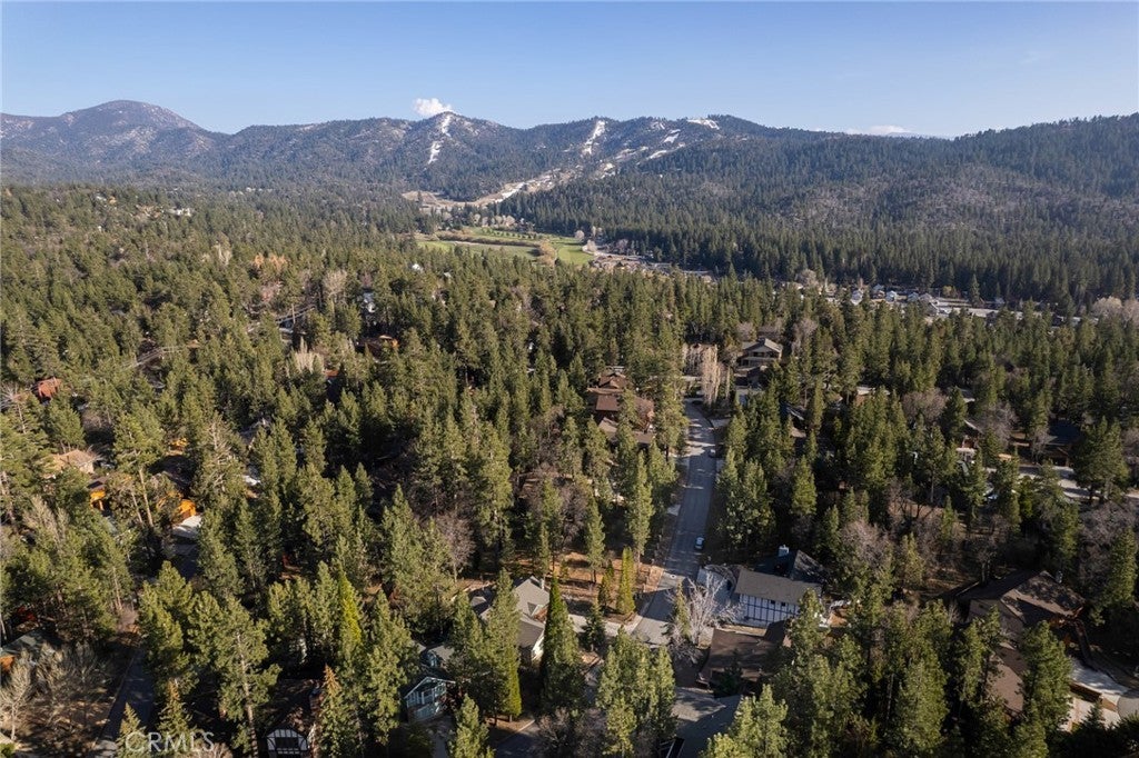 Welcome to the Kitchy Cabin, a storied alpine-chic getaway that blends cozy cabin vibes with thoughtful designer flair—right in the heart of Big Bear. This charming 3-bedroom, 2-bath home sits on a flat lot in the highly sought-after Alpine Woods neighborhood of Fox Farm and is Moonridge adjacent. A true mountain haven, the property features a spacious and private backyard complete with a private hot tub and freestanding, retro-modern fireplace—perfect for unwinding after a day on the slopes or trails. Inside, the home boasts personality and warmth throughout, with colorful wallpaper and tile accents that add vibrant interest. A raised platform on which the centerpiece vintage fireplace sits is tiled with eye-popping mosaic tiles that seamlessly flow into the kitchen, creating a bold visual connection between the living and hosting spaces. A-frame ceilings and cathedral style windows create an open and airy space amongst the cozy design. The kitchen is a cook’s dream, boasting a double oven and smart refridgerator that plays music, searches recipes, and even takes notes. The adjacent large dining area offers plenty of space for gatherings, whether it’s family dinners or hosting friends for the weekend. The two main-level bedrooms are conveniently laid out, sharing a full bath that features a soaking tub and zen-like atmosphere. A character rich bonus lounge/game room completes the main level and opens directly into the backyard. The home also includes a convenient laundry area and thoughtful design throughout.The primary suite is tucked privately on its own level beneath the classic A-frame beamed ceiling, soaring 10 feet high, a cozy wood-burning Malm fireplace, and direct access to a private patio. With a central location near Big Bear Lake, ski resorts, hiking trails, and the Village, this home blends classic mountain style with thoughtful design and modern comfort in one of Big Bear’s most desirable areas.