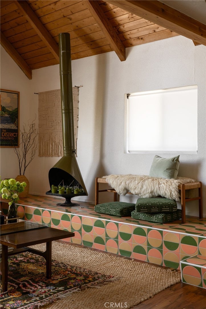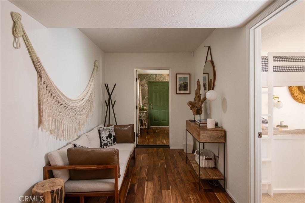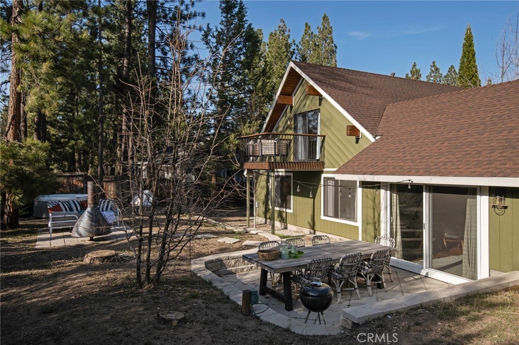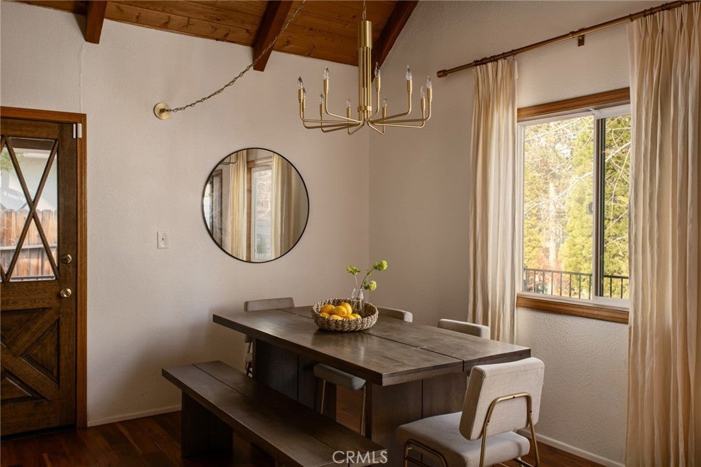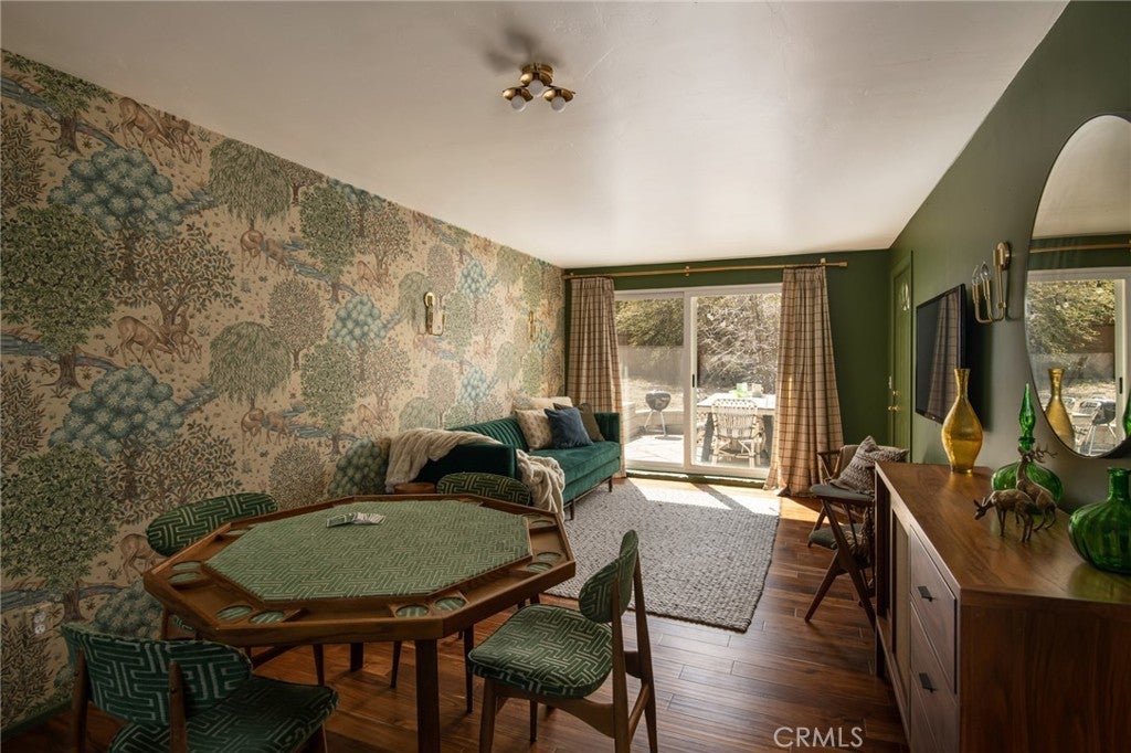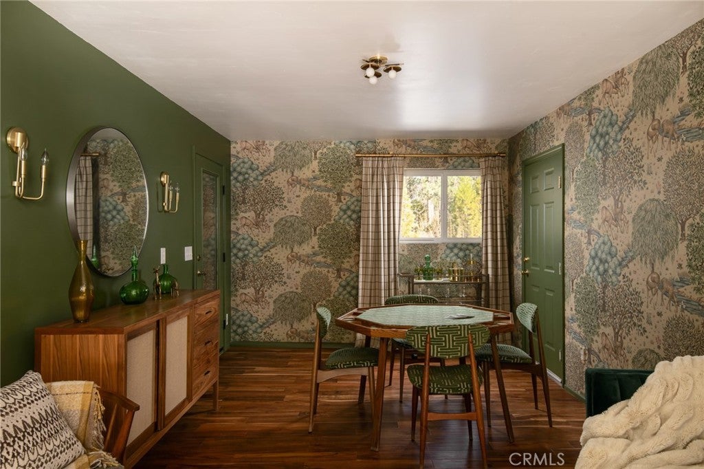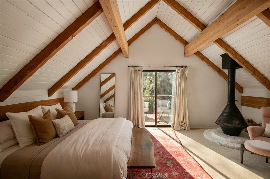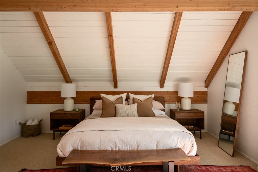 Welcome to the Kitchy Cabin, a storied alpine-chic getaway that blends cozy cabin vibes with thoughtful designer flair—right in the heart of Big Bear. This charming 3-bedroom, 2-bath home sits on a flat lot in the highly sought-after Alpine Woods neighborhood of Fox Farm and is Moonridge adjacent. A true mountain haven, the property features a spacious and private backyard complete with a private hot tub and freestanding, retro-modern fireplace—perfect for unwinding after a day on the slopes or trails. Inside, the home boasts personality and warmth throughout, with colorful wallpaper and tile accents that add vibrant interest. A raised platform on which the centerpiece vintage fireplace sits is tiled with eye-popping mosaic tiles that seamlessly flow into the kitchen, creating a bold visual connection between the living and hosting spaces. A-frame ceilings and cathedral style windows create an open and airy space amongst the cozy design. The kitchen is a cook’s dream, boasting a double oven and smart refridgerator that plays music, searches recipes, and even takes notes. The adjacent large dining area offers plenty of space for gatherings, whether it’s family dinners or hosting friends for the weekend. The two main-level bedrooms are conveniently laid out, sharing a full bath that features a soaking tub and zen-like atmosphere. A character rich bonus lounge/game room completes the main level and opens directly into the backyard. The home also includes a convenient laundry area and thoughtful design throughout.The primary suite is tucked privately on its own level beneath the classic A-frame beamed ceiling, soaring 10 feet high, a cozy wood-burning Malm fireplace, and direct access to a private patio. With a central location near Big Bear Lake, ski resorts, hiking trails, and the Village, this home blends classic mountain style with thoughtful design and modern comfort in one of Big Bear’s most desirable areas.