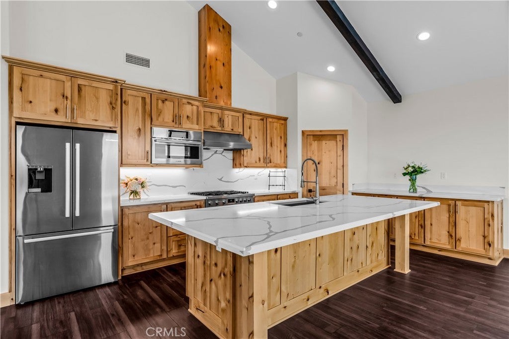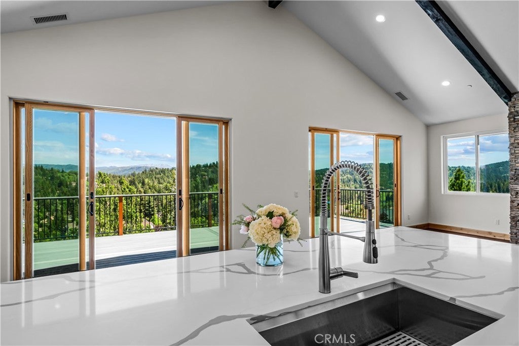 Beamed Ceilings, Breakfast Bar, Built-in Features, Cathedral Ceiling(s), Eat-in Kitchen, High Ceilings, Living Room Deck Attached, Open Floorplan, Pantry, Quartz Counters, Bedroom on Main Level, Primary Suite