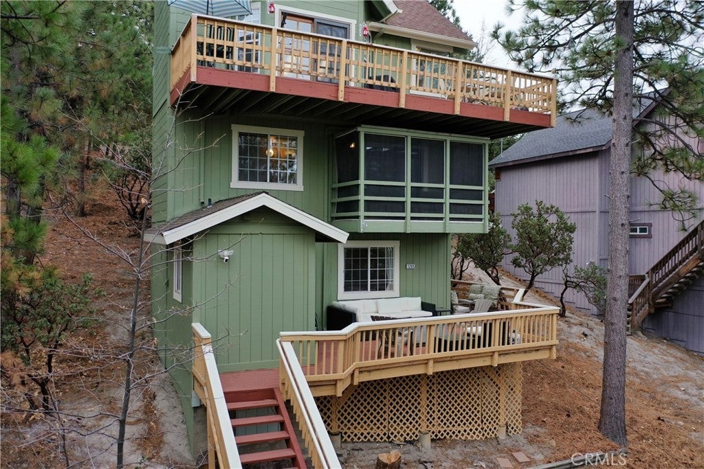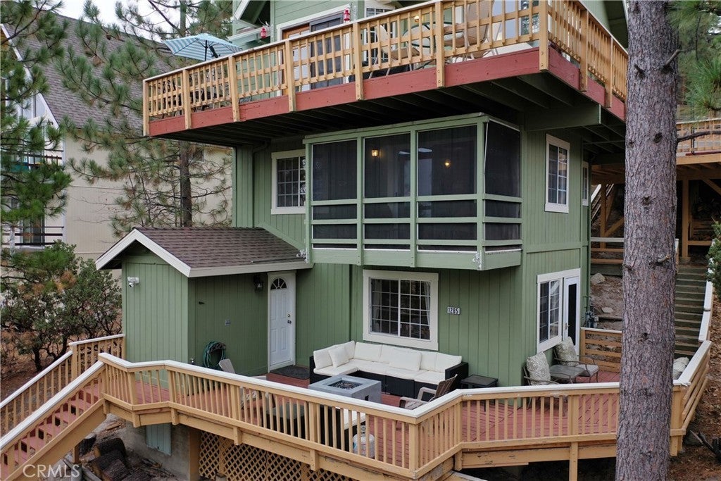 PRICE IMPROVEMENT! A Mountain Dream with Lake Rights at an Incredible Value! Indulge in breathtaking panoramic views spanning Hesperia, Victorville, and the iconic Pinnacles - all from the comfort of your own private, fully furnished retreat. This remarkable three-story home features three expansive decks, including a wrap-around deck perfect for entertaining and a secluded, screened-in deck off the master bedroom for ultimate privacy. Tucked away on a quiet access road, this peaceful sanctuary includes a two-car deck for convenient parking. Inside, you’ll find a beautifully refreshed space with new paint, fresh tile, and brand new refrigerator and dishwasher. Enjoy year-round comfort with double-pane windows and a cozy stone fireplace in the living room. Step outside to take in the mountain air while enjoying meals from the included grill, or unwind by the outdoor fire pit - a perfect setting for cool, starlit evenings. A versatile bunk/game room adds extra fun and flexibility for guests or family. Though privately situated, the home is just minutes from all the excitement Lake Arrowhead has to offer - boating, shopping, dining, and summer concerts - providing the perfect balance of tranquility and convenience. Don’t miss your chance to own this move-in ready mountain getaway with panoramic views, multiple outdoor living spaces, and endless potential.