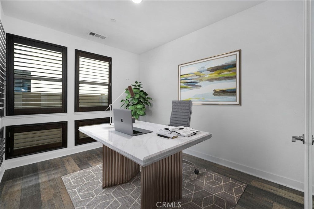 Welcome to this beautifully designed two-bedroom, two-bath home located in the highly sought-after MODERN GATED ALTIS COMMUNITY. Featuring the spacious AVID PLAN 3 open floor plan and stylish laminate flooring, this home offers modern comfort and functionality. In addition to the two bedrooms, there is a dedicated office/den—ideal for working from home or enjoying a quiet retreat. The home is enhanced with quality window coverings throughout, including motorized shades, real wood blinds, and elegant wood shutters in the office. The open-concept kitchen is a chef’s dream, complete with stainless steel appliances, abundant cabinet space, a walk-in pantry, and a seamless flow into the large family room—perfect for entertaining or relaxing. The primary bedroom features sliding doors that lead to a private backyard retreat with a covered patio—ideal for outdoor dining or lounging. A second bedroom provides comfortable space for guests or a home office. Additional features include PAID-OFF SOLAR PANELS, a WHOLE HOUSE FAN for energy efficiency, and a WATER SOFTENER SYSTEM. As part of the GATED ALTIS COMMUNITY, residents enjoy access to resort-style amenities including a state-of-the-art recreation center, multiple pools and spas, a fitness center, Flow Studio, billiard room, fire pit and BBQ area, and FIVE PICKLEBALL COURTS. This home combines thoughtful upgrades with luxurious community living—don’t miss this exceptional opportunity!