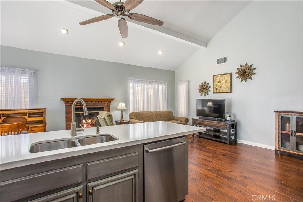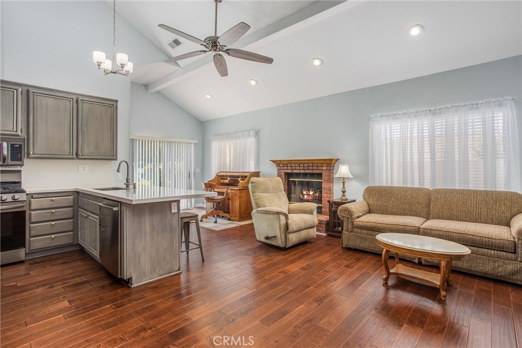 One of a kind home in 55+ Guard-gated Community of Sun Lakes Country Club. All living space is downstairs w/ the addition of a media room/private guest suite up for family/friends who visit, separate formal dining room, a large master bedroom and a large open family room/kitchen area. Home flows beautifully w/ vaulted ceilings, TWO fireplaces, stainless appliances, ceiling fans, pantry, breakfast bar island w/ quartz counter tops! There is a library! You will love the location in a quiet cul-de-sac with views of two mountain ranges. There are 2 bedrooms downstairs each w/ a bathroom, and a 3rd bedroom/media room upstairs w/ its own bath, linen room, and a huge storage area. Smooth ceilings, new flooring, newer heat/ac unit, new paint in and out, new driveway, newer appliances (Refrigerator, plus the extra one in the garage, washer & dryer, and the TV are included in sale) Large master bedroom has walk-in closet, double sinks in the bathroom and a slider to the backyard. The yard is nicely landscaped and is completely fenced in with vinyl fencing. LOTS of storage in the garage. Some furnishings are available reasonably priced. TWO 18-HOLE GOLF COURSES with 2 Pro Shops, THREE Clubhouses, TWO Restaurants, Bar & Lounge, Tennis, PICKLE BALL COURTS, Pools (Including Large Indoor Pool), Jacuzzi Spas, THREE Fitness Centers & Fabulous Planned Activities Offered on a Daily Basis. There are 80+ Social CLUBS, including: Dancing, RV Club, Yoga, Table Tennis, Cards, Bocce Ball, Bowling, Car Club, Drama/Theatre Club, Sewing, Tennis, Knitting, Bingo, Travel, Quilters, Art League, International Culture, Genealogical Society, Garden, Photography, Travel, and a lot MORE .... If that's not Enough, Add TRIPS AND TRAVEL EXCURSIONS scheduled all year long. Association Dues INCLUDE CABLE TV & INTERNET/WIFI - The community is Located Close to Casinos, World Famous Shopping (Cabazon and Palm Springs), Restaurants, and Excellent Medical Facilities (Loma Linda & Optum literally across the Street) - SUN LAKES COUNTRY CLUB is has a backdrop of two Mountain ranges, which offer stunning views - LIFE IS GOOD in our Awesome Community Buyer to pay the HOA move-in fees