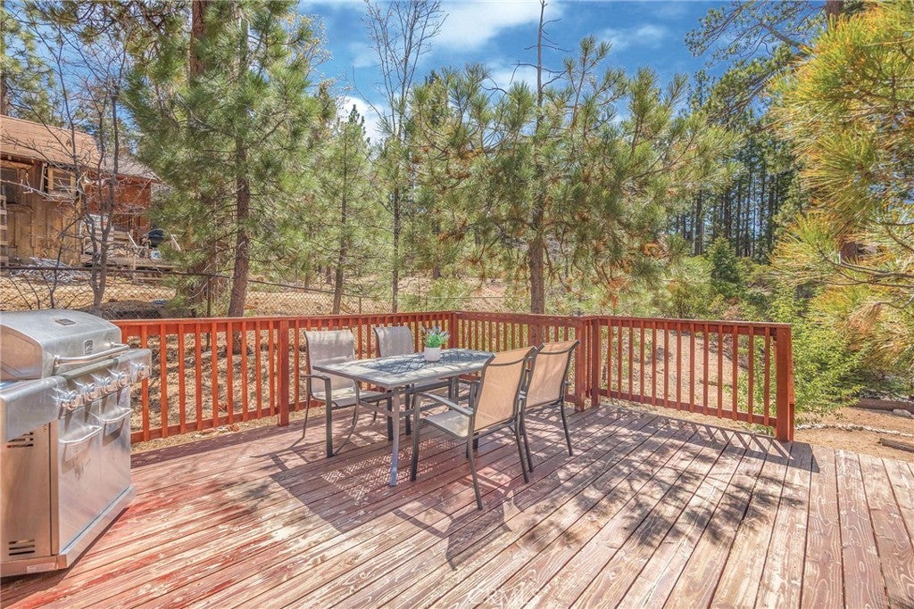 Welcome to your inviting mountain escape! Whether you're looking for a relaxing getaway or a high-performing investment opportunity, this beautifully updated 1-bedroom,1-bathroom cabin sits on a spectacular 9,650 sq ft lot amid mature plants & trees delivering a sense of quiet beauty. With over $71,000 in gross revenue for 2024 and $34,000+ from January through July of this year, this owner-managed short-term rental has an impressive track record of success! Even better, the current owner is offering valuable mentorship during the transition, along with trusted contacts for cleaning, maintenance and insider knowledge to help you hit the ground running. Greeted with an open-concept living area where a stunning stone fireplace creates the ideal cozy centerpiece and soaring ceilings and abundant natural light add to the spacious, airy feel. The kitchen features modern updates including stainless steel appliances and has a seamless flow into the living space—great for whipping up a meal or relaxing after a day of adventure. Enjoy your morning coffee on the inviting composite front deck, surrounded by the natural beauty of pine, manzanita and flowering lilac plants that grace the front yard with color and charm. The generously sized bedroom boasts high ceilings, a pretty wood accent wall and plenty of light, while the bathroom offers a luxurious, spa-like experience with a custom-tiled shower and modern vanity. A tankless water heater and inside washer/dryer provide added convenience for guests and owners alike. Outside, enjoy the expansive fenced backyard with a large rear deck, relaxing spa, BBQ, and outdoor dining area—great for time spent gathering with friends, letting the pets roam and soaking in the mountain serenity this fantastic location delivers. Situated in a peaceful treed location just minutes from local mountain resorts, the National Forest, Big Bear Lake and the Village’s vibrant shops, restaurants and entertainment. Whether you’re a first-time investor or seasoned host, this turnkey property is your opportunity to own a piece of Big Bear’s magic—with the tools & resources for continued success as a thriving short term rental!