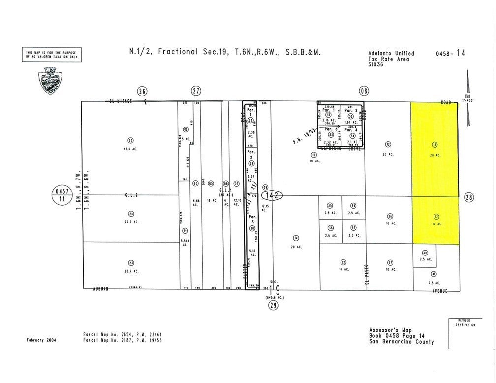 30 Acres of Flat Vacant Land on Paved Road in Adelanto! Two properties totaling 30 acres for sale on El Mirage Rd.—one 20-acre lot and one 10-acre lot, being sold together. The property sits directly on El Mirage Rd, a paved road for convenient access, and is located just minutes from Highway 395. Ideal for future development with Rural Living Zoning.. Enjoy open desert views and plenty of possibilities with this large, well-located piece of land. Contact Listing Agent for more information! *Seller will finance*