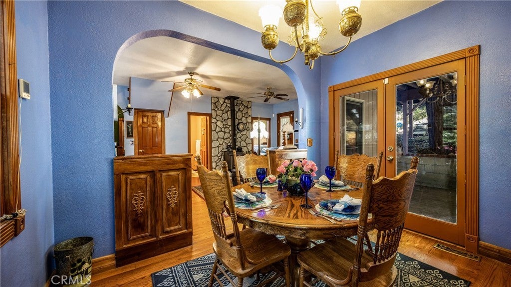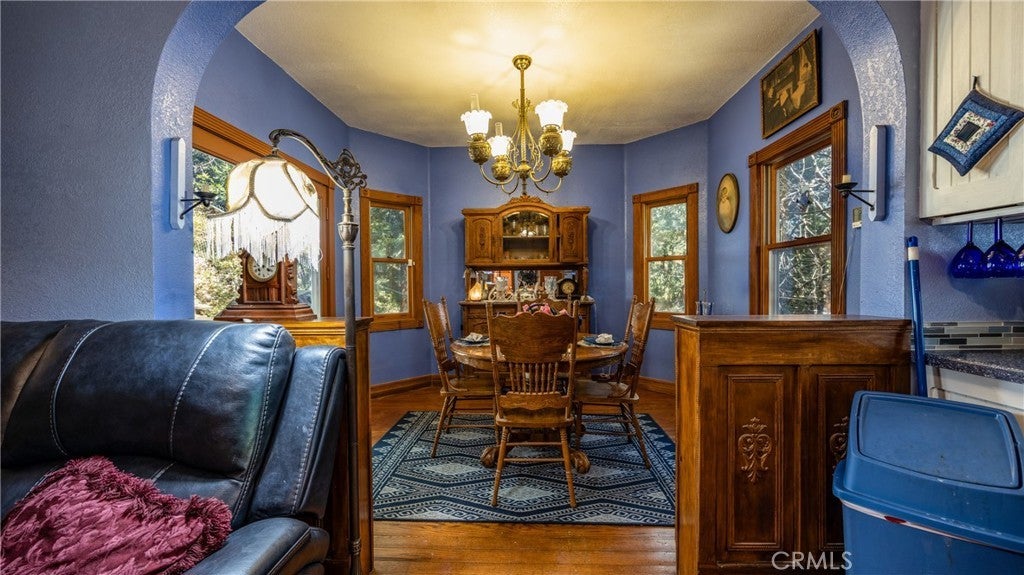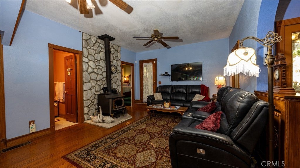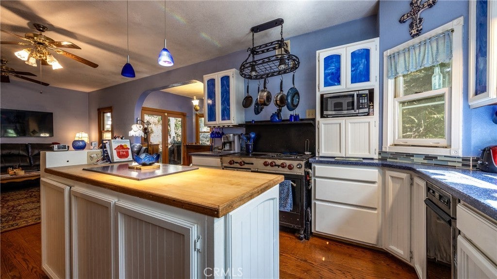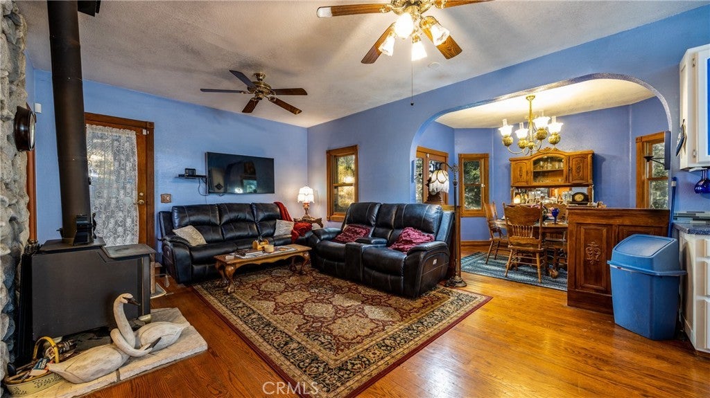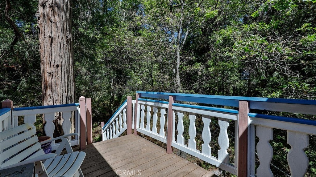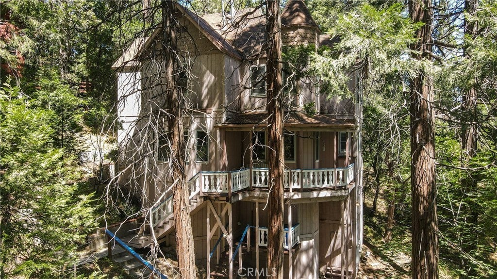 **Victorian Elegance Among the Treetops!** This large custom Victorian home offers 4 bedrooms, 2.5 baths, and timeless craftsmanship throughout. Step into a grand entry featuring rich wood flooring, an open staircase, and handcrafted wood banisters that set the tone for the home's warm, inviting style. The main level boasts an open-concept layout connecting the living, kitchen, and dining areas—all with wood floors. The chef’s kitchen is highlighted by quartz countertops, a Wolf range, high ceilings, and a central island with inside cabinet appliance lift. The living room includes a ceiling fan, energy-efficient dual-pane wood-framed windows, a cozy wood-burning stove, and direct access to a covered patio—also accessible from the dining room through elegant double doors. The spacious primary suite is located on the main floor and features a full wall of custom closets, private access to the patio, and a luxurious bath complete with clawfoot tub, separate shower, and a dedicated vanity area. Upstairs, you’ll find a bright family room and loft with extensive built-in cabinetry, and access to a private deck with serene treetop views. Three additional bedrooms offer flexibility, including one with dual desk space and storage—ideal for a home office. Another features a charming window seat and ceiling fan, while the third includes built-ins and an attached bath. A large, partially finished basement provides laundry hookups, multiple rooms for storage, workshop space, or future potential—complete with a separate exterior entrance. Enjoy peaceful privacy and Victorian charm nestled in the trees—this is mountain living at its finest.