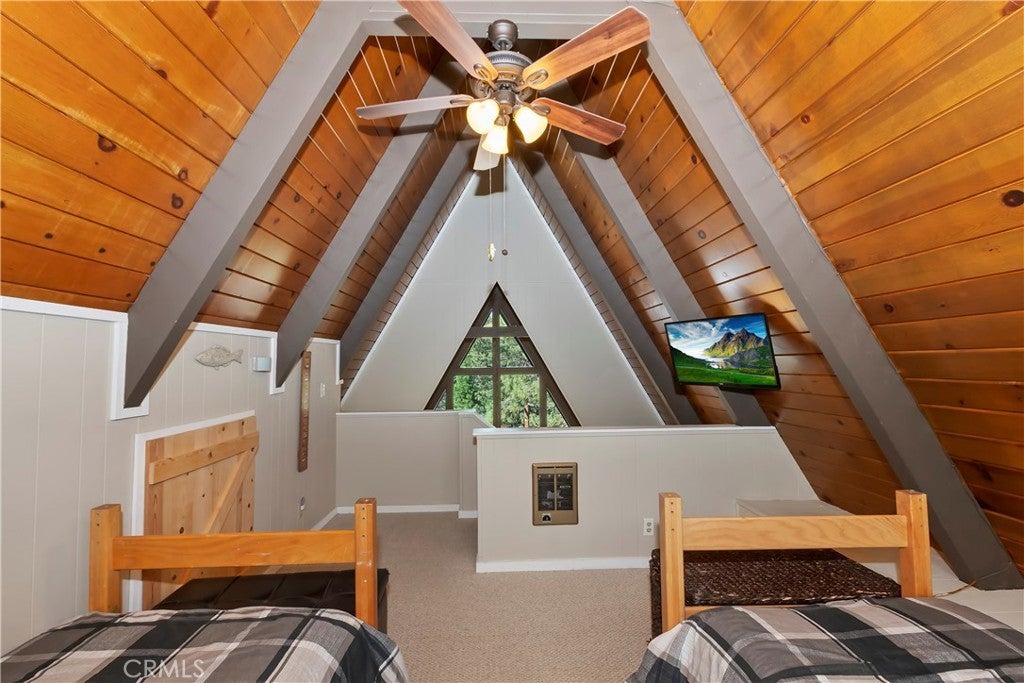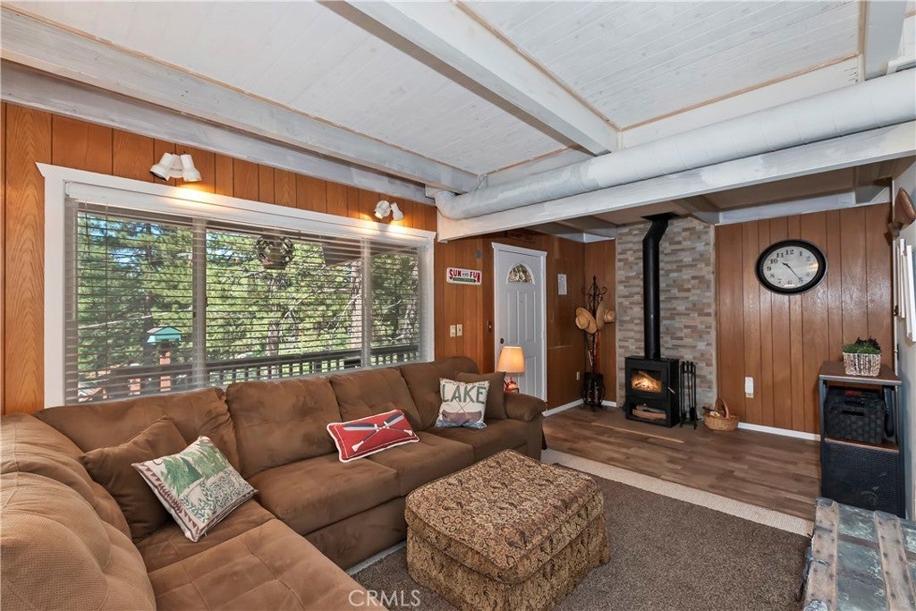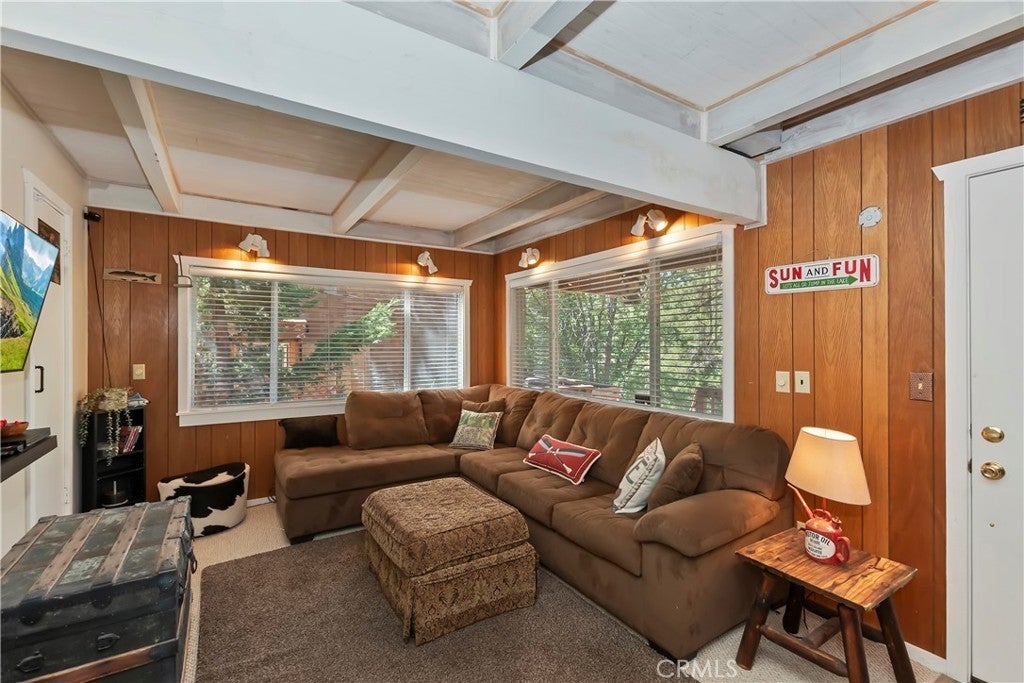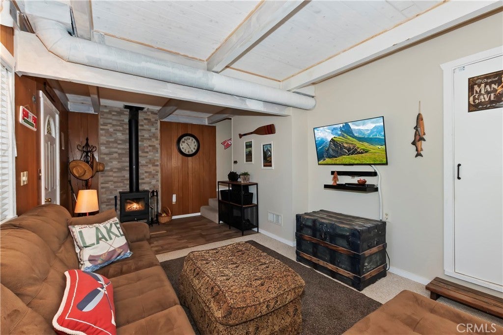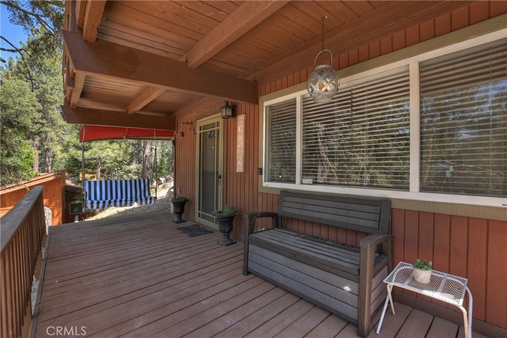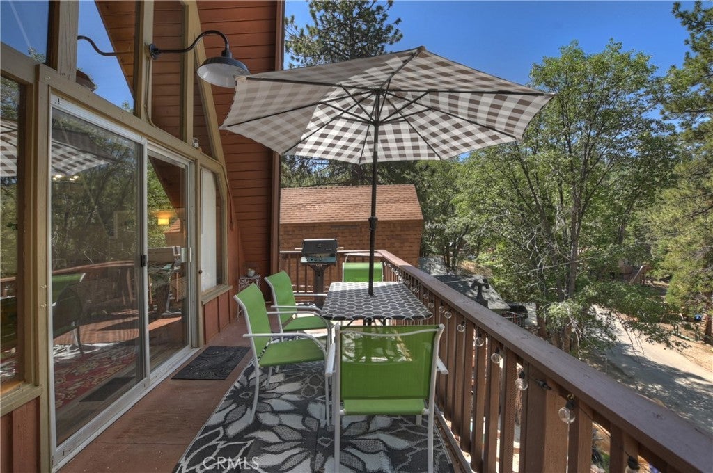 Come join the quiet, peaceful community of Green Valley Lake. Own your own piece of the mountain wilderness in this updated 2 bedroom 1 bath cabin. Enter into the cozy family room with comfortable sofas, a pellet stove and flat screen TV to enjoy an afternoon movie or games with the family. Upstairs is another space for enjoying the view of surrounding trees and access to the attached deck. This sitting area adjoins the open kitchen with a built-in corner booth for enjoying meals. The primary bedroom and bath are also off of the kitchen area. Upstairs is another loft bedroom for family or friends that stay over. Parking for 3 cars. Comes fully furnished per seller inventory. A great space at a great price. Don't miss it!