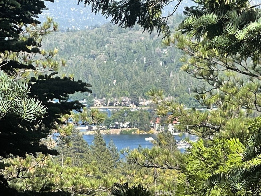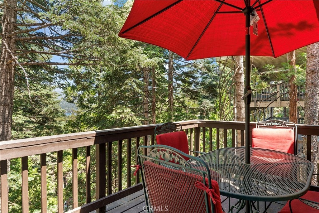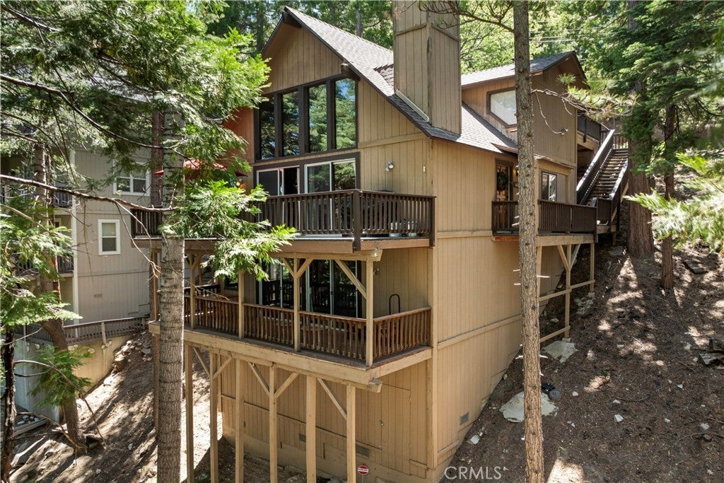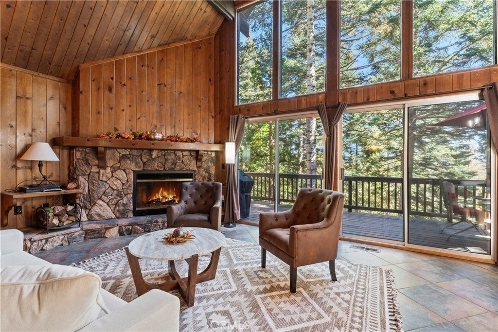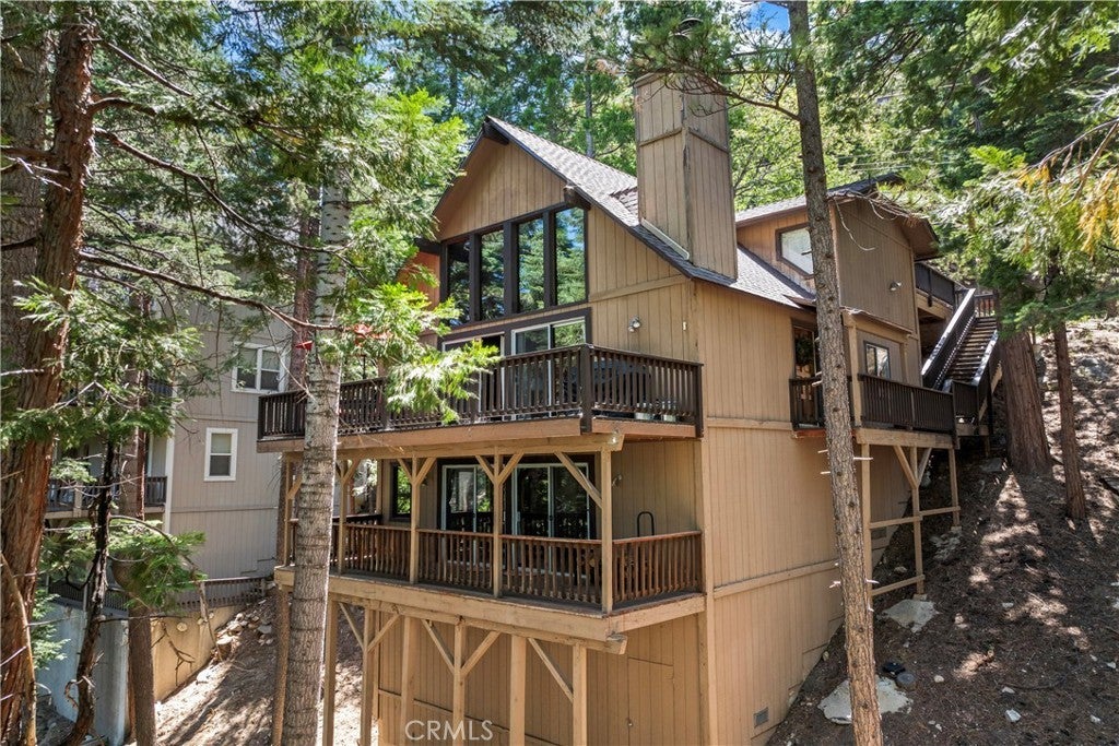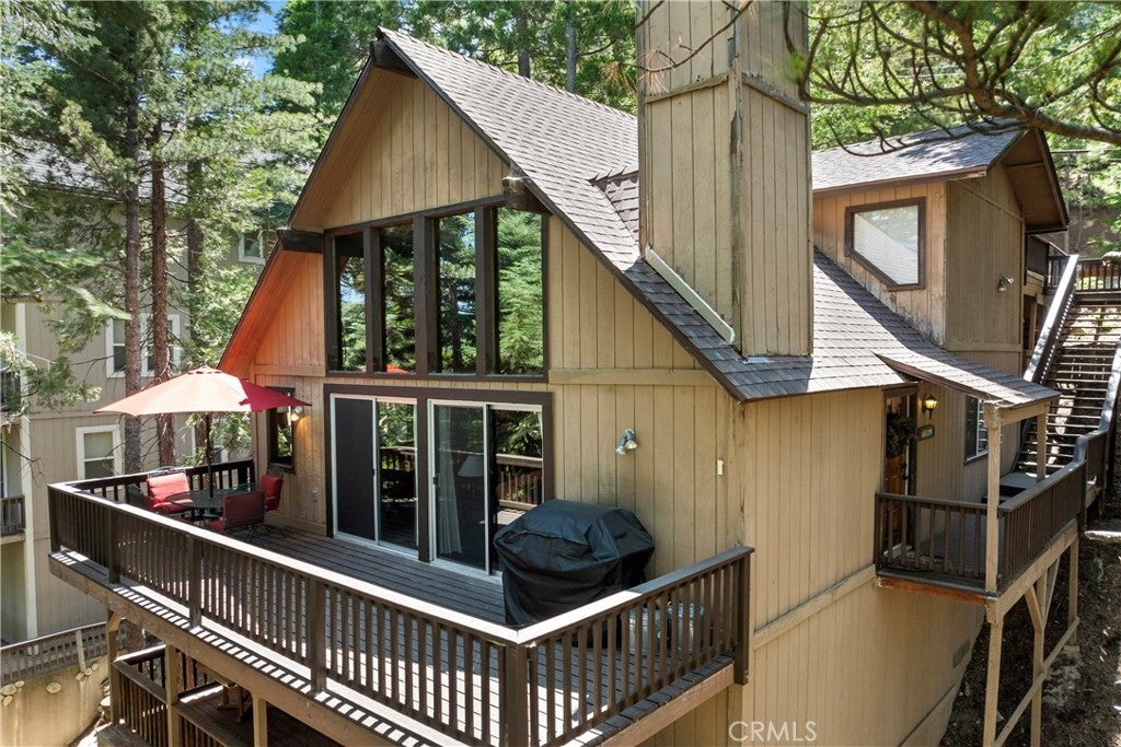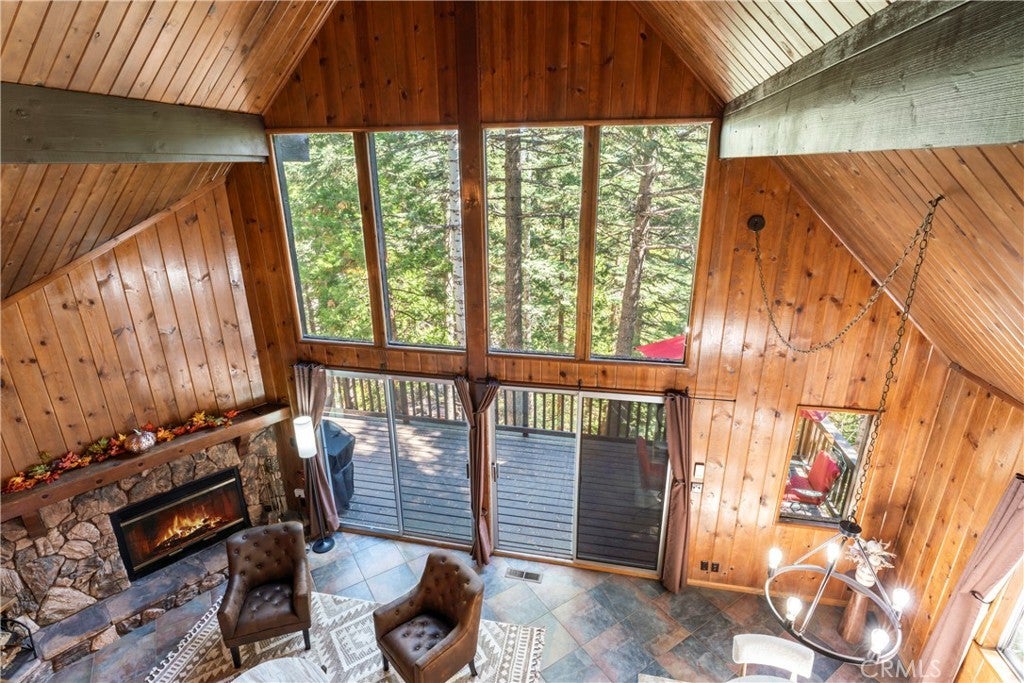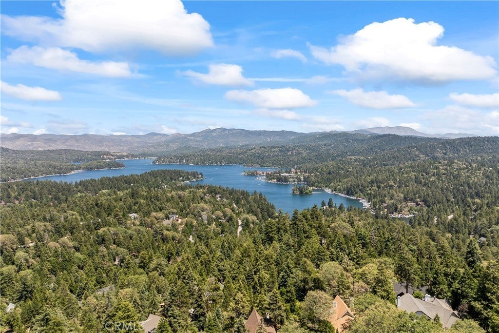 Lake Views from two decks in a Classic Mountain Cabin A-Frame with Lake Rights. Open the front door to where an open floor plan awaits. An expansive two-story Cathedral ceiling roofline opens out to a large deck the full length of the home. Design includes a corner Lava rock fireplace, extra wide sliders, large bank of windows that anchor the living and dining room, extra wide tongue & groove plank paneling combined with great views of Lake Arrowhead and the Lake Arrowhead Village. The kitchen and island/bar are accented in rich, rust brown granite, stainless steel appliances and oversized slate tile flooring throughout. A coveted large bedroom with a huge, full bath is on the first level. Two large bedrooms are located up a floating staircase in a Jack & Jill configuration with a three-quarter bath. Upper level facing Old Toll has tons of windows with dappling sunlight on one side of the home while the other side opens out onto a mezzanine landing that faces the forest view; cozying up the space. One of the bedrooms has an ample sitting area with a great view out a mid-Century triangle shaped window of mountainscapes beyond. The bottom level bonus room/den is appointed with a second corner fireplace, wet bar with sink, island/bar, and enclosed laundry. A second huge deck also has a lake view. A tankless water heater is in finished buildup area with tons of extra storage the whole length of the house. The house has a large two car parking deck, new COPP roof /warranty and alarm system. Additionally, Trex decking under parking platform for firewood and more storage.
