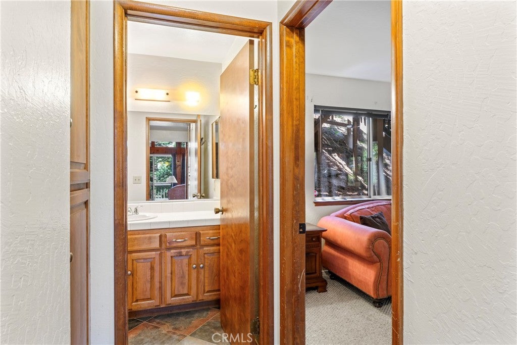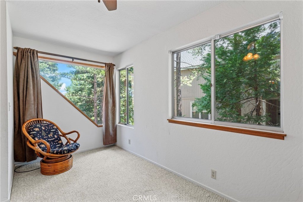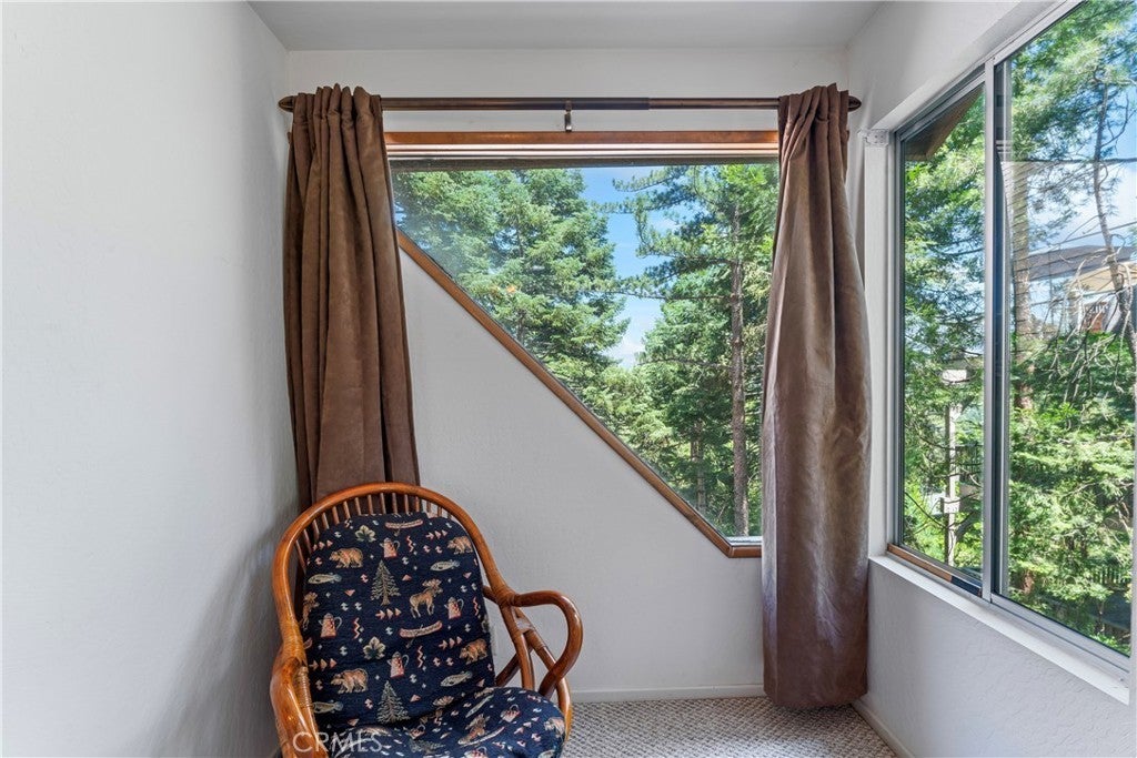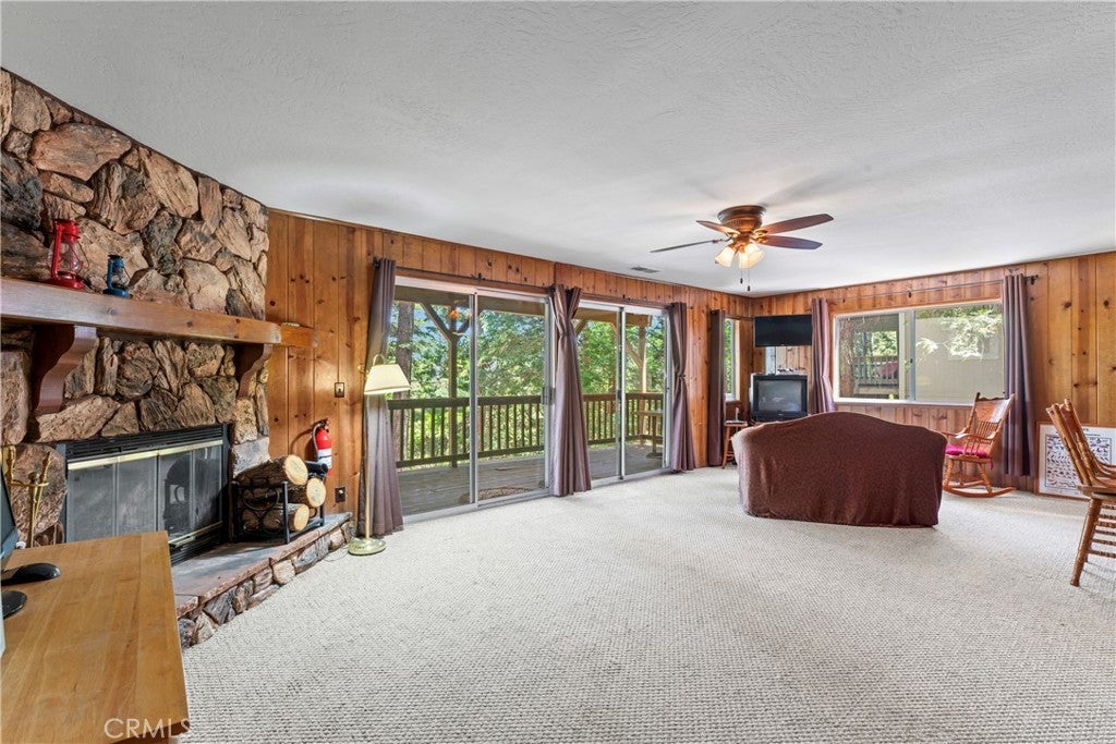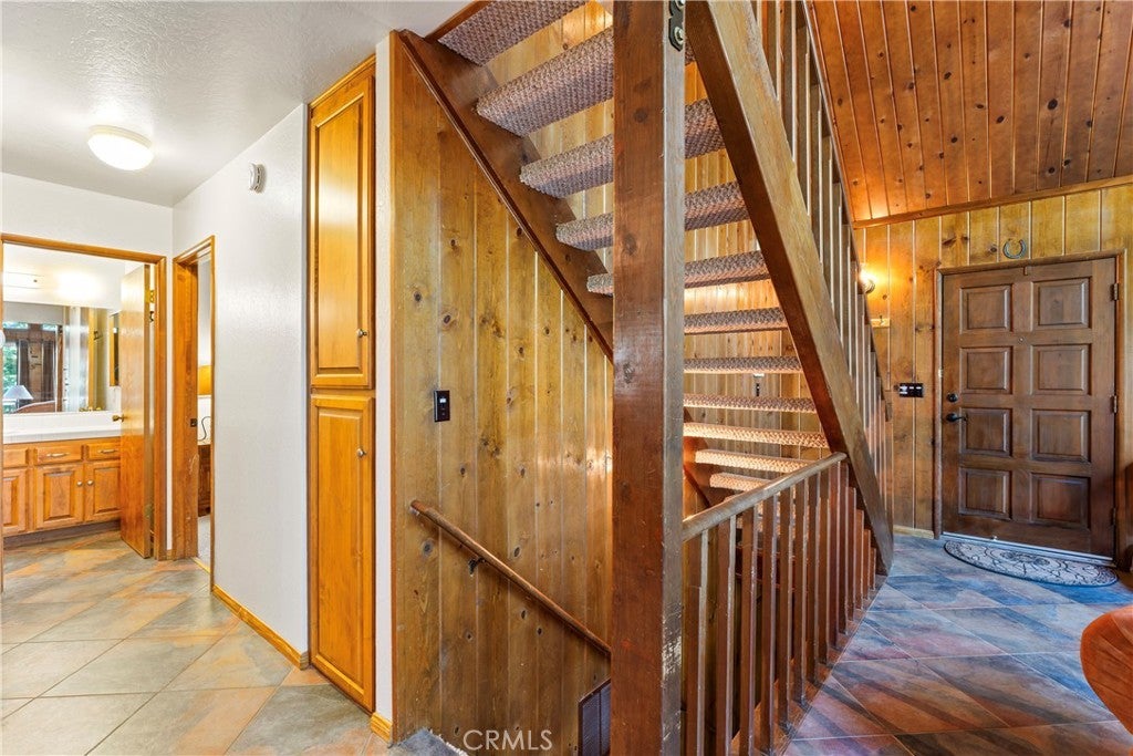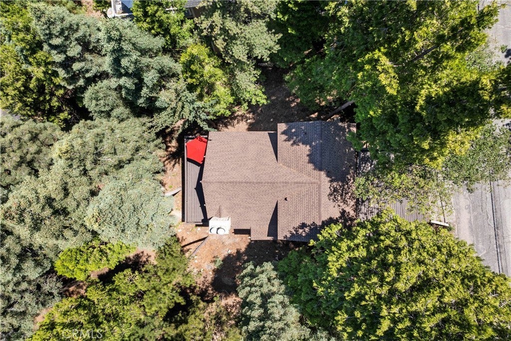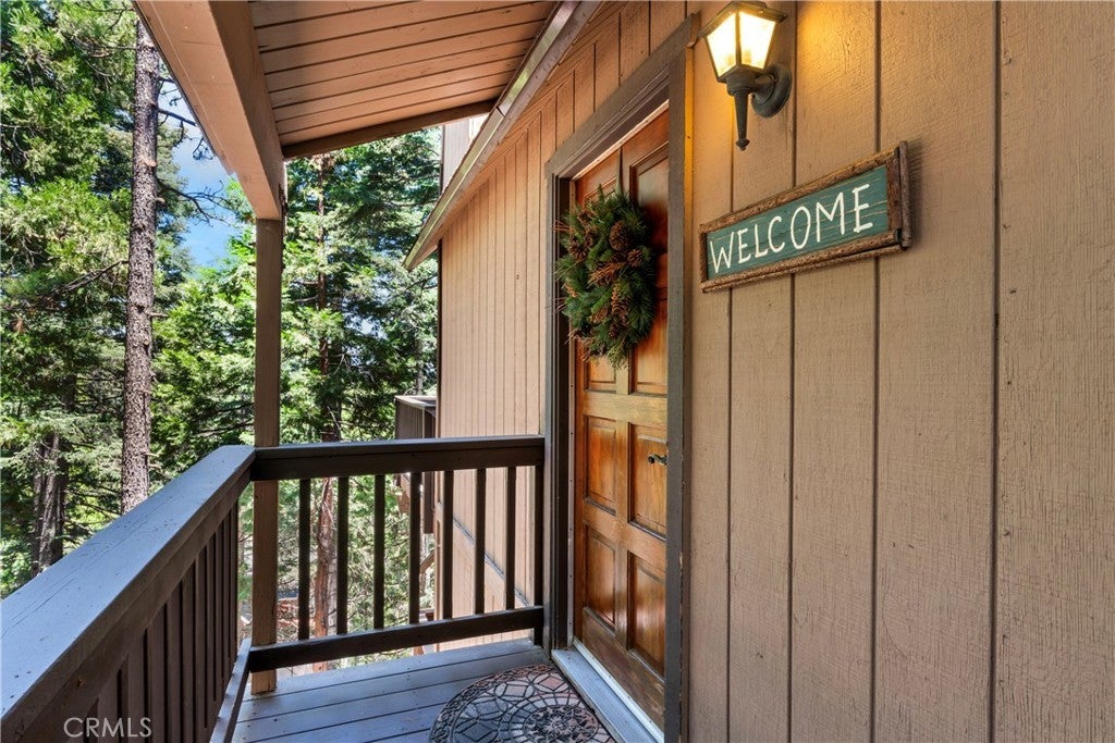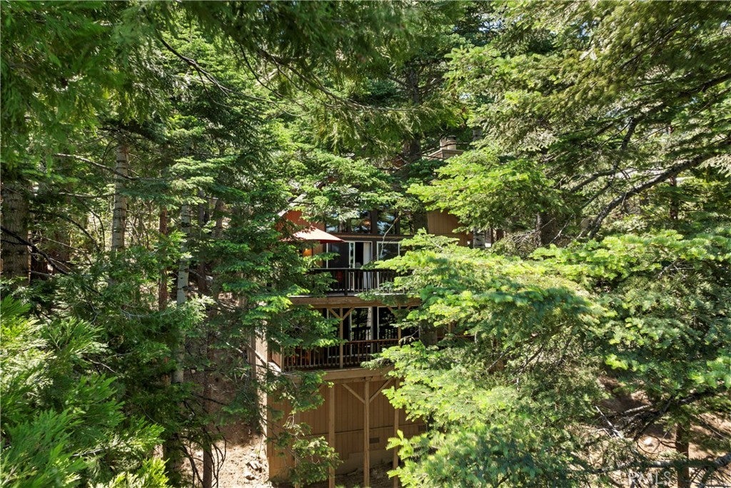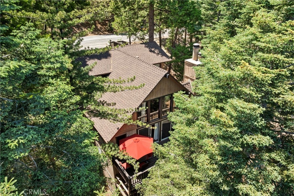 Lake Views from two decks in a Classic Mountain Cabin A-Frame with Lake Rights. Open the front door to where an open floor plan awaits. An expansive two-story Cathedral ceiling roofline opens out to a large deck the full length of the home. Design includes a corner Lava rock fireplace, extra wide sliders, large bank of windows that anchor the living and dining room, extra wide tongue & groove plank paneling combined with great views of Lake Arrowhead and the Lake Arrowhead Village. The kitchen and island/bar are accented in rich, rust brown granite, stainless steel appliances and oversized slate tile flooring throughout. A coveted large bedroom with a huge, full bath is on the first level. Two large bedrooms are located up a floating staircase in a Jack & Jill configuration with a three-quarter bath. Upper level facing Old Toll has tons of windows with dappling sunlight on one side of the home while the other side opens out onto a mezzanine landing that faces the forest view; cozying up the space. One of the bedrooms has an ample sitting area with a great view out a mid-Century triangle shaped window of mountainscapes beyond. The bottom level bonus room/den is appointed with a second corner fireplace, wet bar with sink, island/bar, and enclosed laundry. A second huge deck also has a lake view. A tankless water heater is in finished buildup area with tons of extra storage the whole length of the house. The house has a large two car parking deck, new COPP roof /warranty and alarm system. Additionally, Trex decking under parking platform for firewood and more storage.