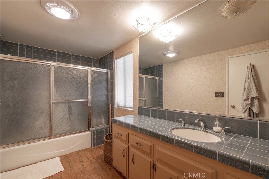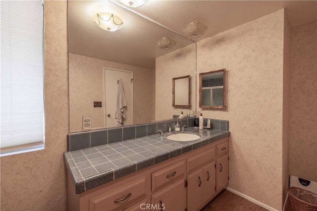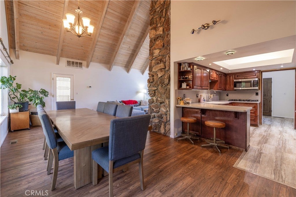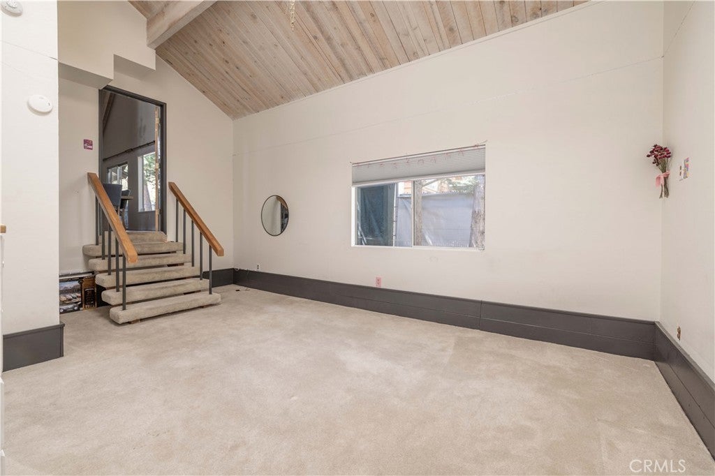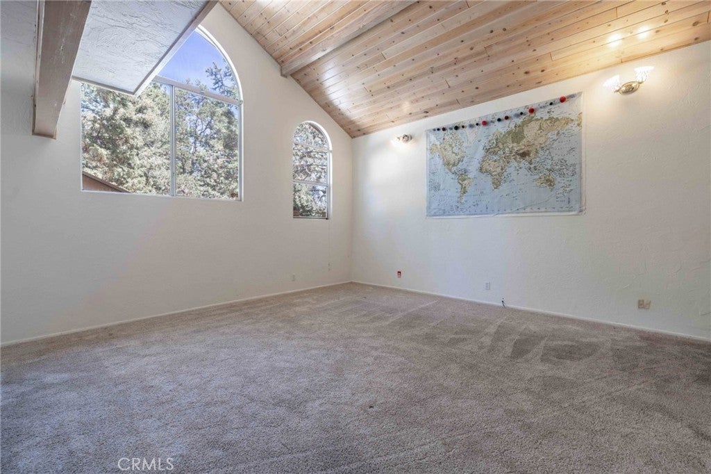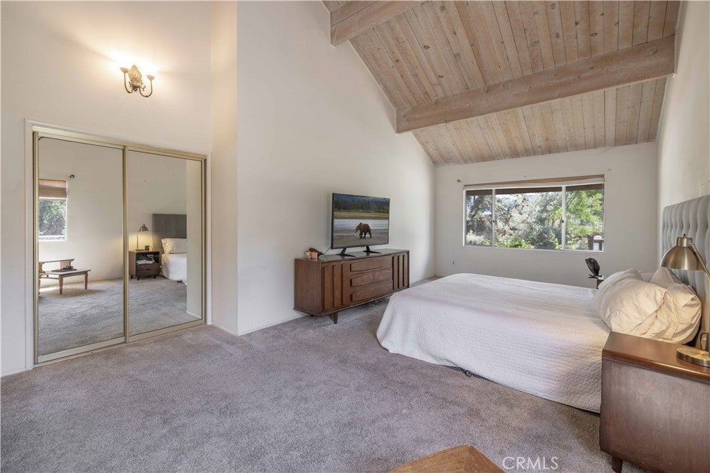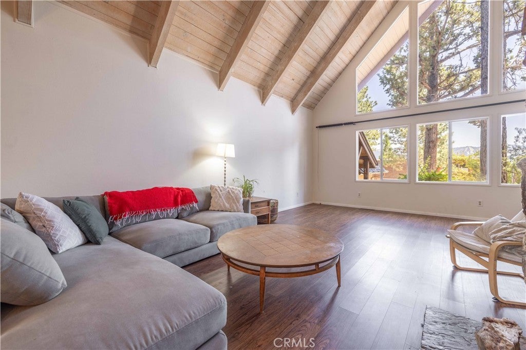 Nestled in the desirable Whispering Forest neighborhood, this uniquely designed home offers versatile living with mountain charm. The main living area features soaring ceilings, an open-concept layout, and a stunning floor-to-ceiling stone fireplace that anchors the living, dining, and kitchen spaces. To the left, you’ll find a spacious primary suite and an oversized guest bedroom, both with vaulted ceilings, plus a full guest bath. The right wing offers a flexible-use room ideal for a game room, office, gym, or 4th bedroom. This area leads into a private second living space with its own living room, upstairs bedroom, and bathroom—perfect for multigenerational living or potential rental income. Expansive windows frame the front patio and offer distant ski slope views from the cul-de-sac lot. Vinyl plank flooring and plush neutral carpet. For part-time residents, enjoy smart home features like a remote-controlled thermostat. Whether you're looking to live in the entire home or split the space for added income, this mountain retreat offers rare flexibility and comfort in one of Big Bear’s most scenic neighborhoods.