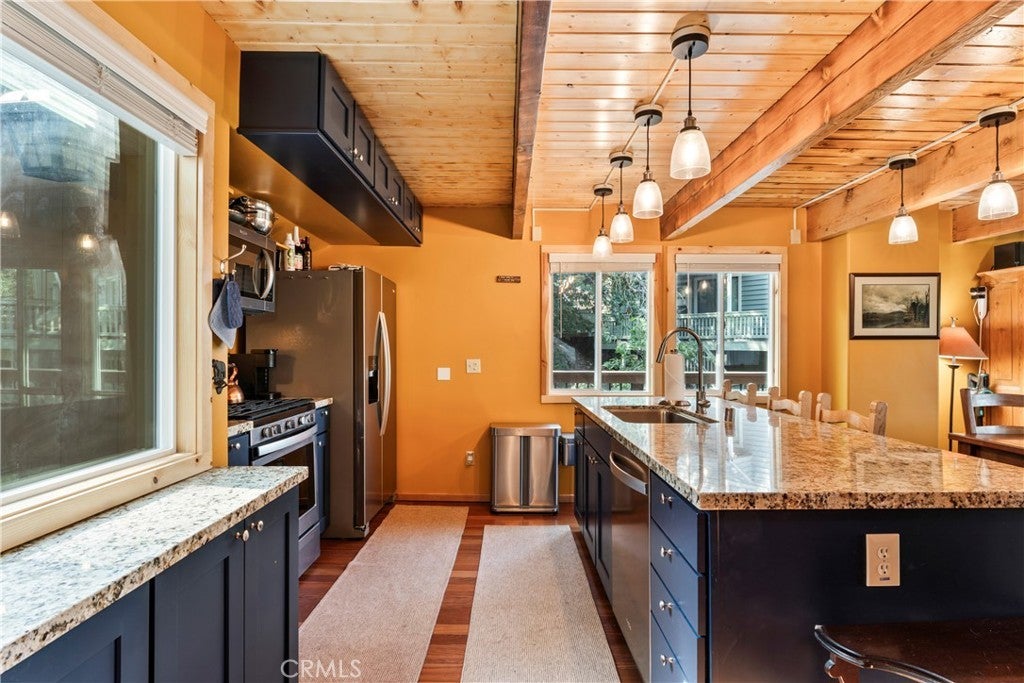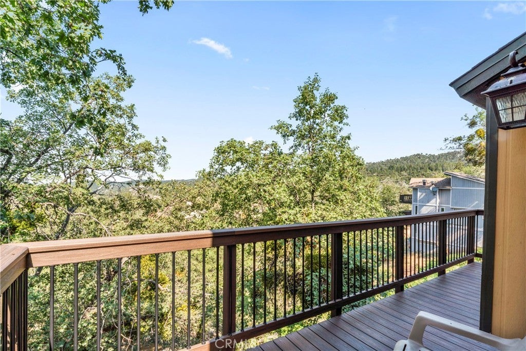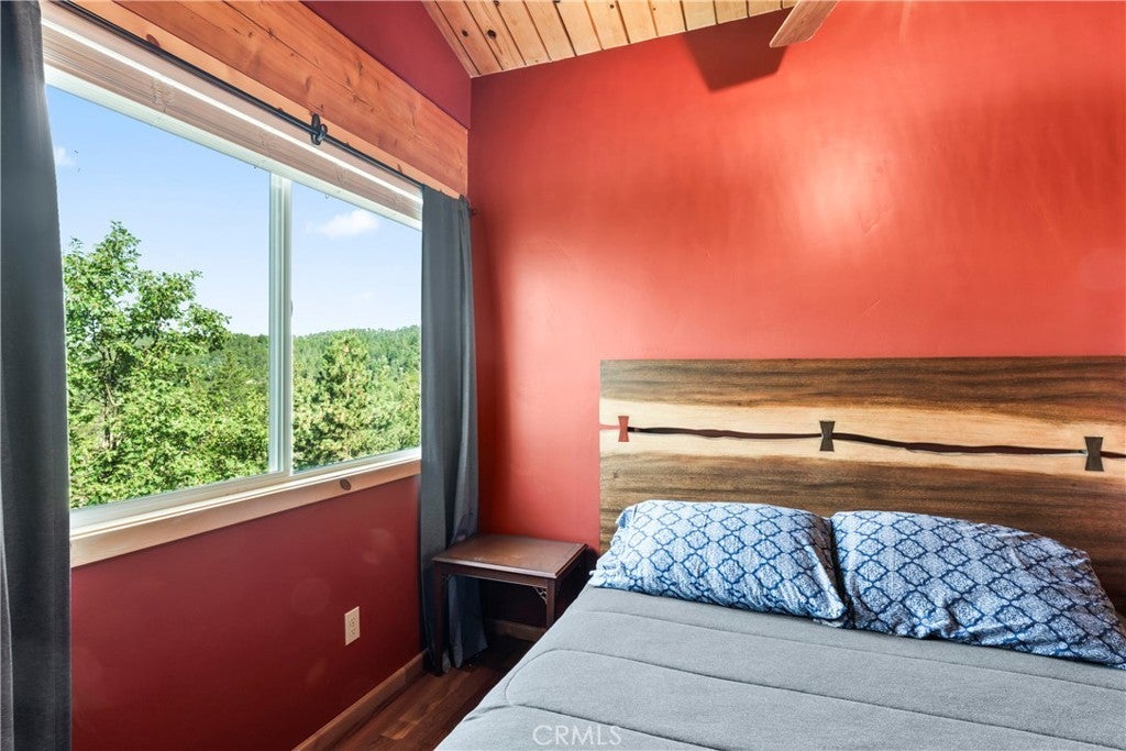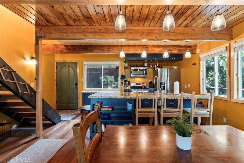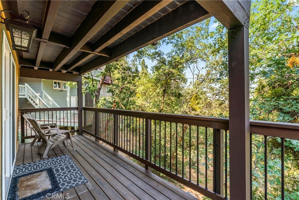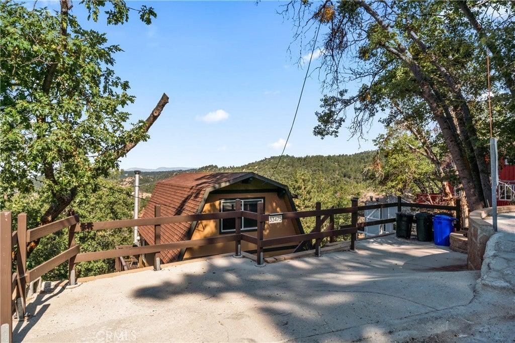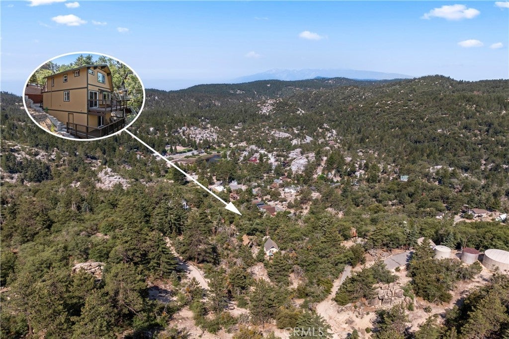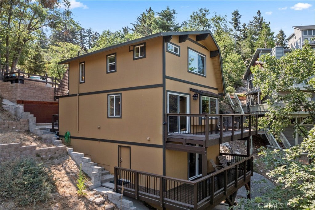 Perched on five spacious lots with sweeping views of the San Gabriel Mountains, this beautifully updated 3BR, 1.5BA home offers the perfect blend of mountain charm and modern upgrades. Originally a 2BR/1BA, the home underwent a complete transformation starting in 2018, taken down to the studs and rebuilt with a fully permitted renovation that added a third bedroom and a half bath. Spread across three levels, the thoughtful floor plan offers both privacy and flexibility, making it ideal for hosting family and friends. Throughout the home, you'll find rich Brazilian Cherry hardwood floors, tongue and groove wood ceilings with exposed beams, and new dual-pane windows and sliders that bring in abundant natural light. The main-level entry opens to a chef-style kitchen featuring a large center island, solid marble countertops, undermount stainless steel sink, solid wood cabinetry with soft-close drawers, stainless-steel appliances, and a breakfast bar. The adjacent dining area flows effortlessly into the living room, which is anchored by a wood-burning stove, a charming bay window, and access to the main deck, perfect for taking in the serene forest and mountain vistas. Also on the main floor is a convenient stackable laundry area. Upstairs, 2 bedrooms with vaulted ceilings, remote controlled ceiling fans, knotty Alder wood doors and trim, and a full bath with Italian porcelain tile and a deep soaking tub create a cozy retreat. The lower level hosts the 3rd bedroom and 1/2 bath, along with its own private deck and separate exterior access, an excellent option for guests or a rental setup. Additional features include new exterior paint, durable wood grain cement fiber siding, a tankless water heater, updated electrical and plumbing systems, central forced air heating, generous storage space with a raised platform in the build-up, and a separate sub-basement. Outside, you'll find concrete parking for three cars, stone steps leading to the front entrance, and a covered wood storage crib. Approximately 300 square feet of Trex decking with metal railing accents add to the outdoor appeal. Located on a paved, plowed, and maintained road with full conventional utilities, including gas, this turnkey home is bordered by a seasonal creek that flows through two of the five lots. Just minutes from Snow Valley Ski Resort, scenic hiking trails, and mountain fishing spots, this move-in-ready retreat is an ideal full-time home or weekend getaway.