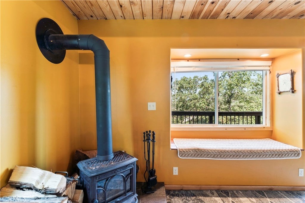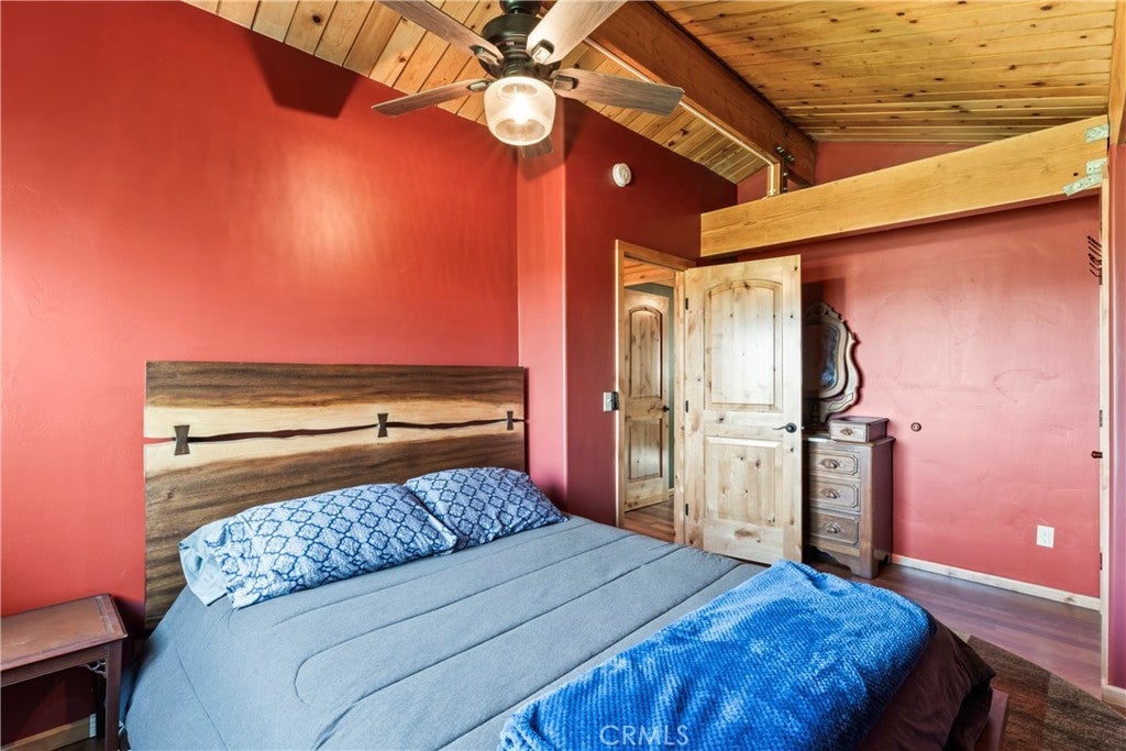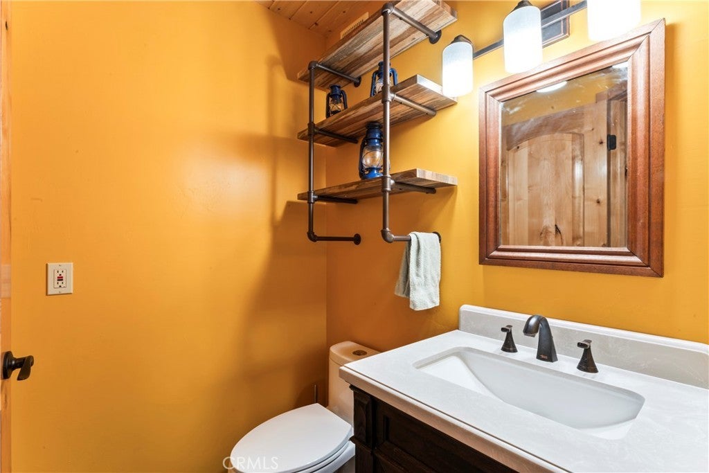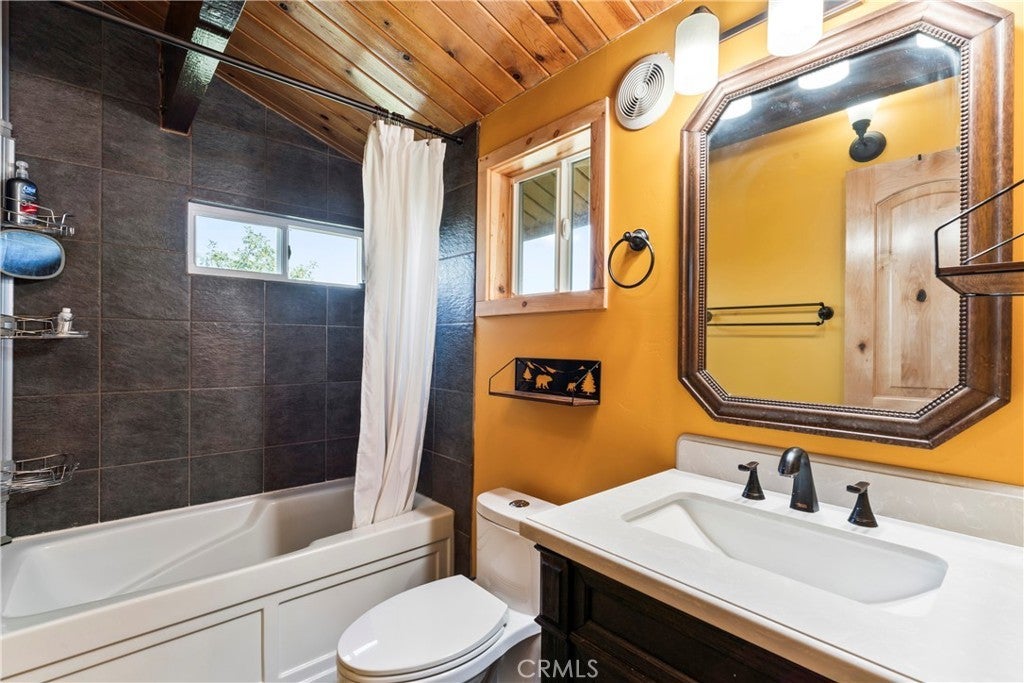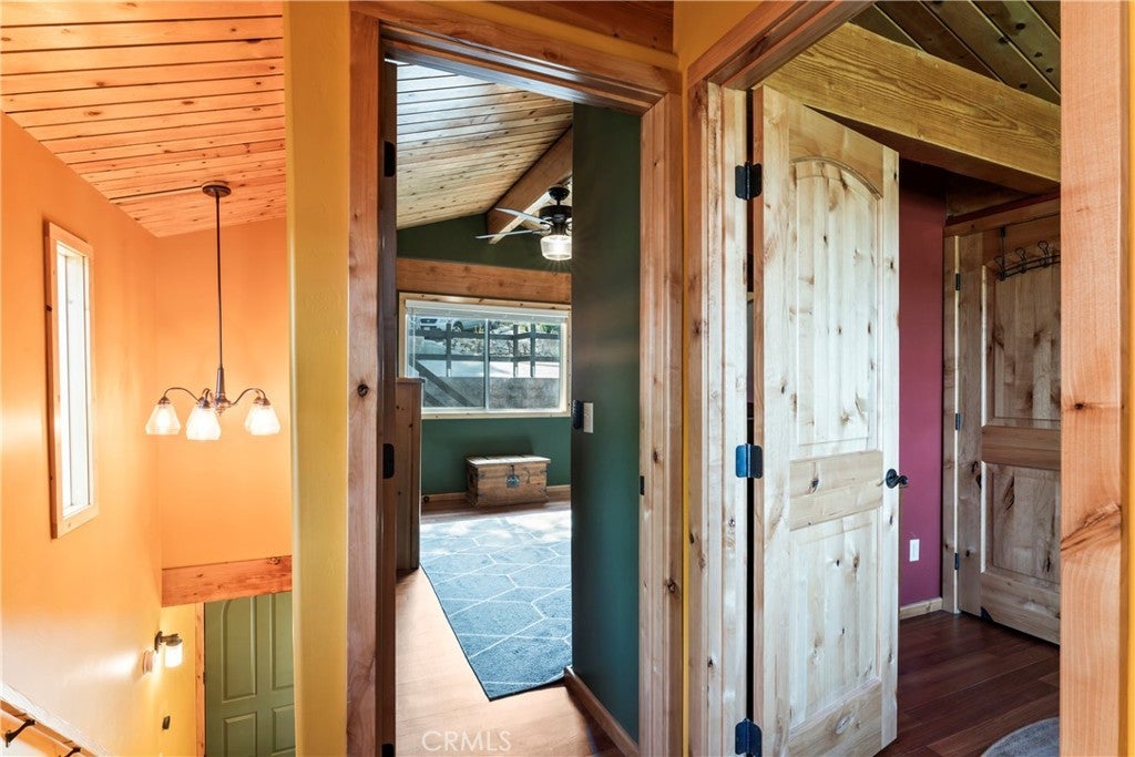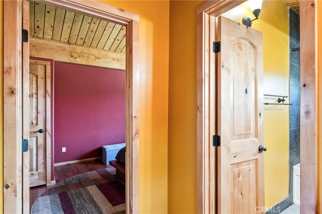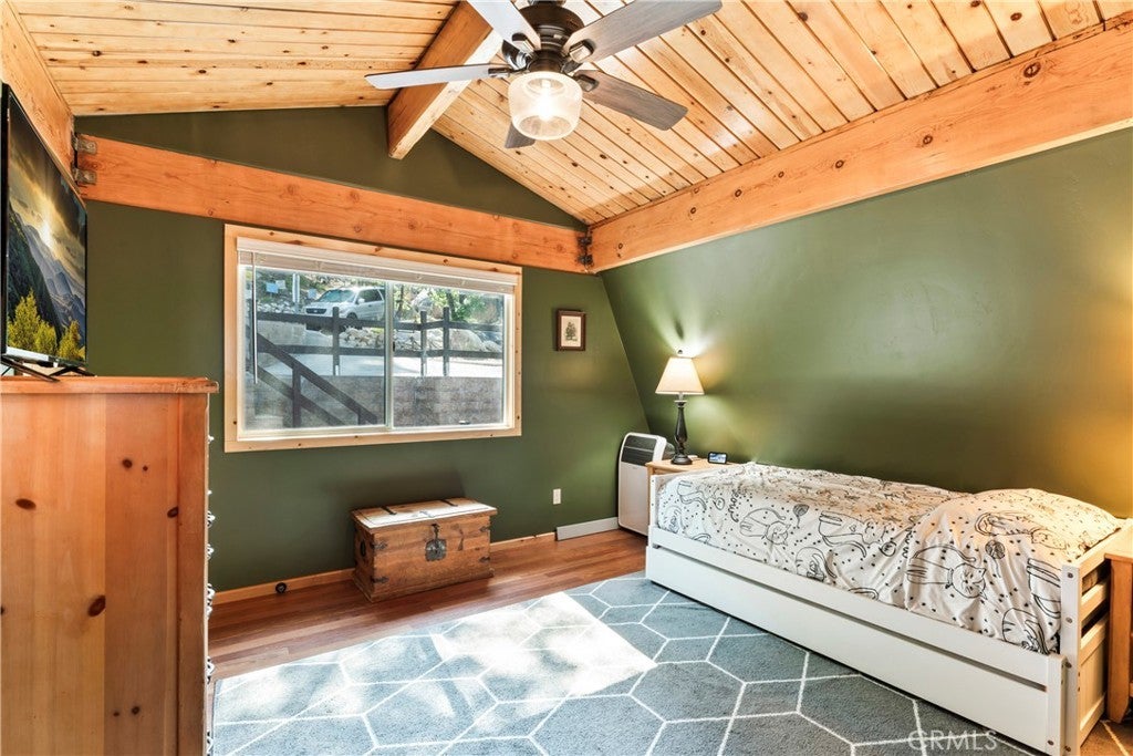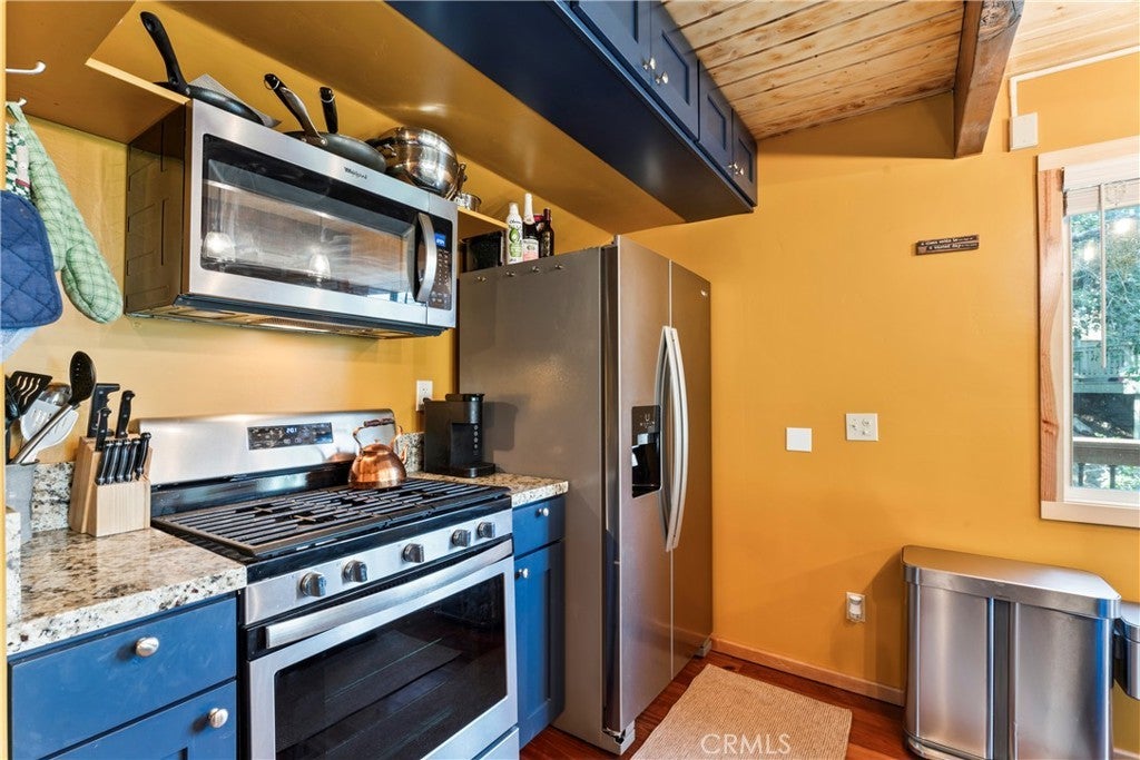 Perched on five spacious lots with sweeping views of the San Gabriel Mountains, this beautifully updated 3BR, 1.5BA home offers the perfect blend of mountain charm and modern upgrades. Originally a 2BR/1BA, the home underwent a complete transformation starting in 2018, taken down to the studs and rebuilt with a fully permitted renovation that added a third bedroom and a half bath. Spread across three levels, the thoughtful floor plan offers both privacy and flexibility, making it ideal for hosting family and friends. Throughout the home, you'll find rich Brazilian Cherry hardwood floors, tongue and groove wood ceilings with exposed beams, and new dual-pane windows and sliders that bring in abundant natural light. The main-level entry opens to a chef-style kitchen featuring a large center island, solid marble countertops, undermount stainless steel sink, solid wood cabinetry with soft-close drawers, stainless-steel appliances, and a breakfast bar. The adjacent dining area flows effortlessly into the living room, which is anchored by a wood-burning stove, a charming bay window, and access to the main deck, perfect for taking in the serene forest and mountain vistas. Also on the main floor is a convenient stackable laundry area. Upstairs, 2 bedrooms with vaulted ceilings, remote controlled ceiling fans, knotty Alder wood doors and trim, and a full bath with Italian porcelain tile and a deep soaking tub create a cozy retreat. The lower level hosts the 3rd bedroom and 1/2 bath, along with its own private deck and separate exterior access, an excellent option for guests or a rental setup. Additional features include new exterior paint, durable wood grain cement fiber siding, a tankless water heater, updated electrical and plumbing systems, central forced air heating, generous storage space with a raised platform in the build-up, and a separate sub-basement. Outside, you'll find concrete parking for three cars, stone steps leading to the front entrance, and a covered wood storage crib. Approximately 300 square feet of Trex decking with metal railing accents add to the outdoor appeal. Located on a paved, plowed, and maintained road with full conventional utilities, including gas, this turnkey home is bordered by a seasonal creek that flows through two of the five lots. Just minutes from Snow Valley Ski Resort, scenic hiking trails, and mountain fishing spots, this move-in-ready retreat is an ideal full-time home or weekend getaway.