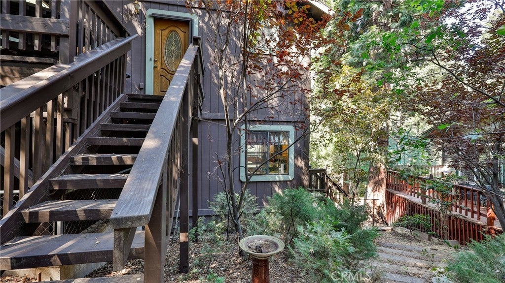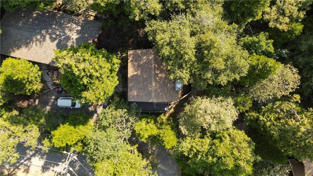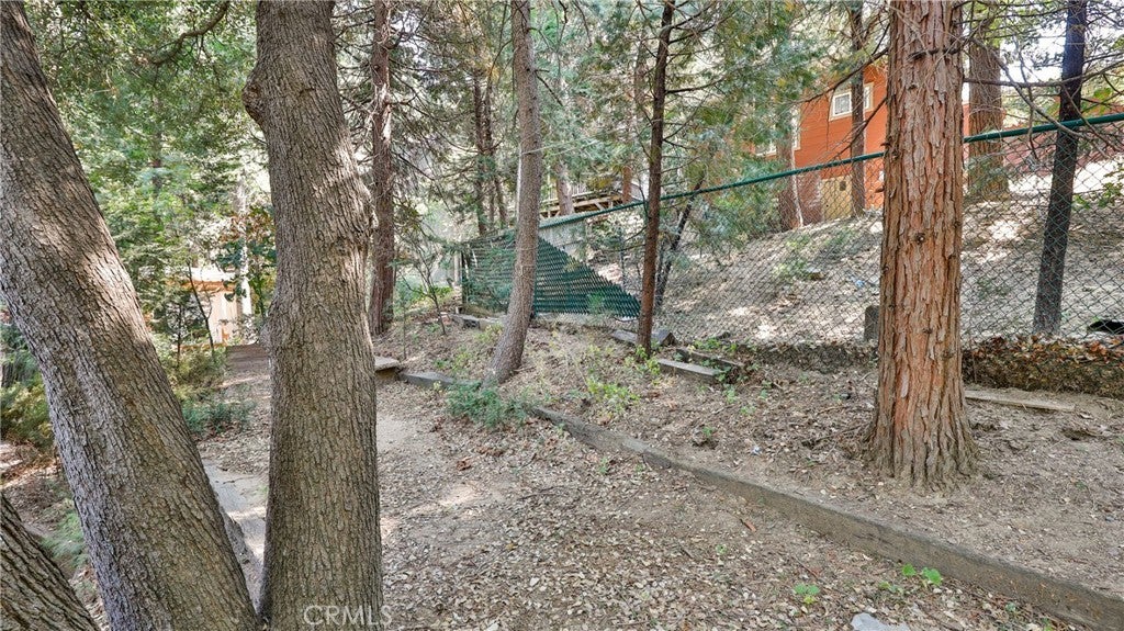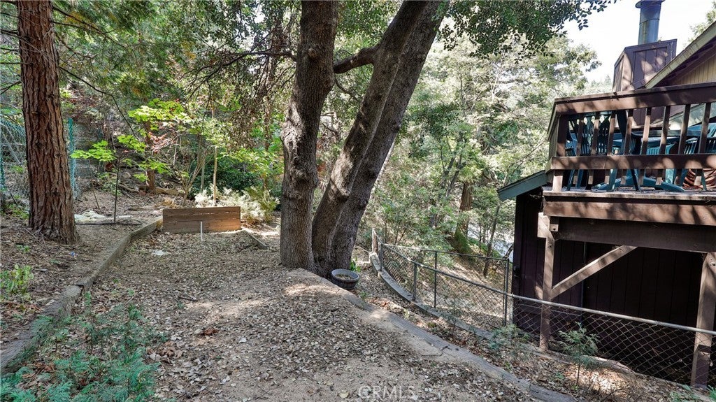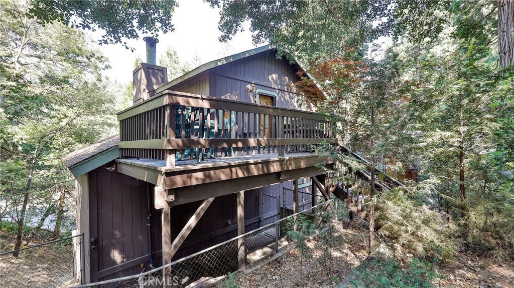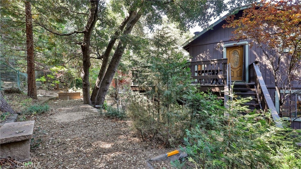 If you're seeking that perfect treehouse feel, this Cozy Cabin is an excellent match. Upon arrival, you'll drive up a gently sloped driveway that leads to a well-built set of cement stairs, offering easy access to this charming 3-bedroom, 1.5-bath property. The main level features a functional kitchen with ample cabinetry and plenty of prep space, making it a great fit for everyday cooking or weekend entertaining. Adjacent to the kitchen, the dining area includes a large set of windows that offer stunning views of the surrounding trees. The living room boasts open-beamed wood ceilings and a cozy fireplace, perfect for enjoying those colder winter evenings. Also on this level is a small bedroom, providing added convenience and flexibility. Head upstairs via a wide, solid wood staircase to find two additional bedrooms and a full bathroom, with one of the bedrooms offering direct access to the bath. Step out the back door to a spacious deck that overlooks a terraced yard. The outdoor area includes a horseshoe pit and a fenced section, perfect for pets.