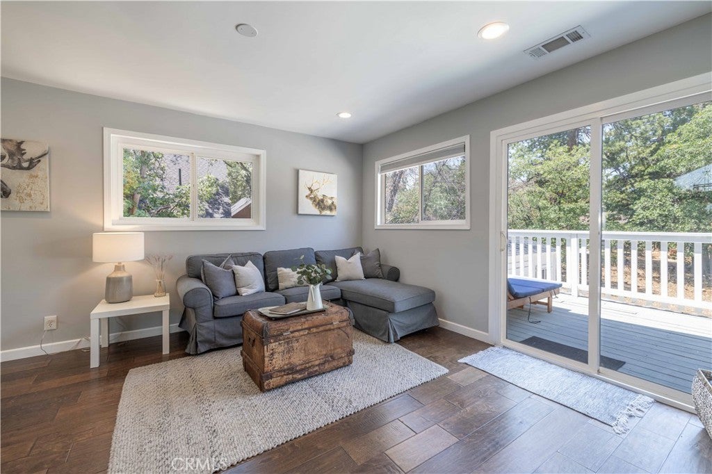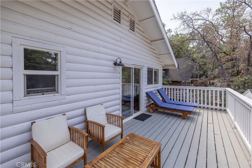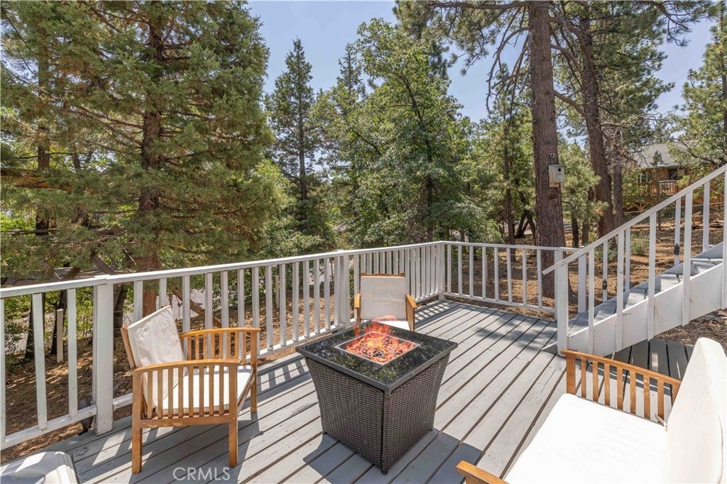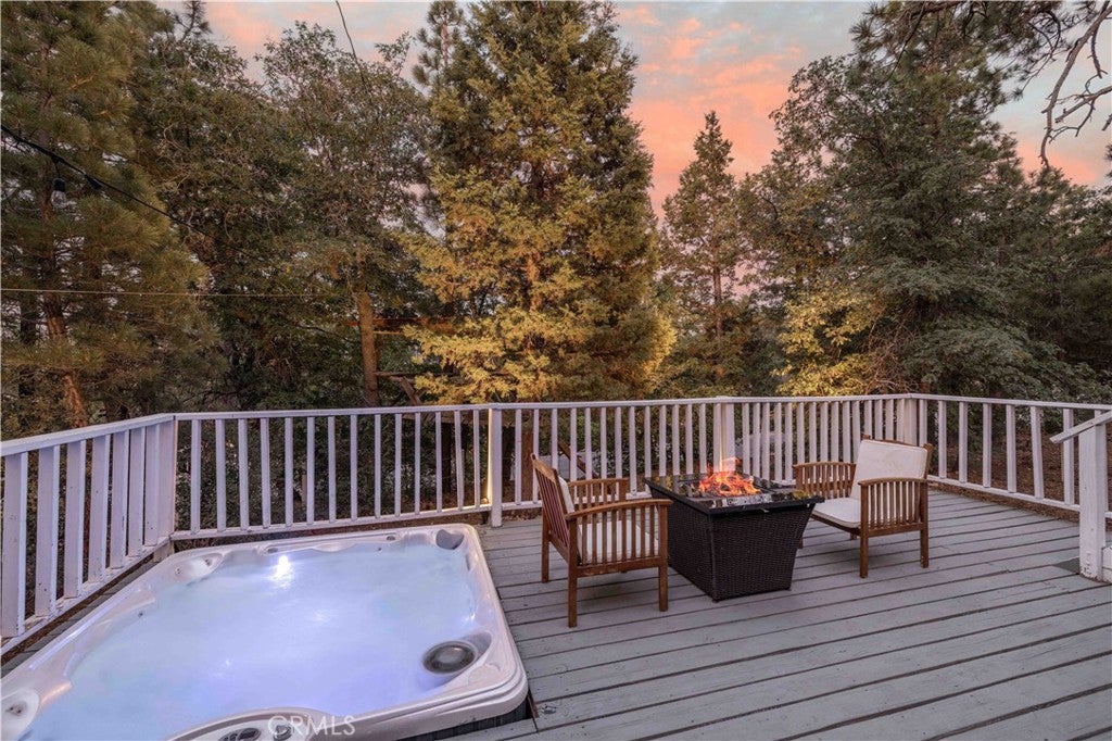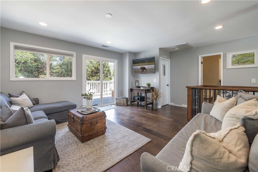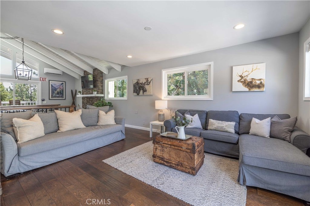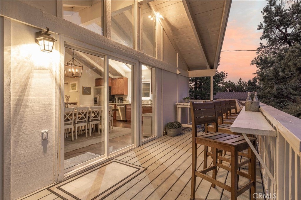 This bright and airy Moonridge home is perched above Big Bear in a quiet, well-treed neighborhood. The tasteful decor and neutral color palette provide a serene air of tranquility to this mountain getaway. The main floor of this reverse floorplan home is wide-open, with vaulted ceilings, dark wood floors, stone fireplace, mini-split air conditioner, fully-appointed kitchen, and lots of space for dining and entertaining and taking in the views from the two decks off each side of the home at this level. Downstairs, three cozy bedrooms, two full baths, heated laminate floors, and access to the large first floor deck with sunken spa provide easy access to comfort, outdoor dining, and social spaces. This home has been operated as a vacation rental, and is outfitted for groups and families, but would also make a great full-time residence or part-time home. This property is located near the Bear Mountain side of the resort, and just a short drive to dining, activities, events, as well as the Lake and Village.