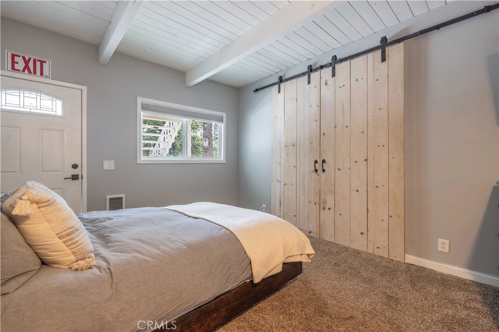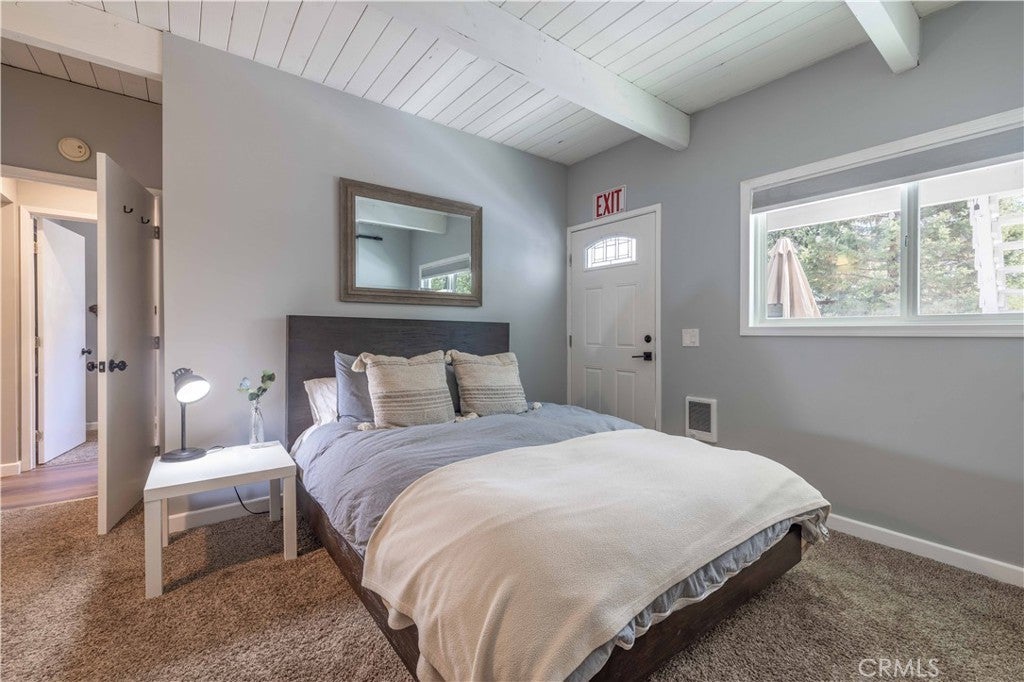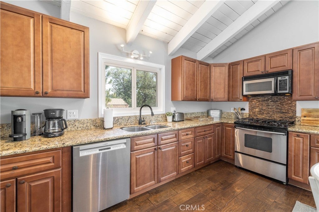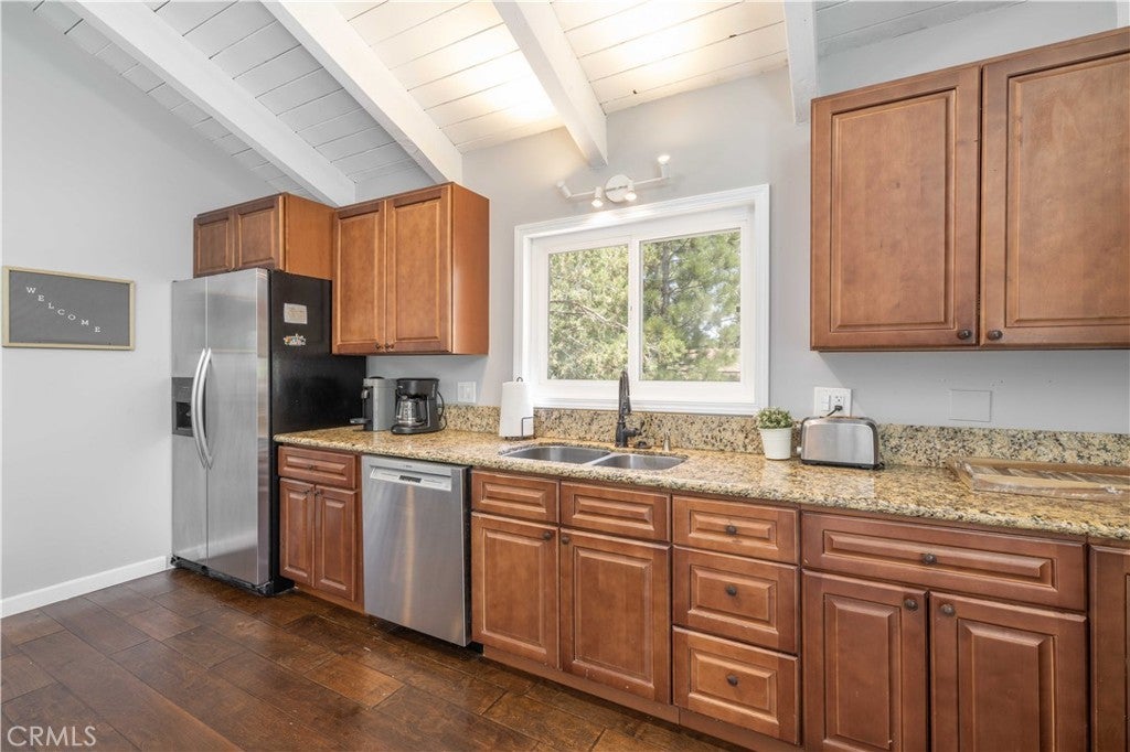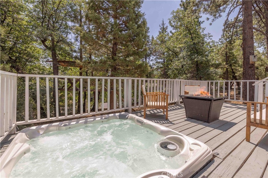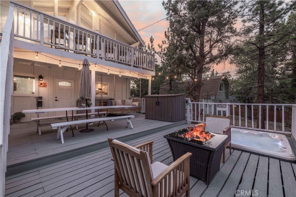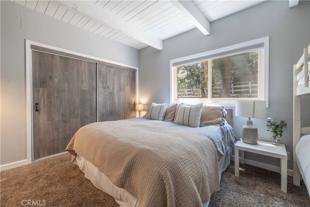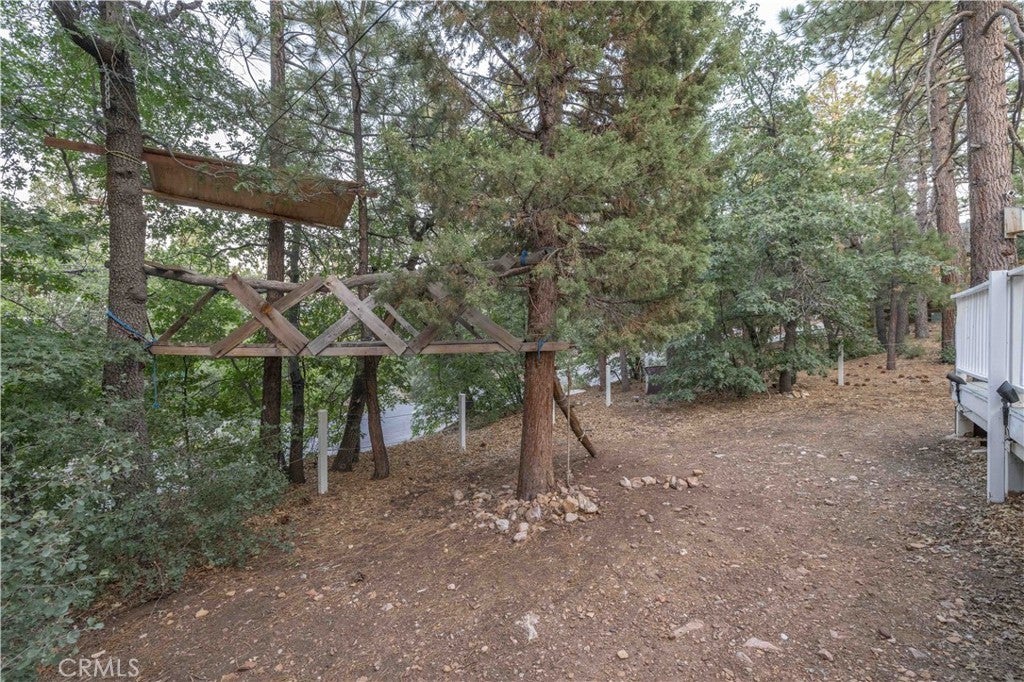 This bright and airy Moonridge home is perched above Big Bear in a quiet, well-treed neighborhood. The tasteful decor and neutral color palette provide a serene air of tranquility to this mountain getaway. The main floor of this reverse floorplan home is wide-open, with vaulted ceilings, dark wood floors, stone fireplace, mini-split air conditioner, fully-appointed kitchen, and lots of space for dining and entertaining and taking in the views from the two decks off each side of the home at this level. Downstairs, three cozy bedrooms, two full baths, heated laminate floors, and access to the large first floor deck with sunken spa provide easy access to comfort, outdoor dining, and social spaces. This home has been operated as a vacation rental, and is outfitted for groups and families, but would also make a great full-time residence or part-time home. This property is located near the Bear Mountain side of the resort, and just a short drive to dining, activities, events, as well as the Lake and Village.
