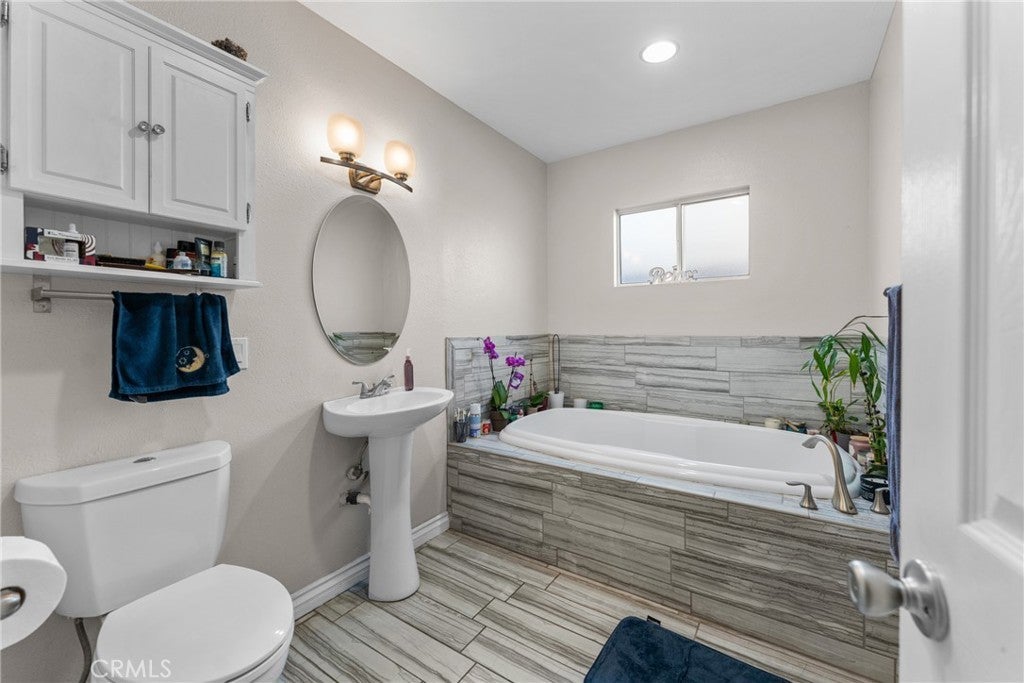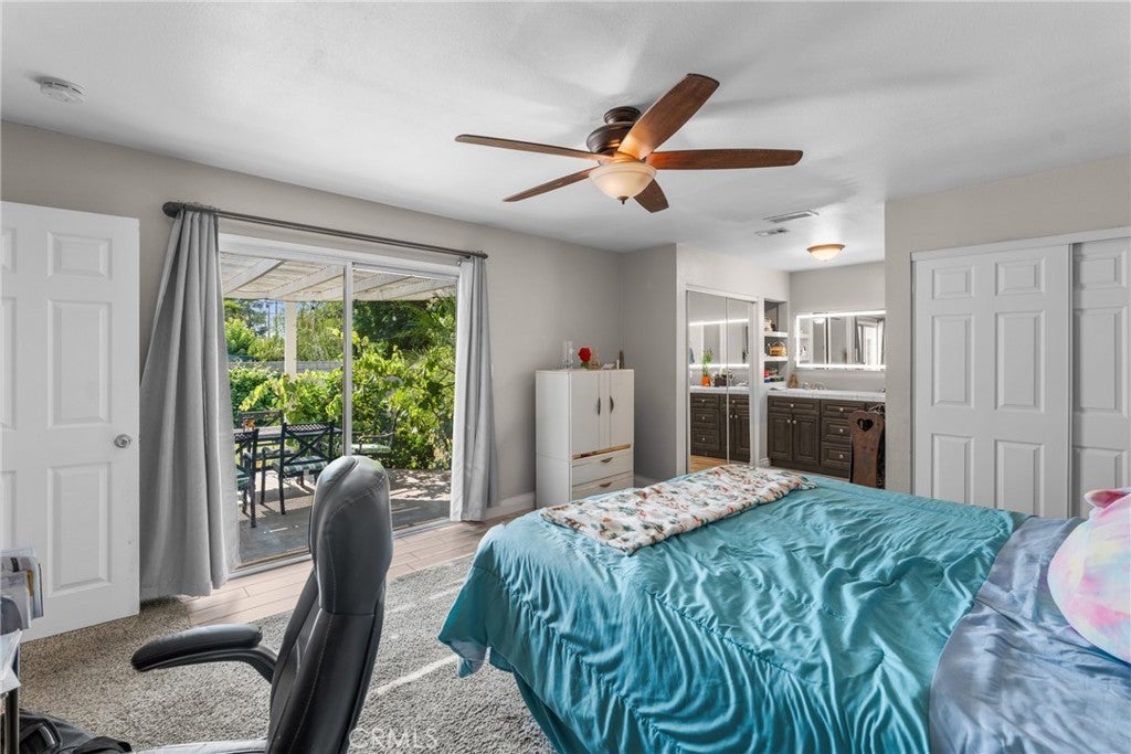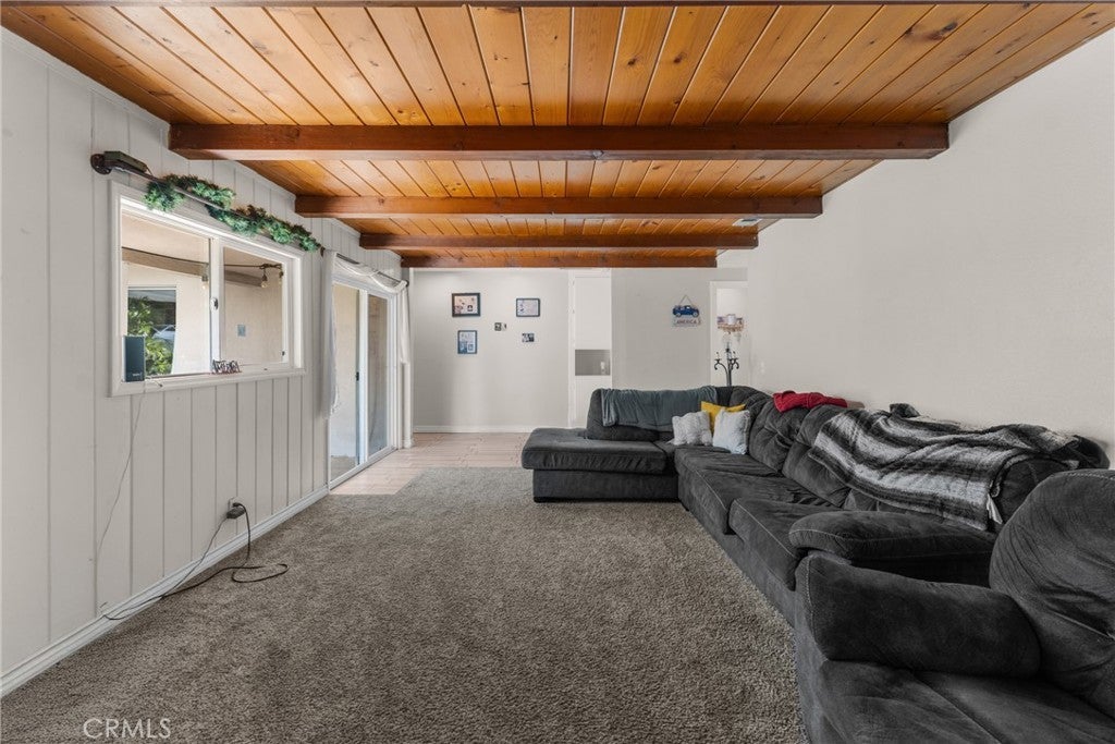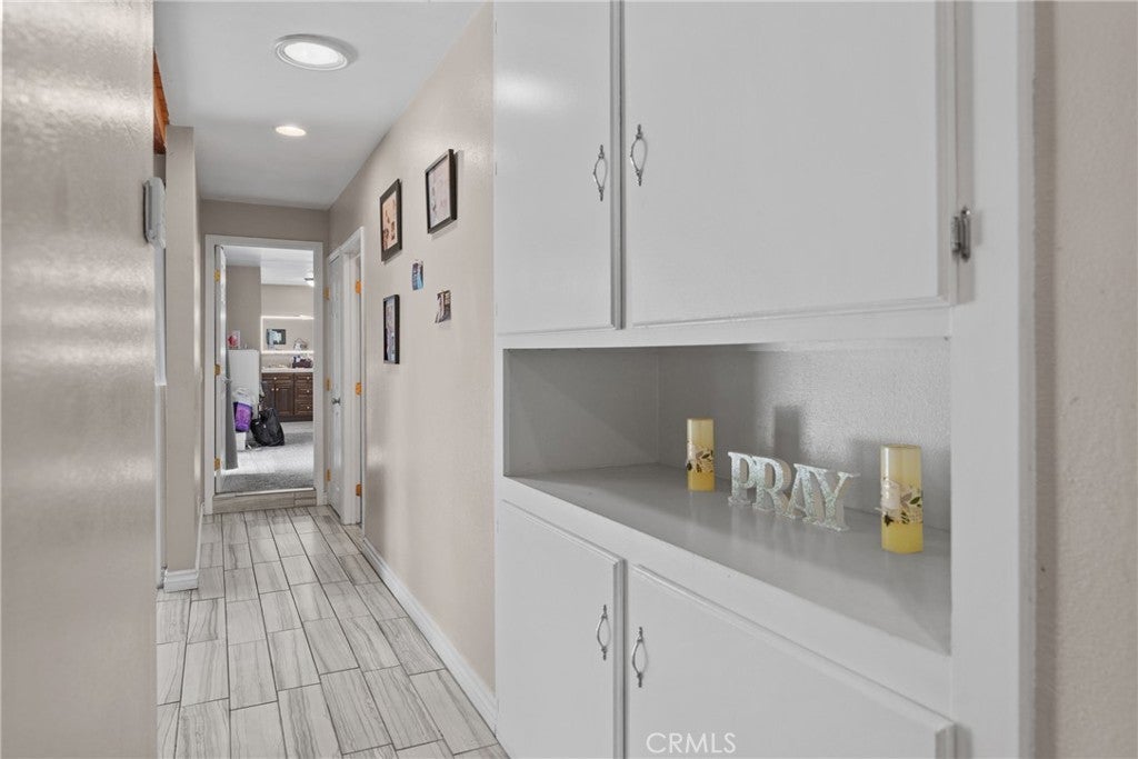 Nestled in a peaceful cul-de-sac in Yucaipa, this home is thoughtfully updated with modern upgrades. The kitchen showcases elegant gray cabinetry, quartz countertops, and sleek tile flooring, with stainless steel appliances. The inviting living room features stunning wood-beamed ceilings and a cozy wood-burning fireplace. The spacious layout includes a large primary suite with dual closets offering its own private en-suite bathroom, a second bedroom with its own private bathroom and a third full bath complete with a luxurious soaking tub. Enjoy indoor-outdoor flow with sliding glass doors from both the living room and primary suite opening to a serene back patio and lush, private yard, perfect for morning coffee or evening gatherings. Additional highlights include a drive-through garage with direct access to the backyard, perfect for entertaining or accommodating recreational needs. A great home for entertaining and gathering with friends and family!